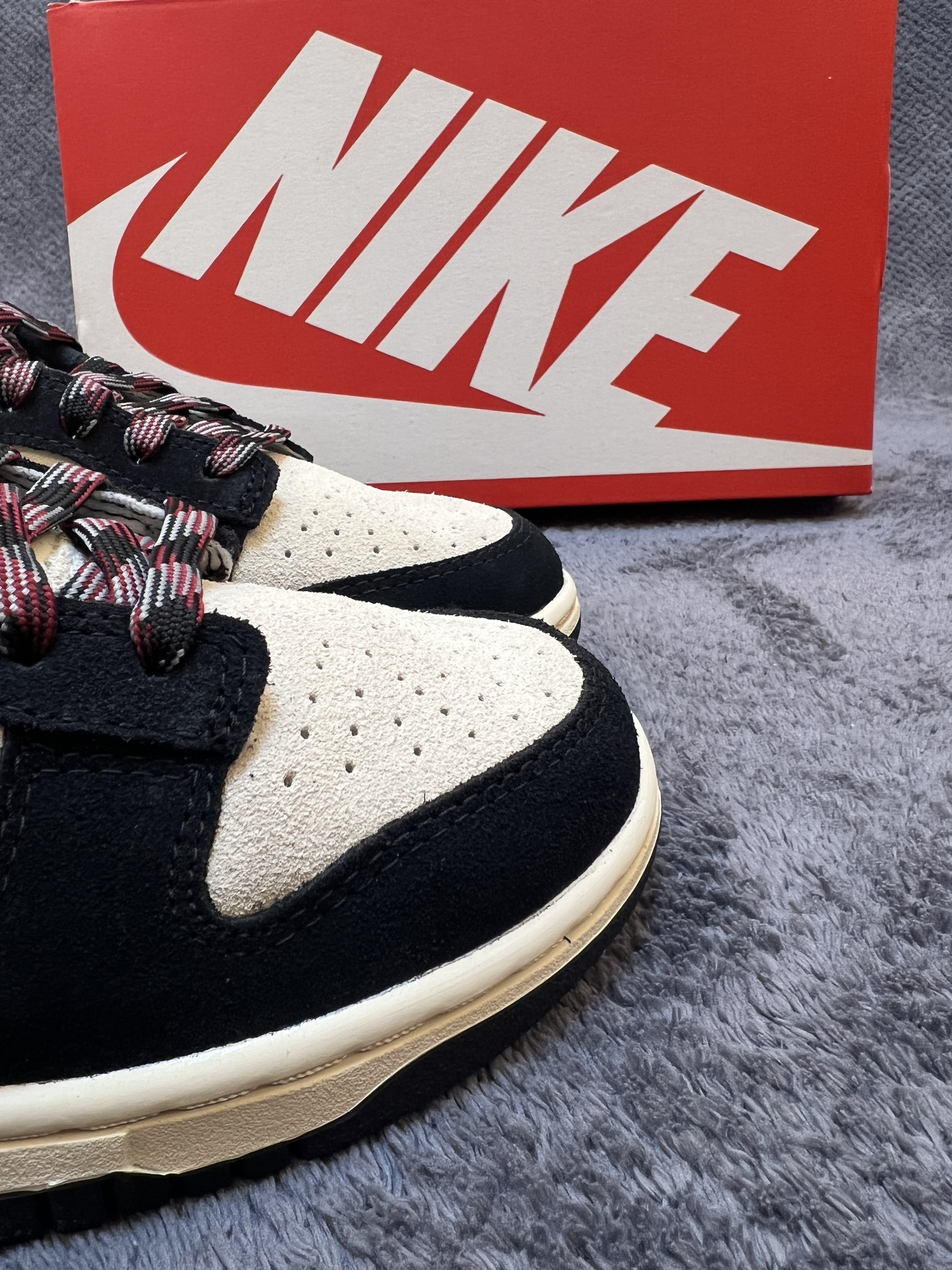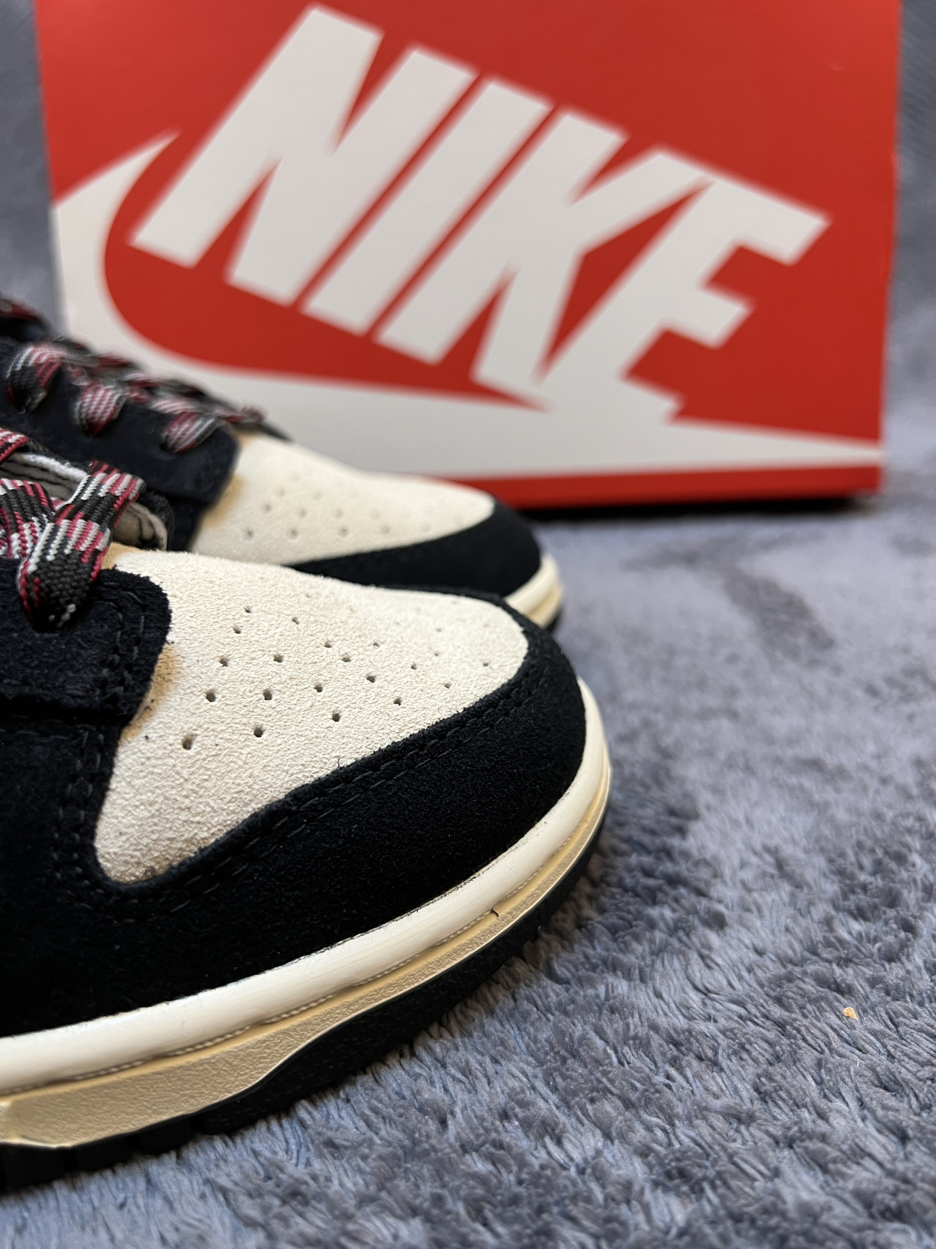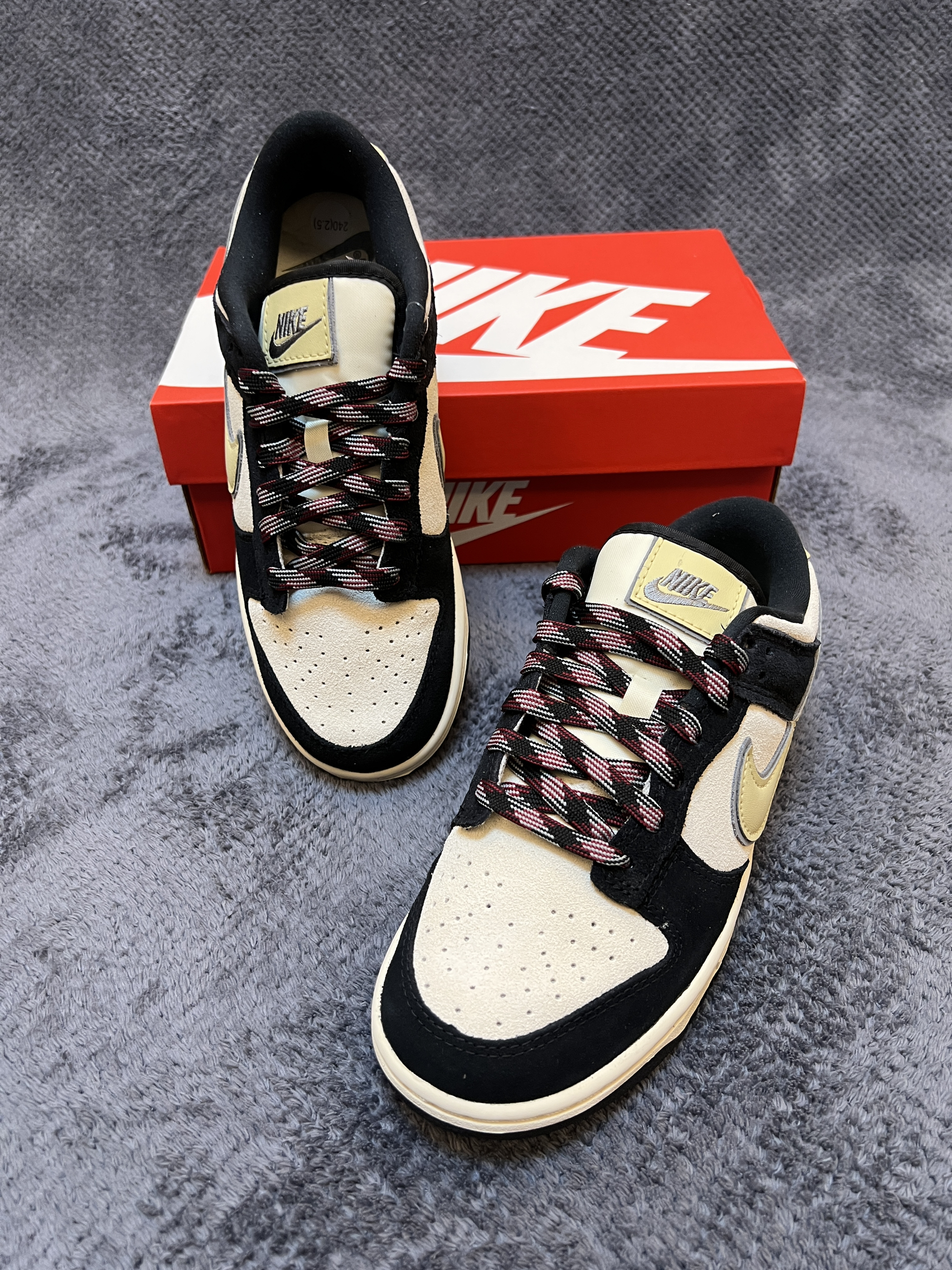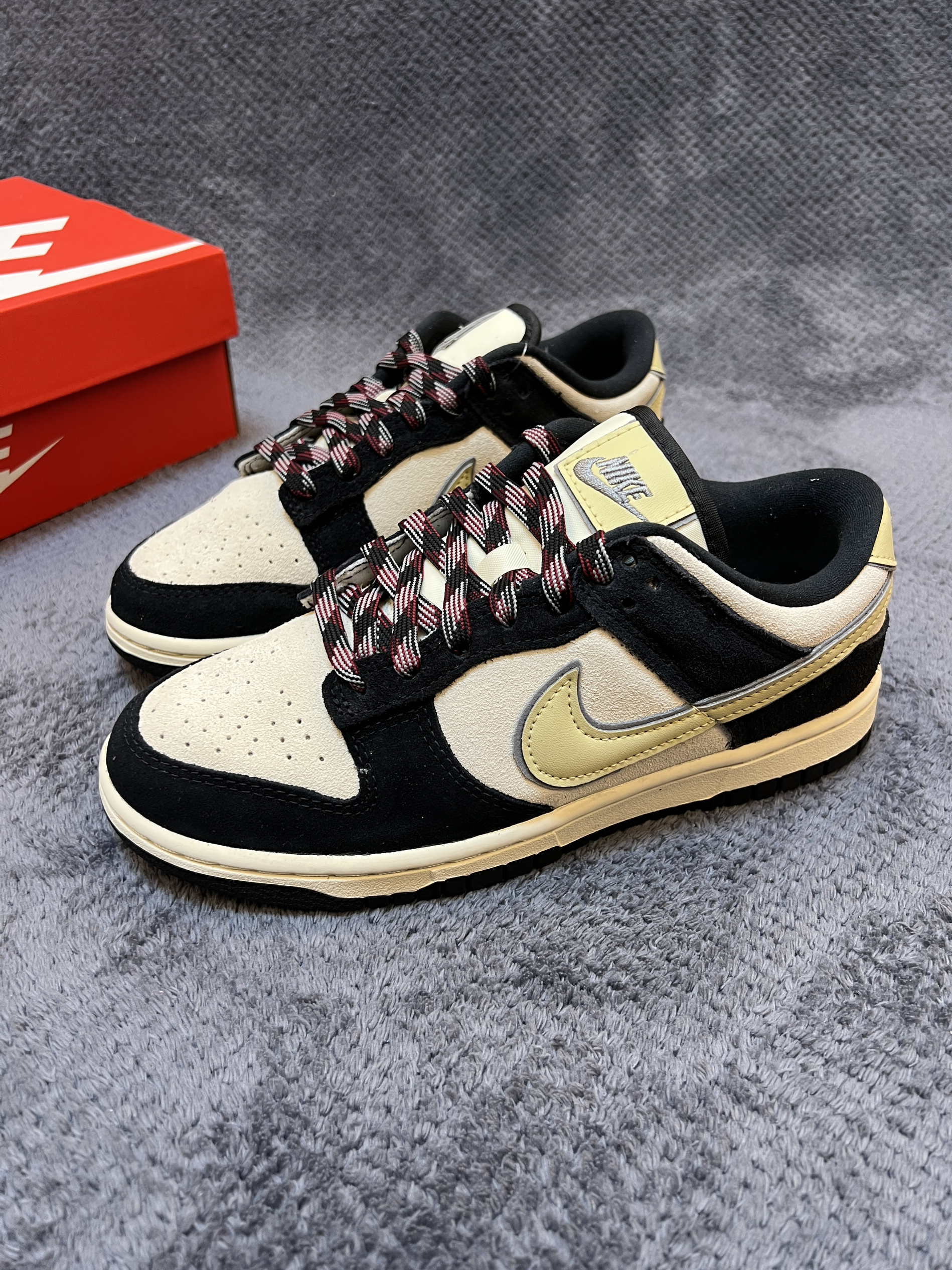 🤔🤔🤔又是一双百搭dunk,质感还很不错 🍀🍀🍀这双奶黑熊猫dunk配色上鞋面为米白色,框架为黑色。侧面swoosh为淡黄色延伸到后跟。中底米黄,大底黑色。配色好看,上脚百搭 🍀🍀🍀材质方面:鞋身以牛皮革材质为主,做成了麂皮状。上脚舒适有质感。不过麂皮材质在打理方面不如皮革,特殊天气穿搭需注意。脚感方面无特殊,就是普通dunk脚感 🍀🍀🍀尺码方面:dunk鞋型板正,不偏码,正码购买就行