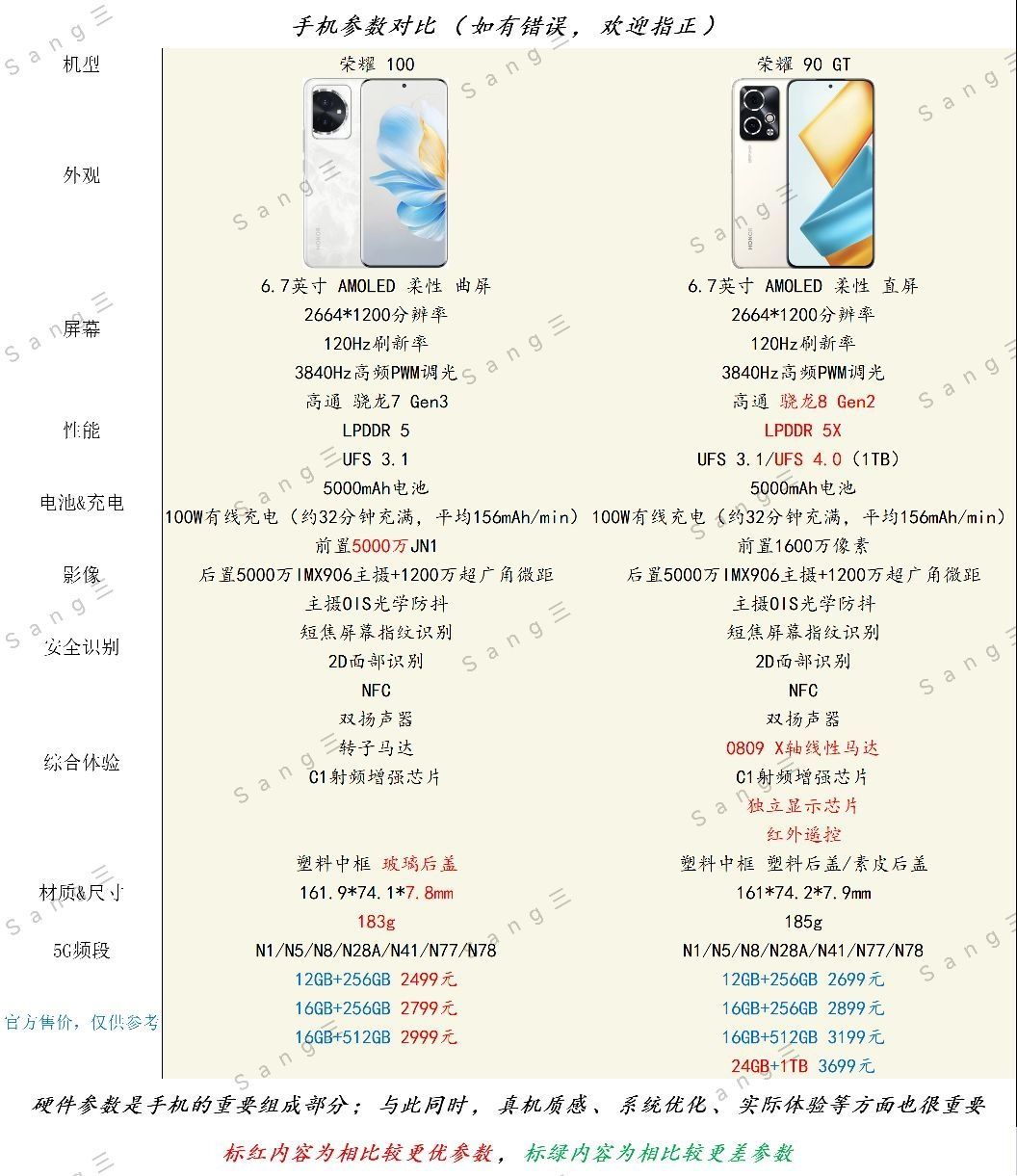 ☞#手机对比# ——100🆚90 GT☜ 【#荣耀100# 】 更好的前置相机、更好的后盖材质、更薄及更轻的机身、更低的官方售价…… 【#荣耀90GT# 】 更出色的处理器、更快的内存及储存规格、X轴线性马达、独立显示芯片、红外遥控、更大的内存及储存版本…… 【二者的相同之处】 屏幕尺寸及材质、柔性屏幕、分辨率及刷新率、高频PWM调光、电池容量、充电速度、后置主摄及超广角微距镜头、防抖水平、...