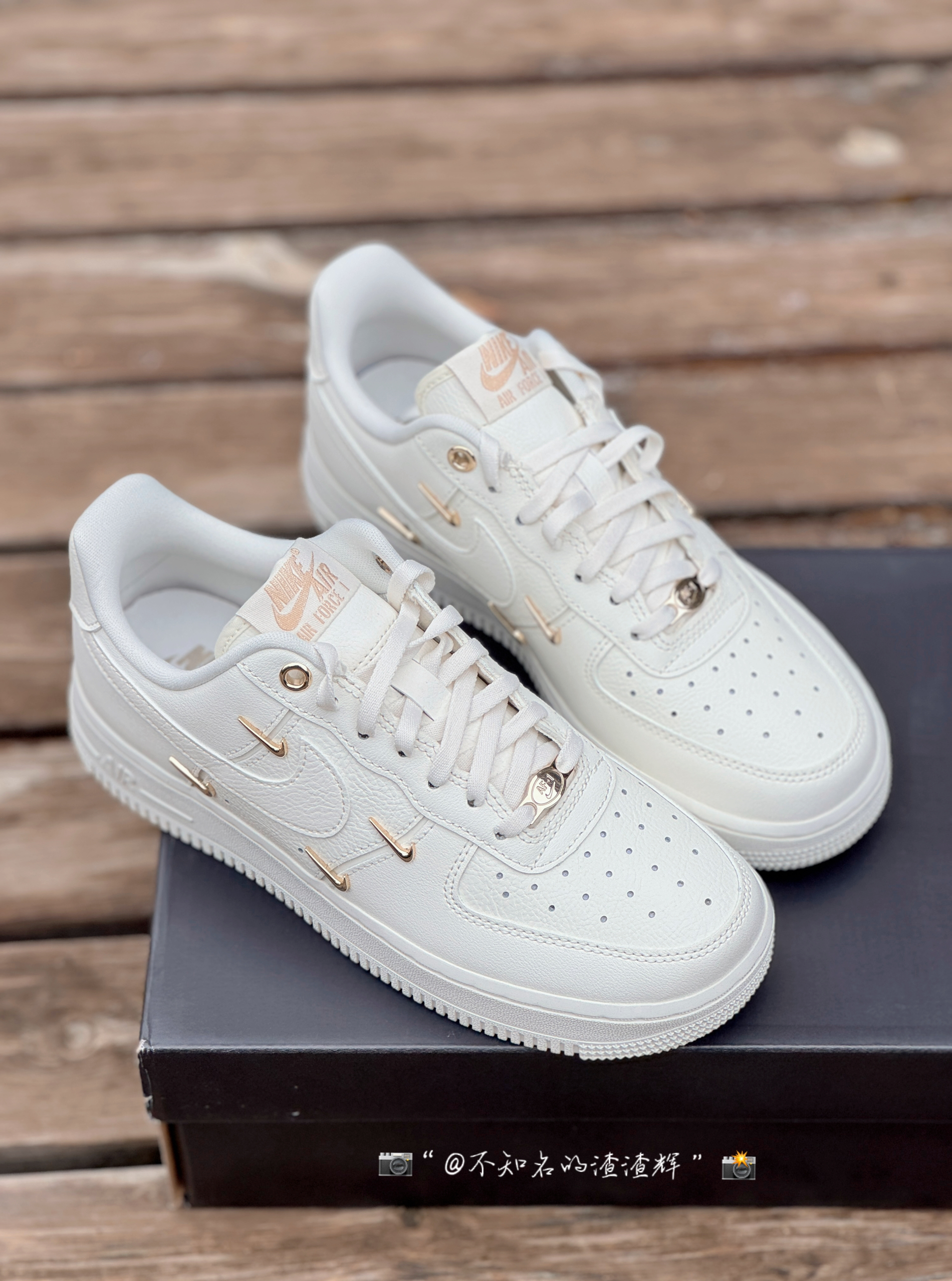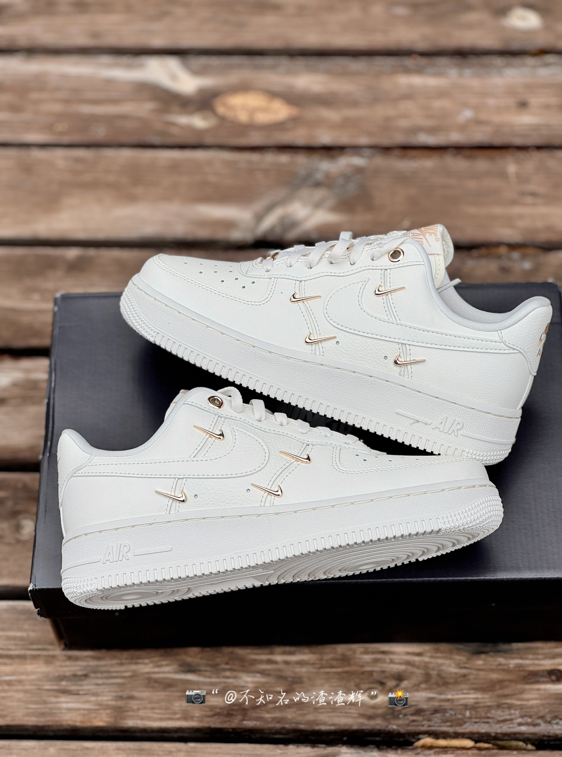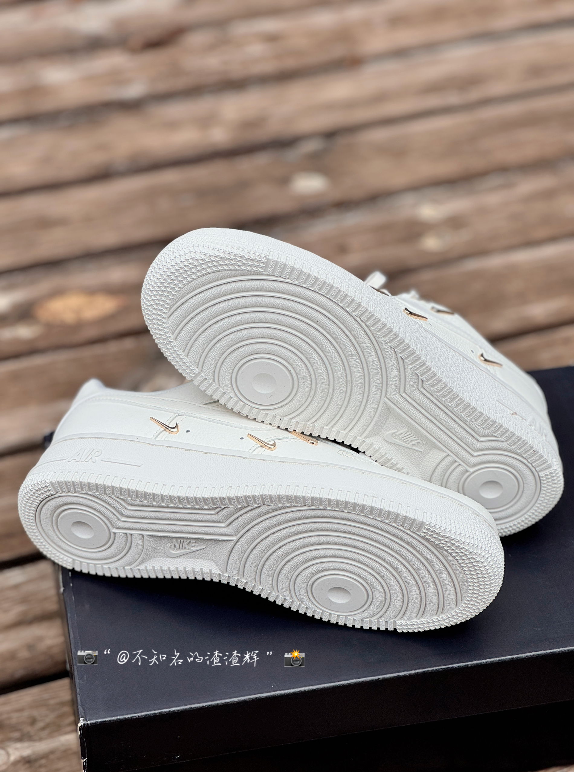 💯:Nike Air Force 1 Low Mini Gold 防滑耐磨 低帮板鞋 女款 白金 💯:这双鞋子整体以白色为主色调,金色加以点缀,很好看的配色,鞋面采用优质皮革材质,质感细腻舒适,鞋头出气孔设计适合四季穿的款式,鞋侧多个金色Swoosh是我入手这双鞋子的主要原因,中底Air Sole气垫为鞋子提供舒适脚感 💯:个人很喜欢的一款空军一号,百搭好穿的款式 💯:尺码推荐:建议买小半码