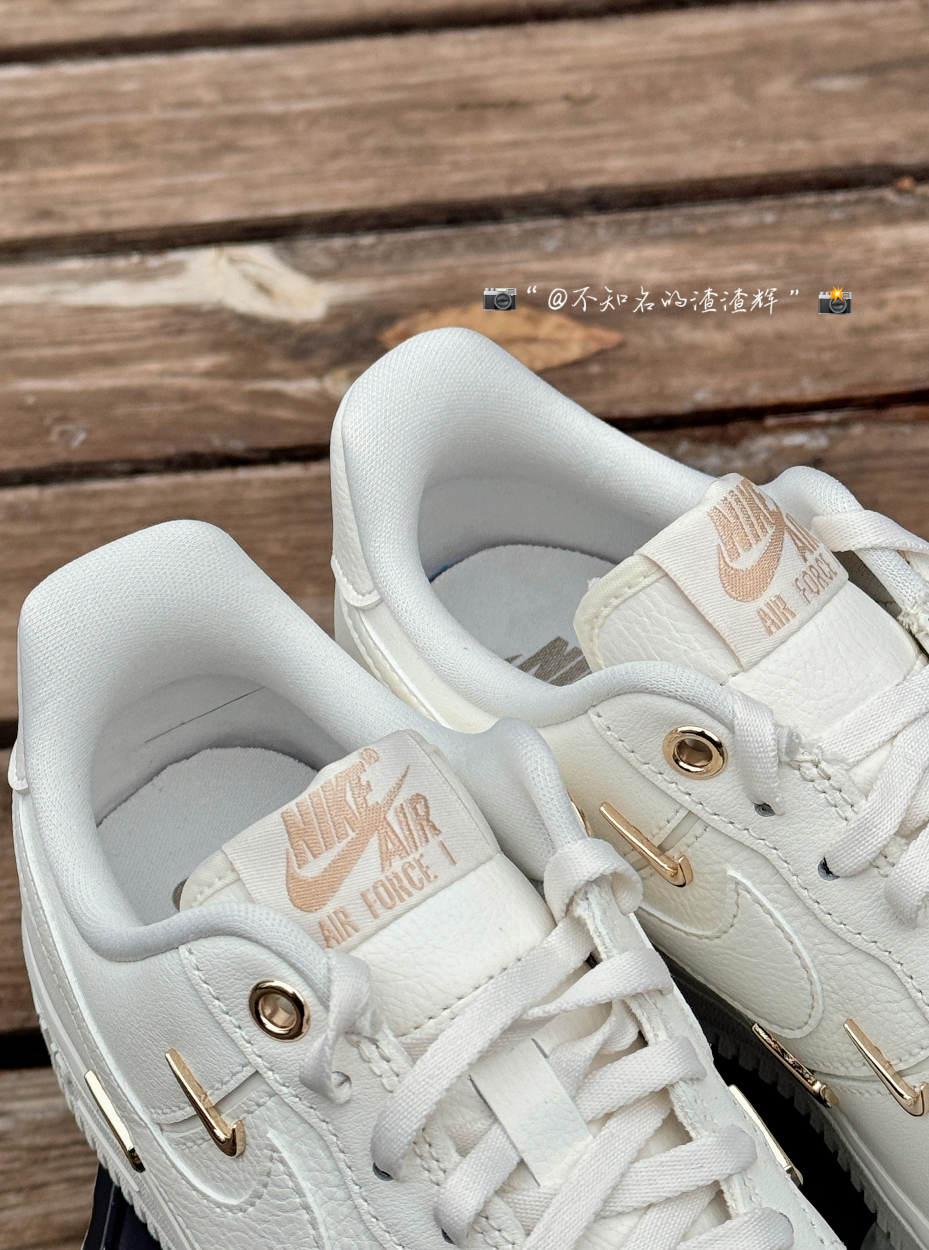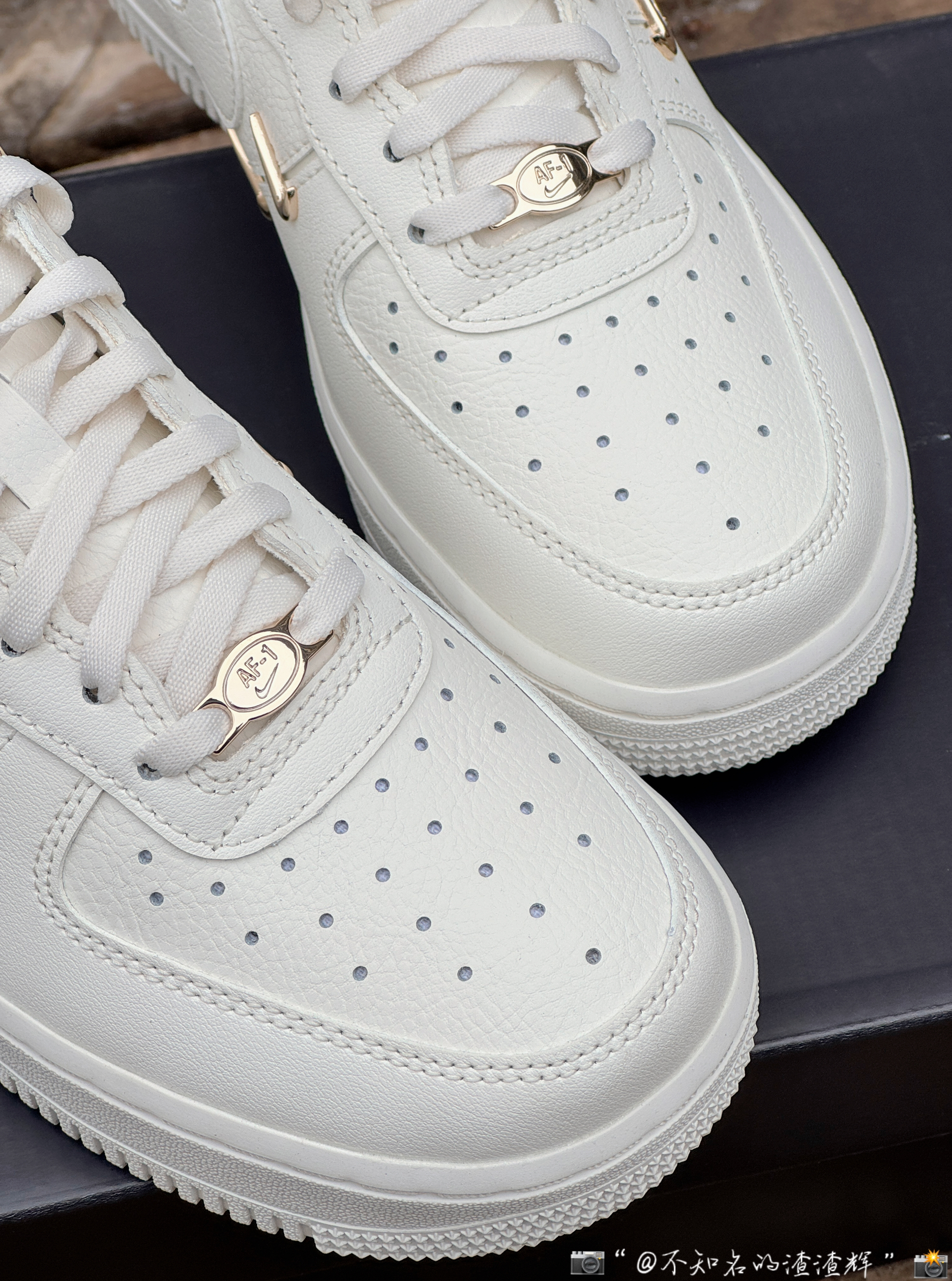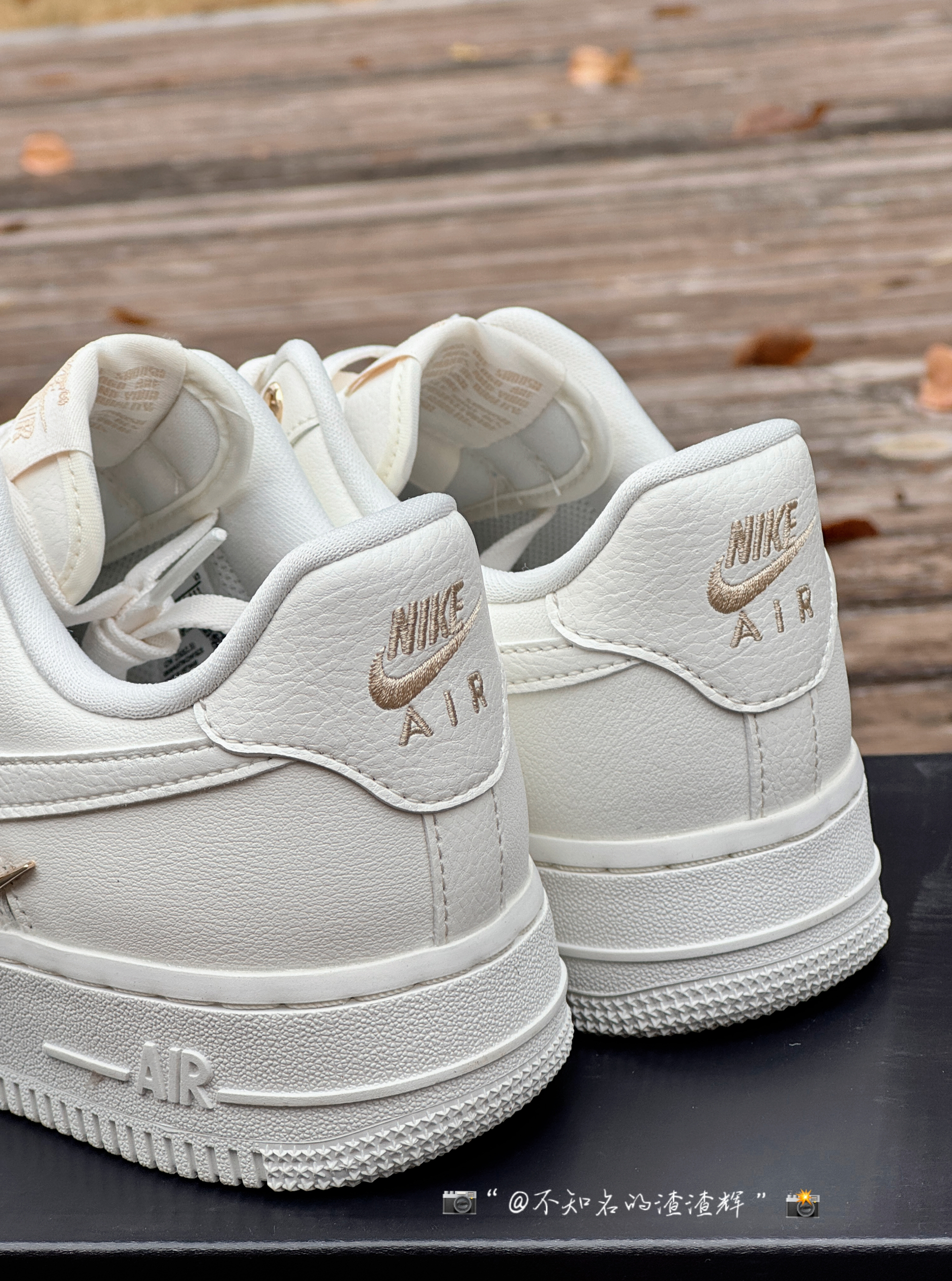 💯:Nike Air Force 1 Low Mini Gold 防滑耐磨 低帮板鞋 女款 白金 💯:这双鞋子整体以白色为主色调,金色加以点缀,很好看的配色,鞋面采用优质皮革材质,质感细腻舒适,鞋头出气孔设计适合四季穿的款式,鞋侧多个金色Swoosh是我入手这双鞋子的主要原因,中底Air Sole气垫为鞋子提供舒适脚感 💯:个人很喜欢的一款空军一号,百搭好穿的款式 💯:尺码推荐:建议买小半码