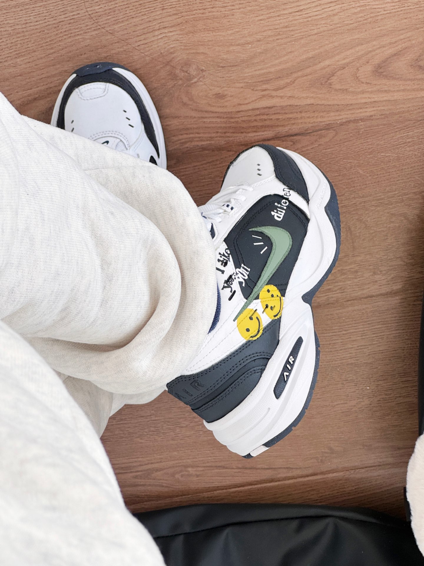 给自己买的过年鞋子就是这双啦 有复古气息的老爹鞋 色系偏向藏蓝色~ 侧面是涂鸦笑脸设计 很可爱,上脚也很百搭 增高设计也很喜欢~ 搭配裤子也不挑版型,很喜欢呢~