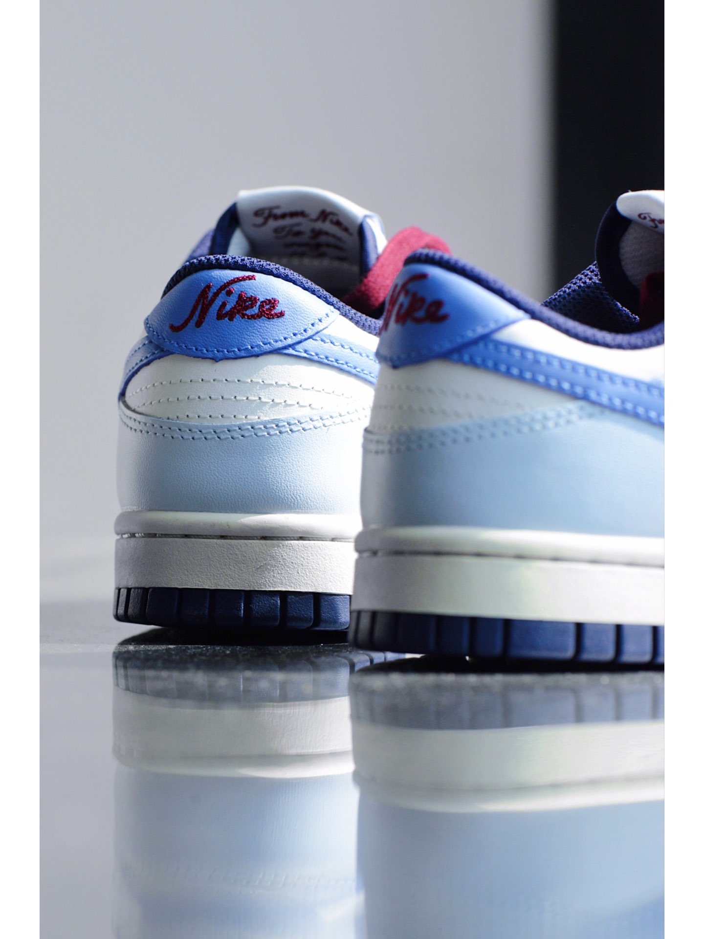 此款 WMNS Nike Dunk Low “From Nike, To You” 以优质皮革与百搭配色,低调有型,轻松为全身行头加分。鞋款采用米白色调皮革为基底,以海蓝色调皮革为覆面构建鞋身。鞋带、后跟 Nike 刺绣以及鞋舌标签内侧「From Nike, To You」字样,均以酒红色调点缀,多彩构建带来视觉冲击。最后搭配轻微泛黄的做旧下过中底和午夜蓝色外底,完善整鞋设计。 #Nike #du...