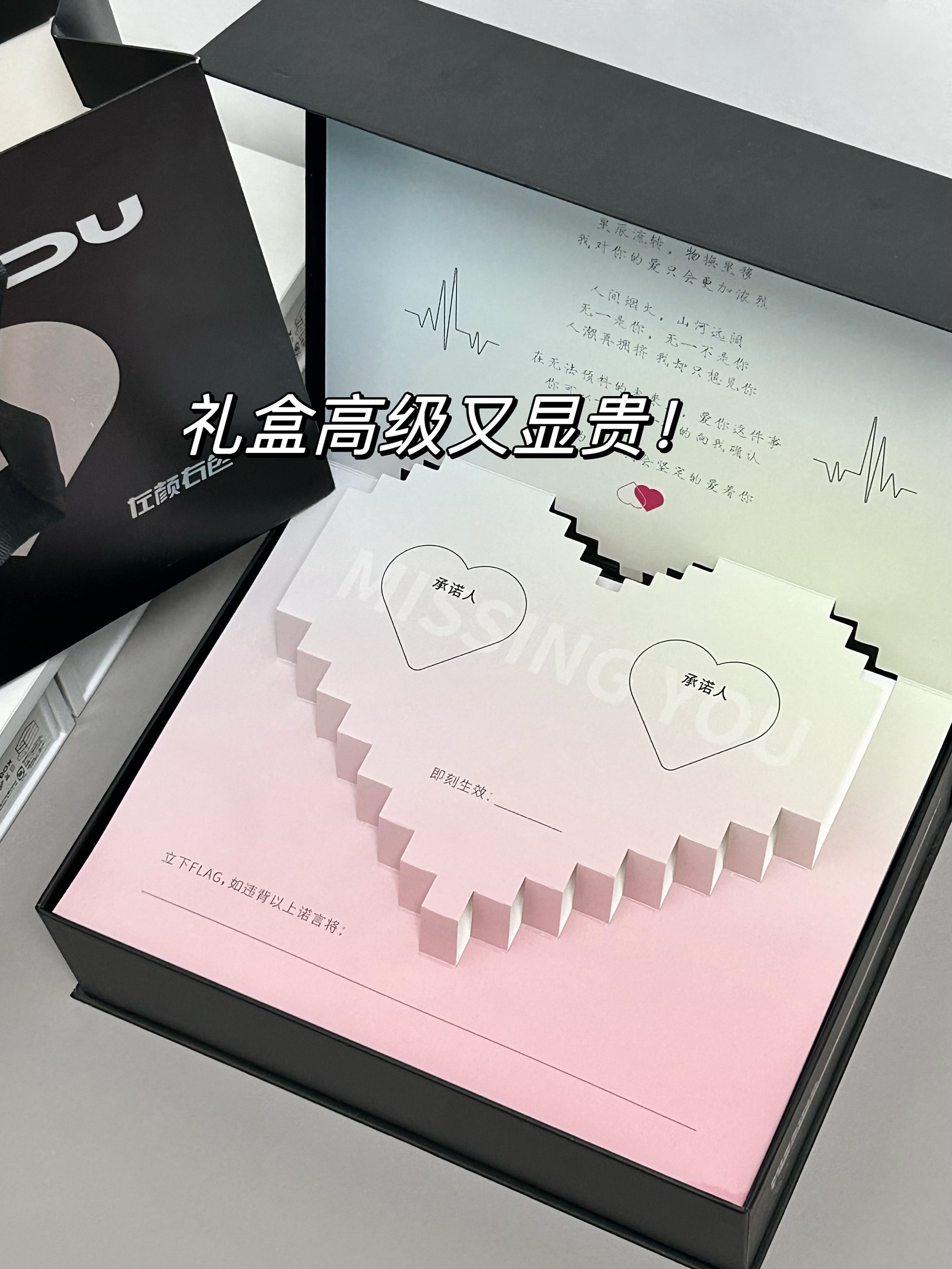 挑了好久的礼物 最后还是决定选了左颜右色的这套护肤礼盒~ 礼盒有水乳➕洗面奶➕香薰➕香水 男孩子平时也臭美 所以这一套下来实用又浪漫🌹 还有一张PLUS版的承诺书 签订俩人的爱情协议 满满的仪式感💕
