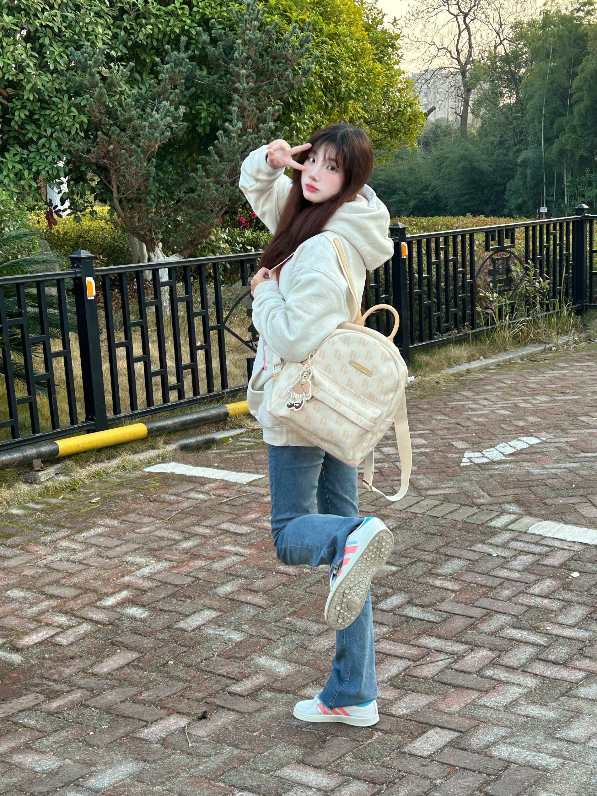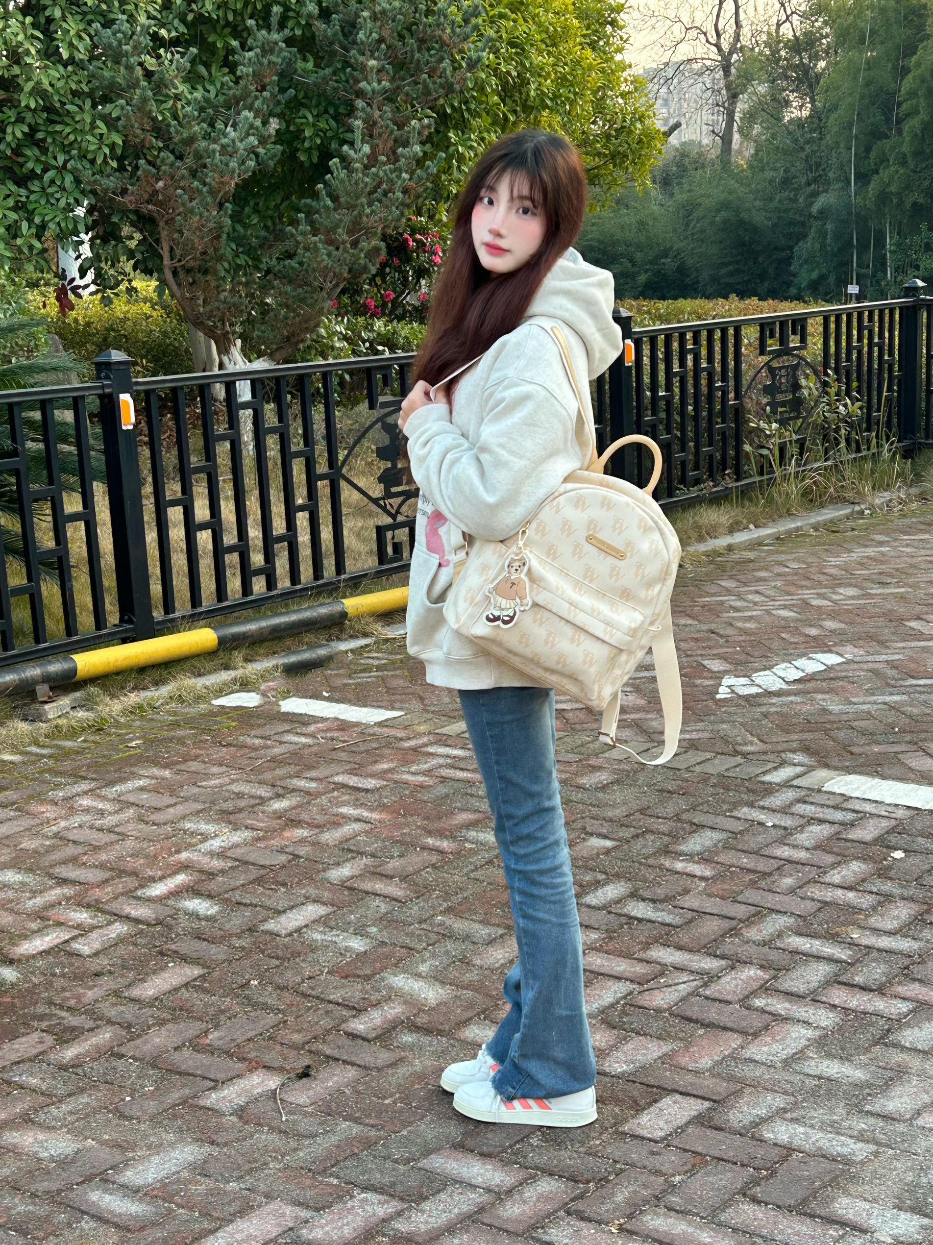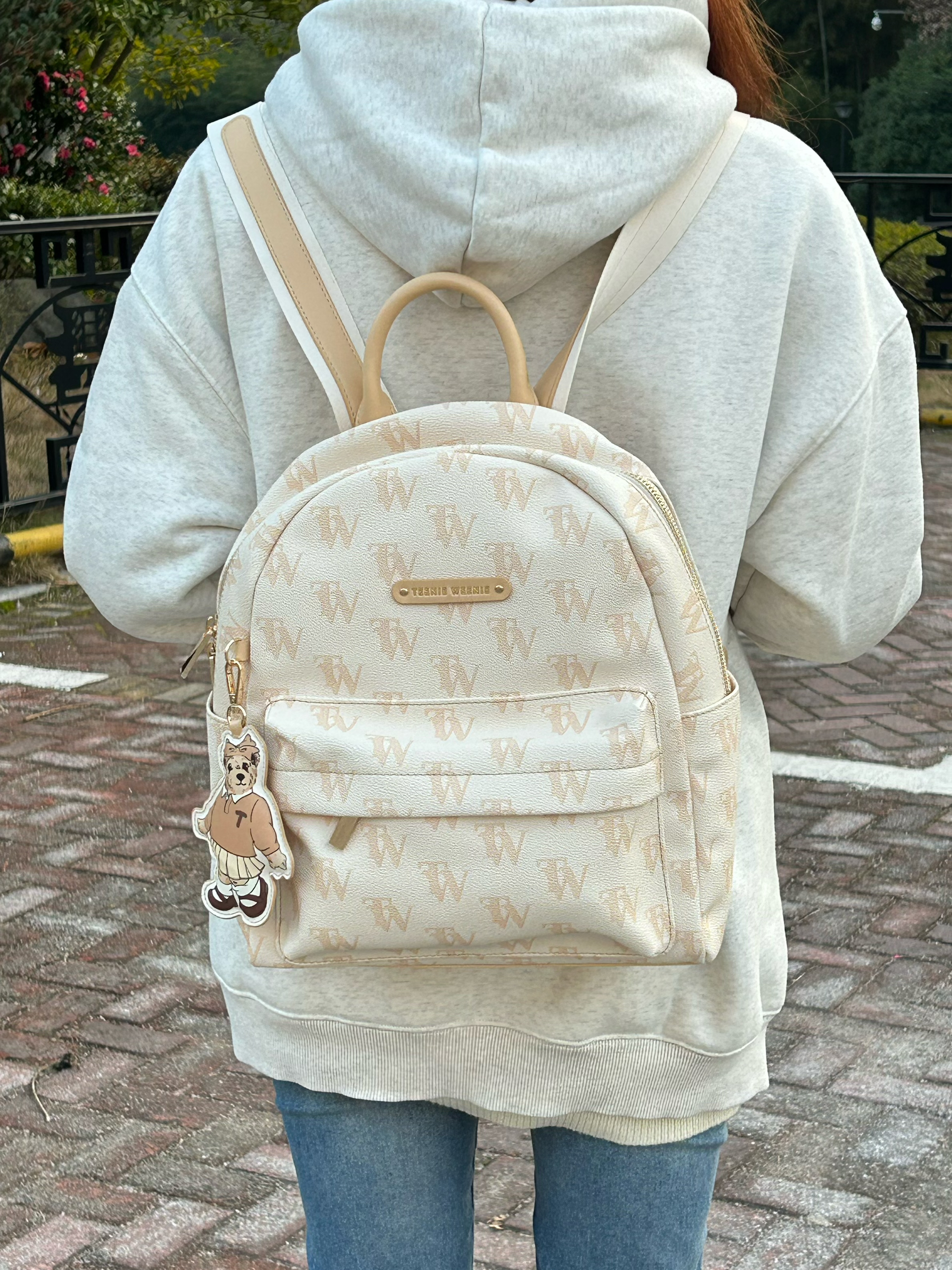 今天穿什么 今天穿 米白色卫衣 ➕ 牛仔裤 ➕ Teenie Weenie 休闲可爱小熊🐻包包 这款包包为通勤学院风呀 可爱奶呼呼小熊双肩包!嘿嘿 上面是杏色 带🈶印花的logo 还送了一个小熊的配套挂件 显得超可爱呀 而且包包容量不小 超适合学生党呀 新年快get起来