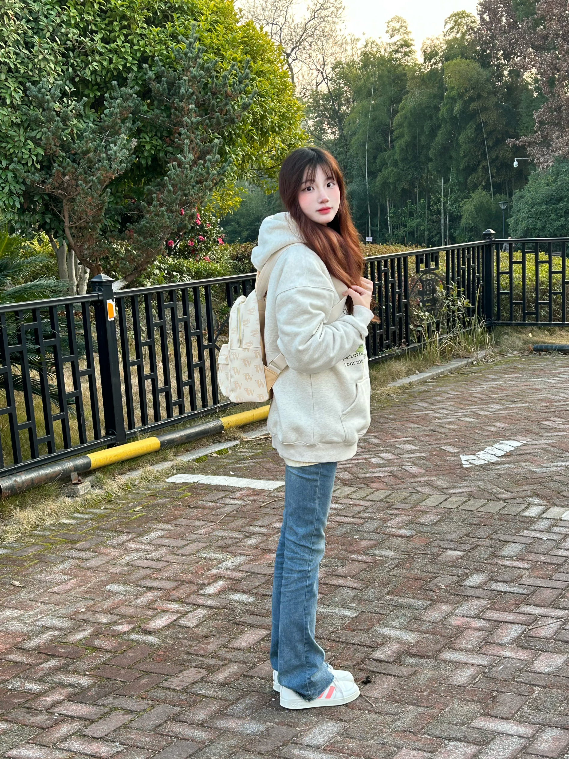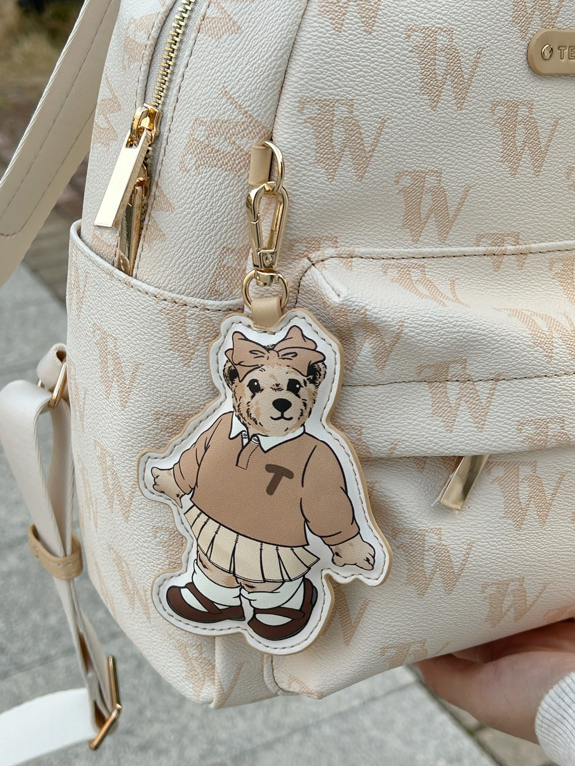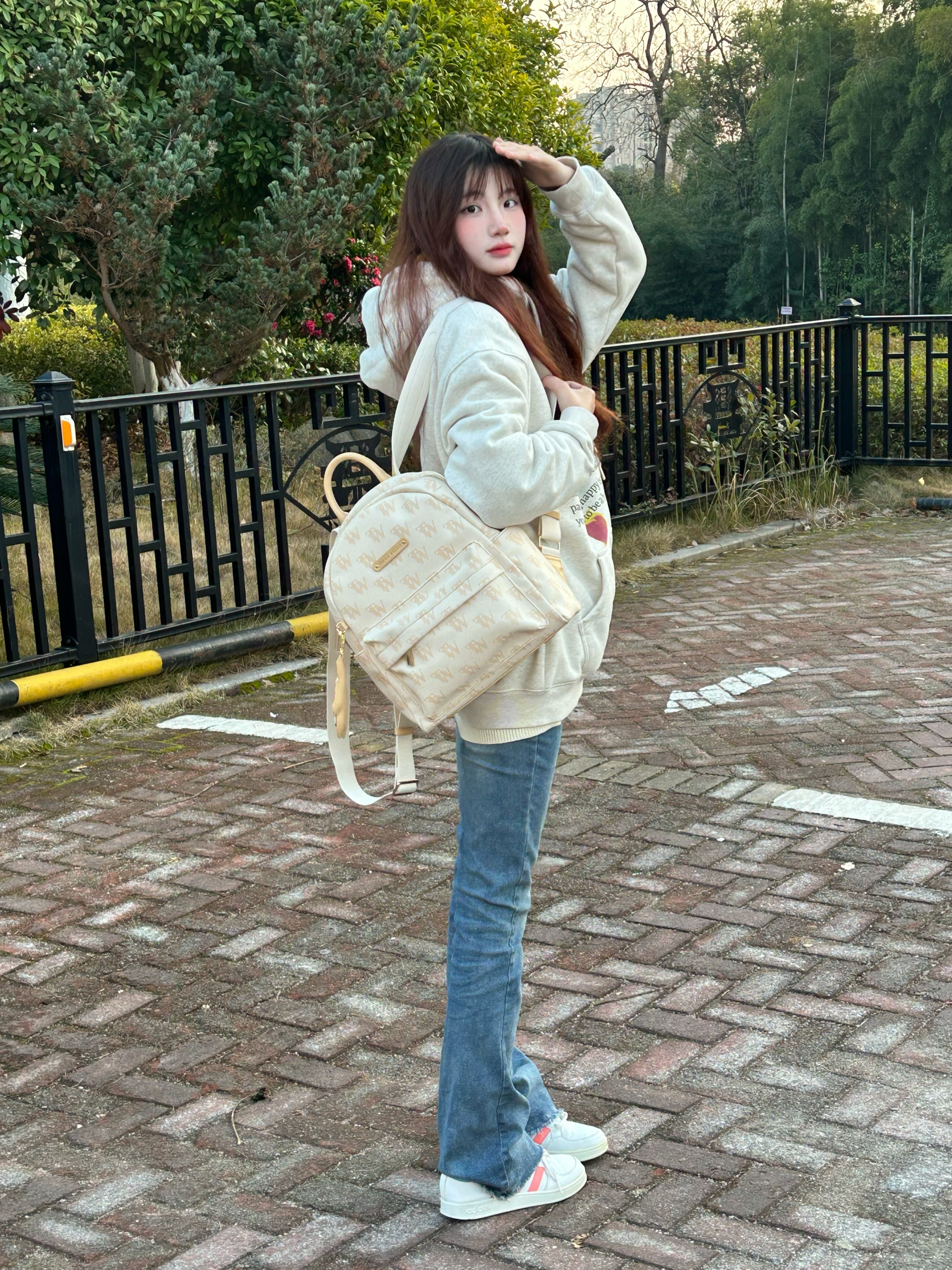 今天穿什么 今天穿 米白色卫衣 ➕ 牛仔裤 ➕ Teenie Weenie 休闲可爱小熊🐻包包 这款包包为通勤学院风呀 可爱奶呼呼小熊双肩包!嘿嘿 上面是杏色 带🈶印花的logo 还送了一个小熊的配套挂件 显得超可爱呀 而且包包容量不小 超适合学生党呀 新年快get起来