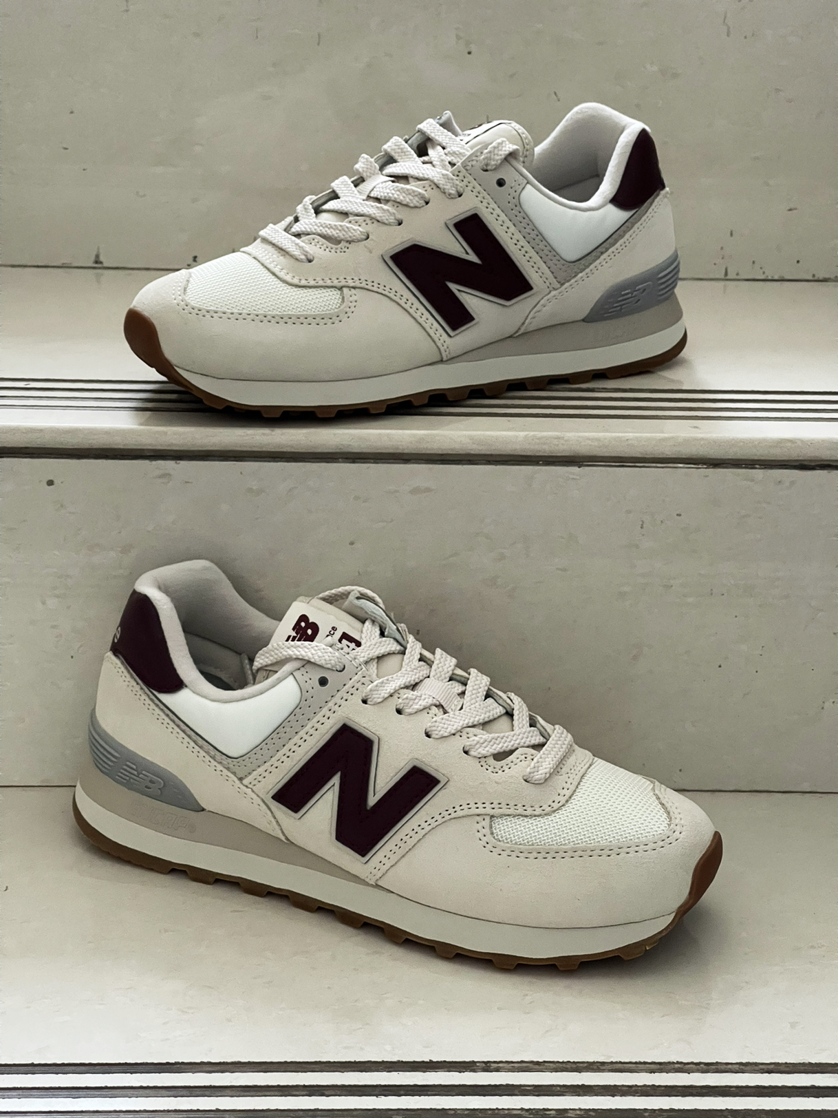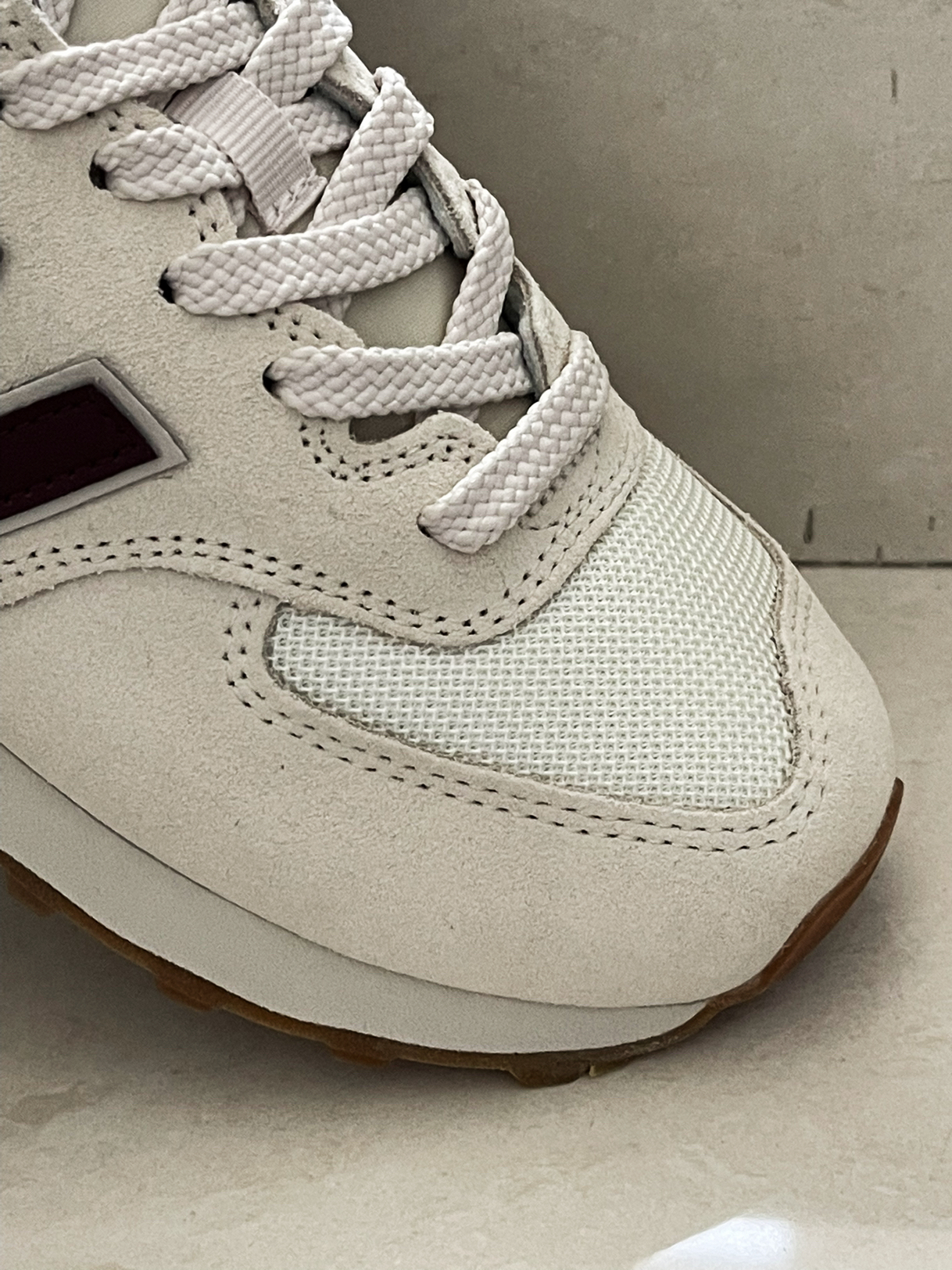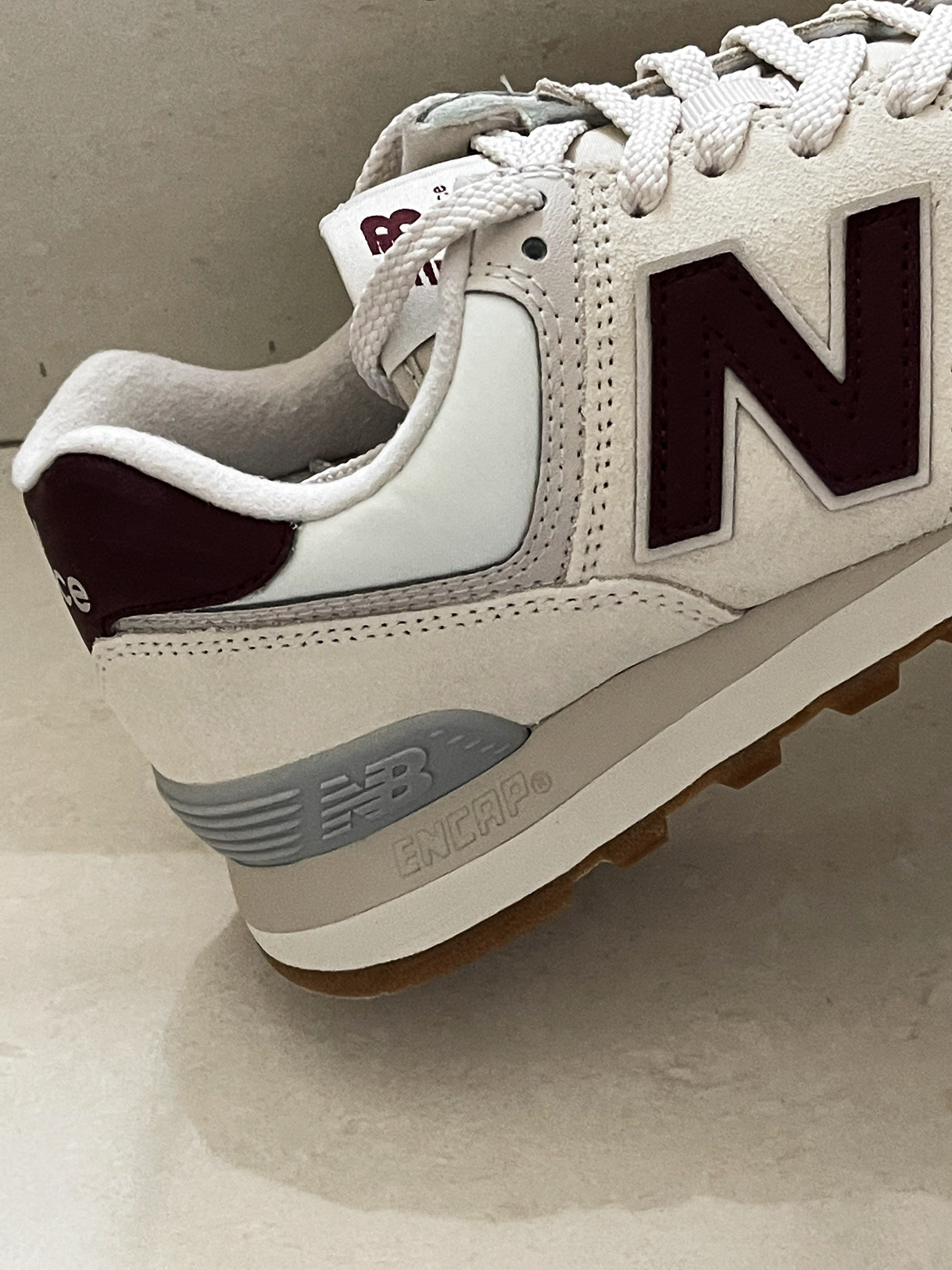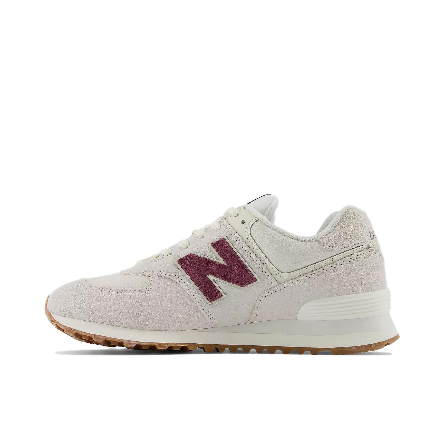 鞋款名称,New Balance NB 574复古低帮跑步鞋女款米白色,还是经典的复古款,鞋面采用绒面革和织物面料,酒红色的N是一大亮点,简约且时尚感强,大底采用的是橡胶,防滑,日常穿或跑个步都可以