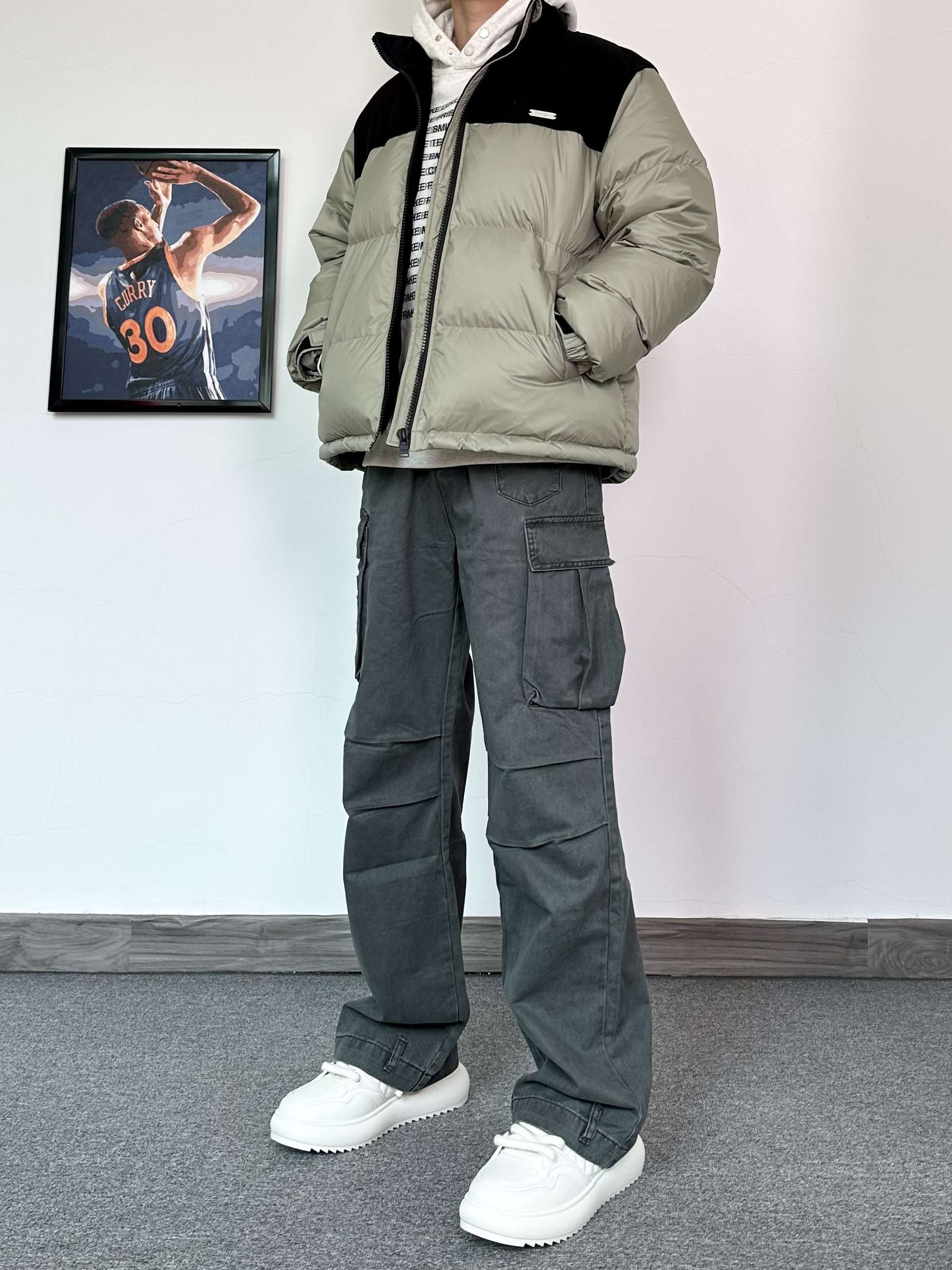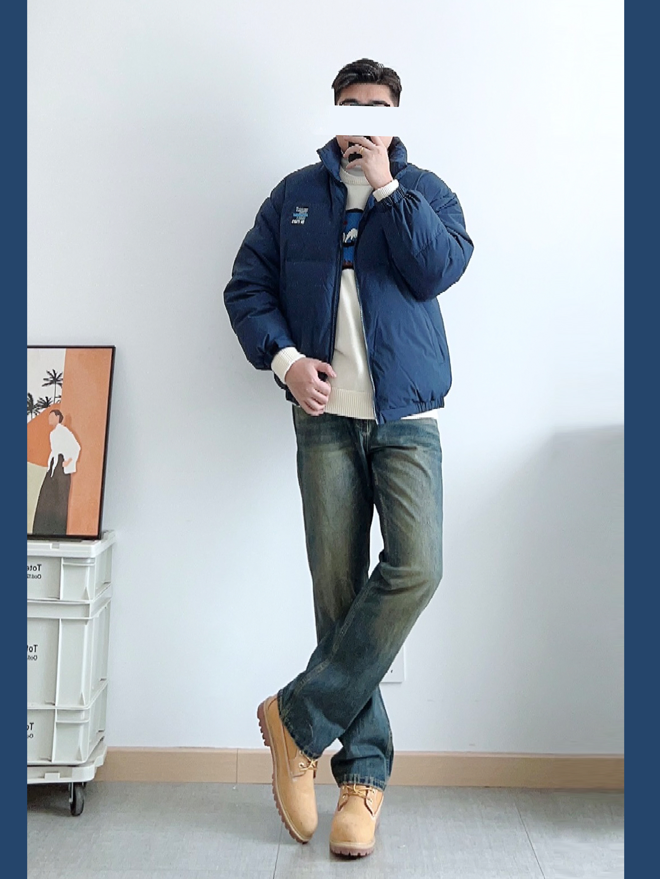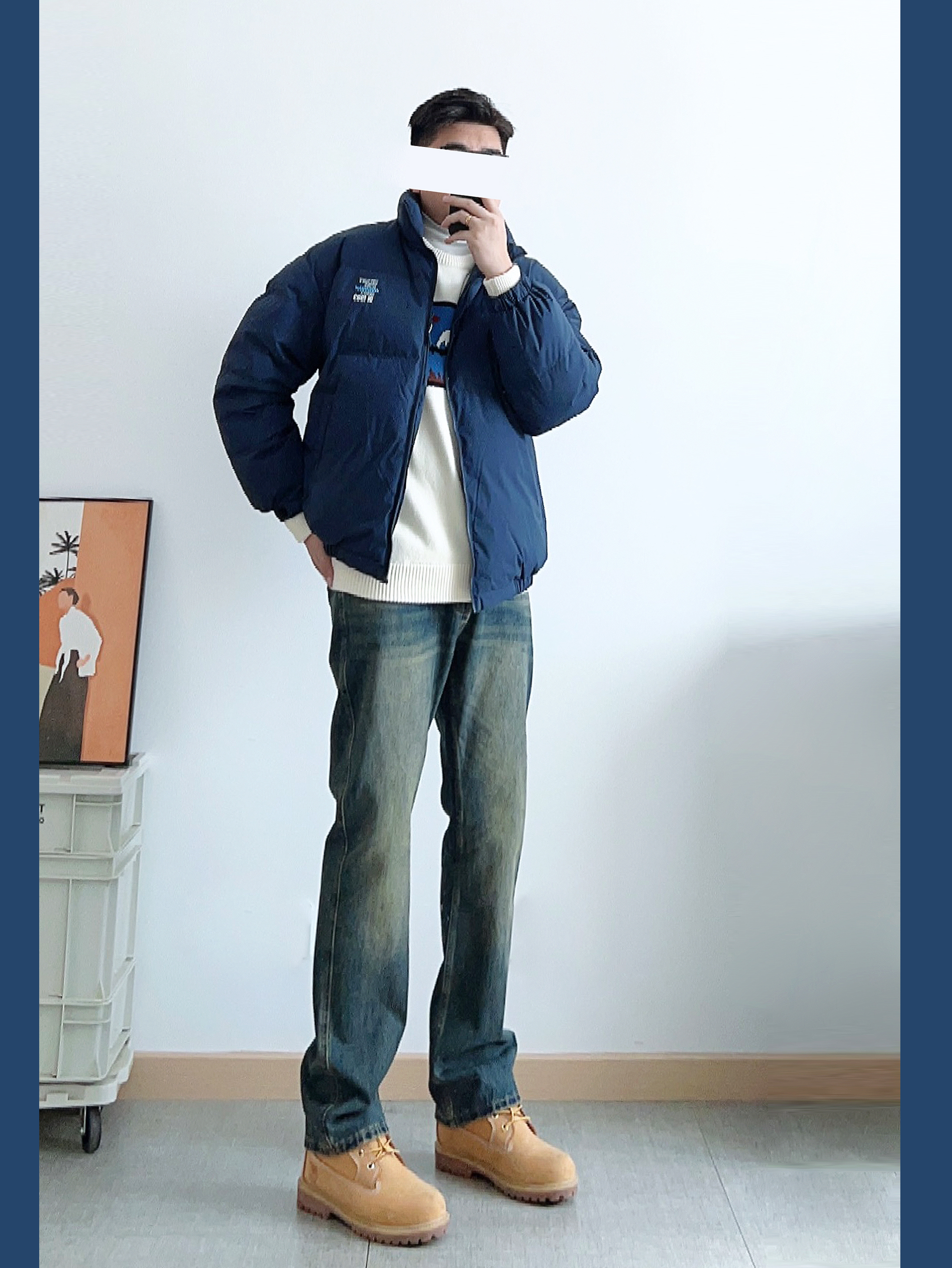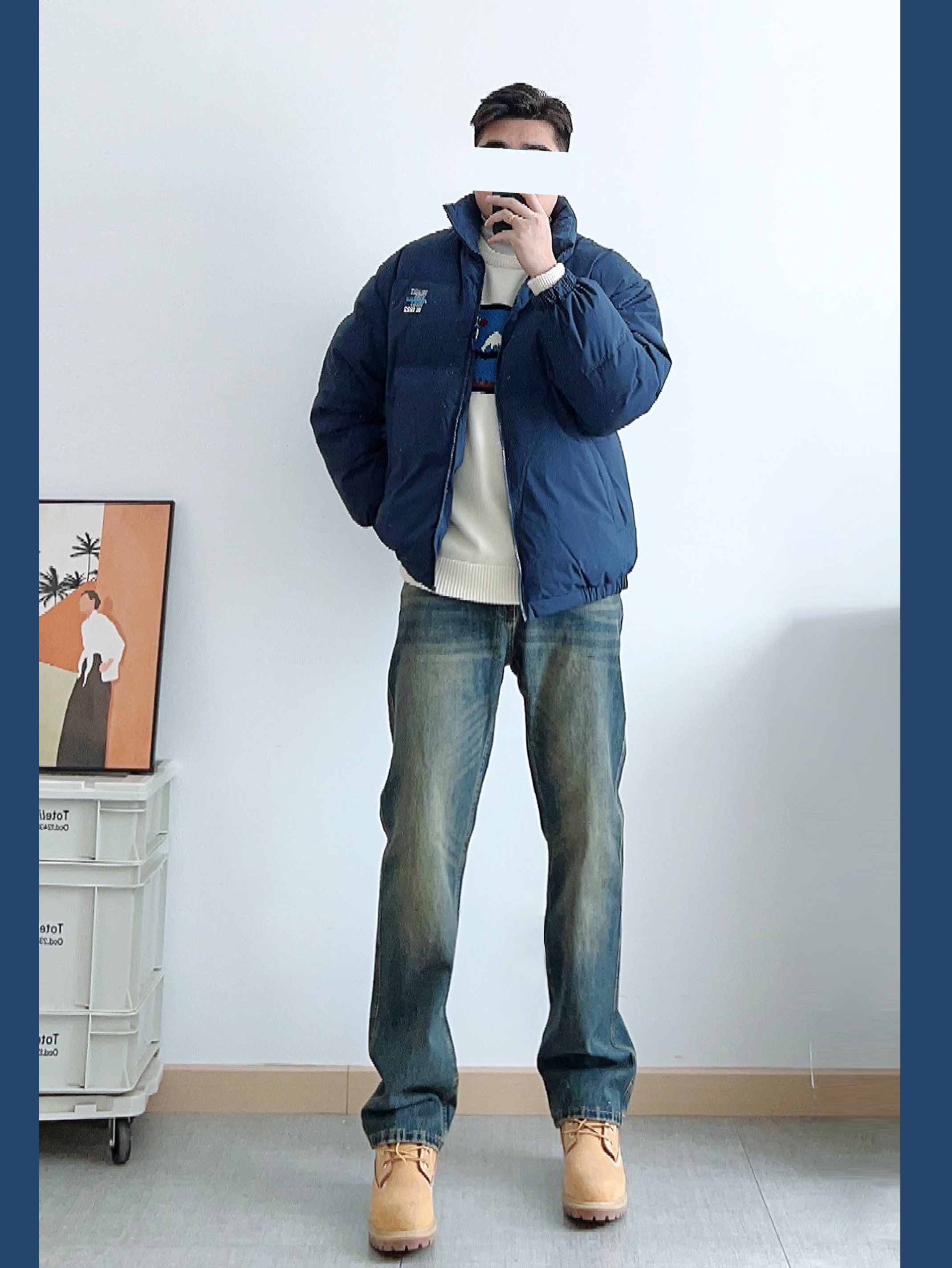- 藏青色棉服内搭白色毛衣 下身黄泥染牛仔裤搭配大黄靴 整体硬朗有型、耐看不油~ -