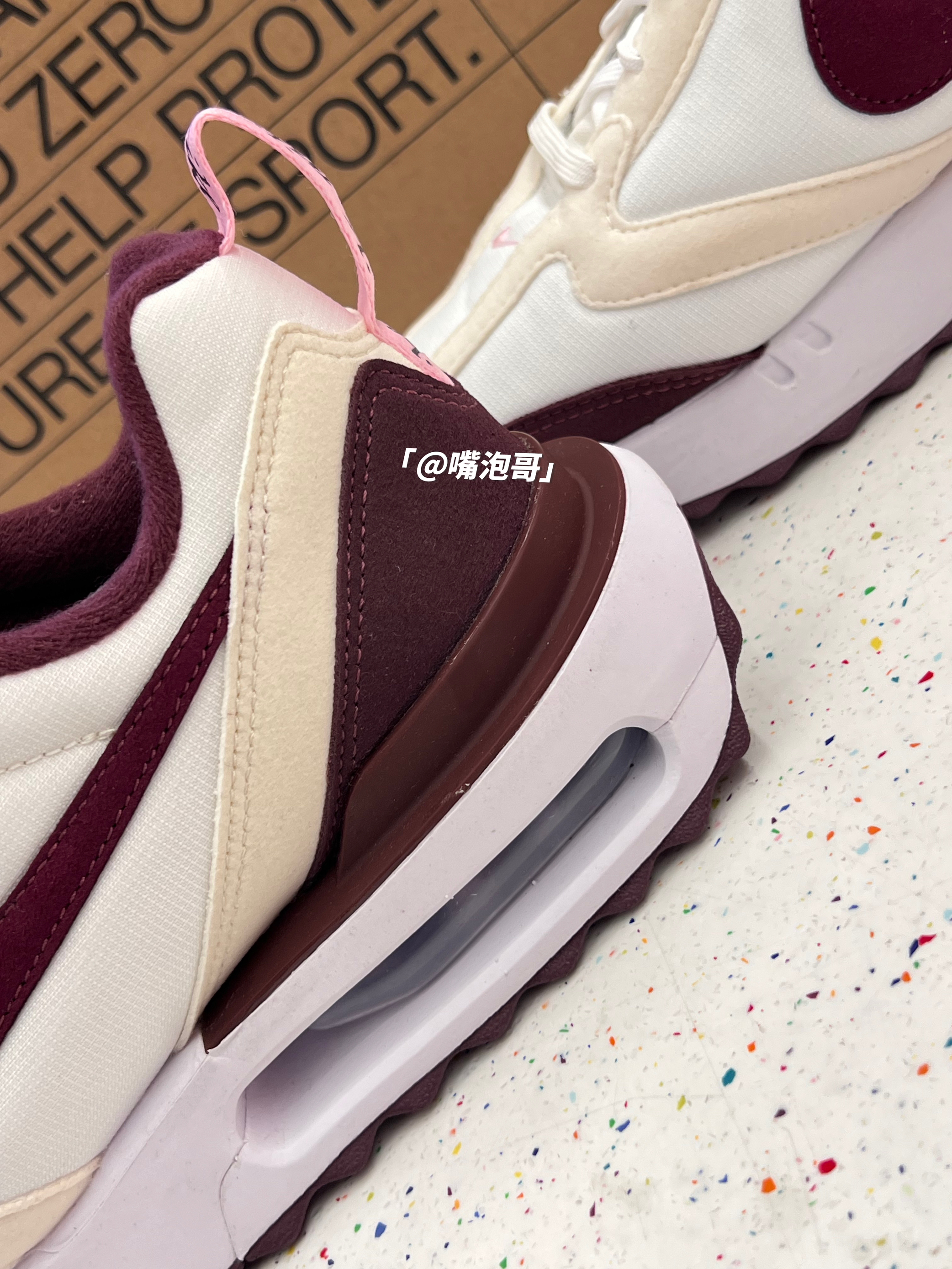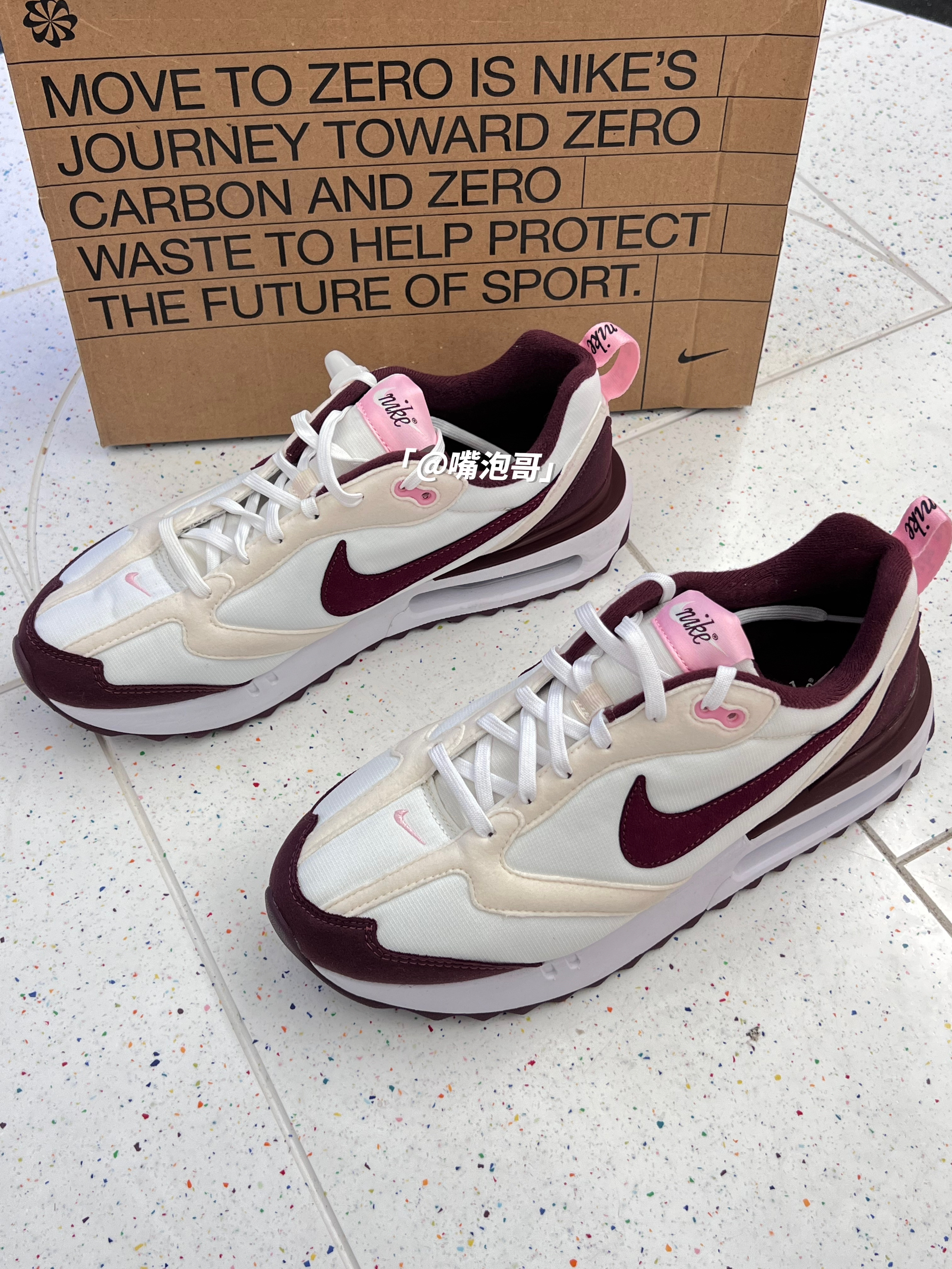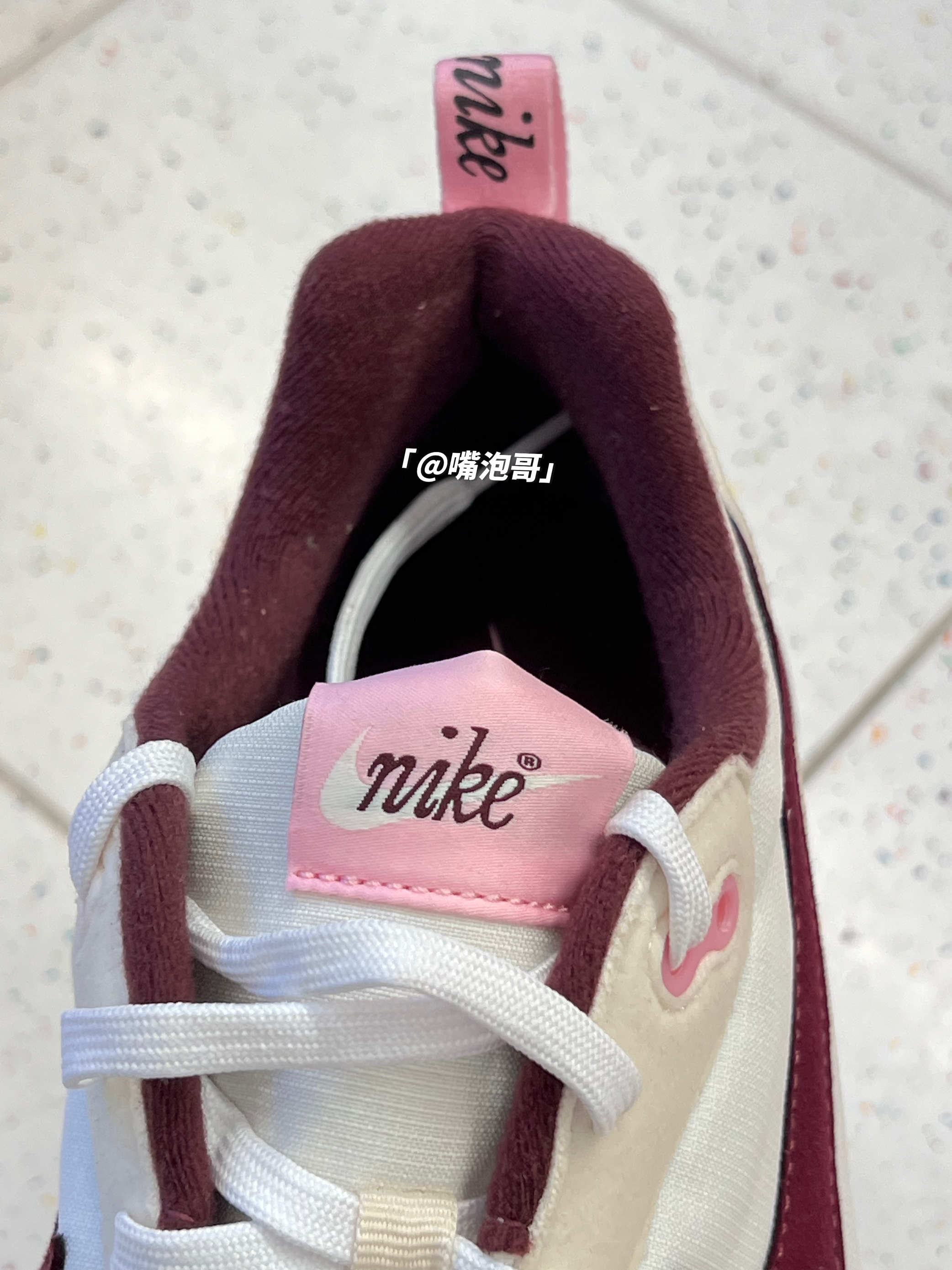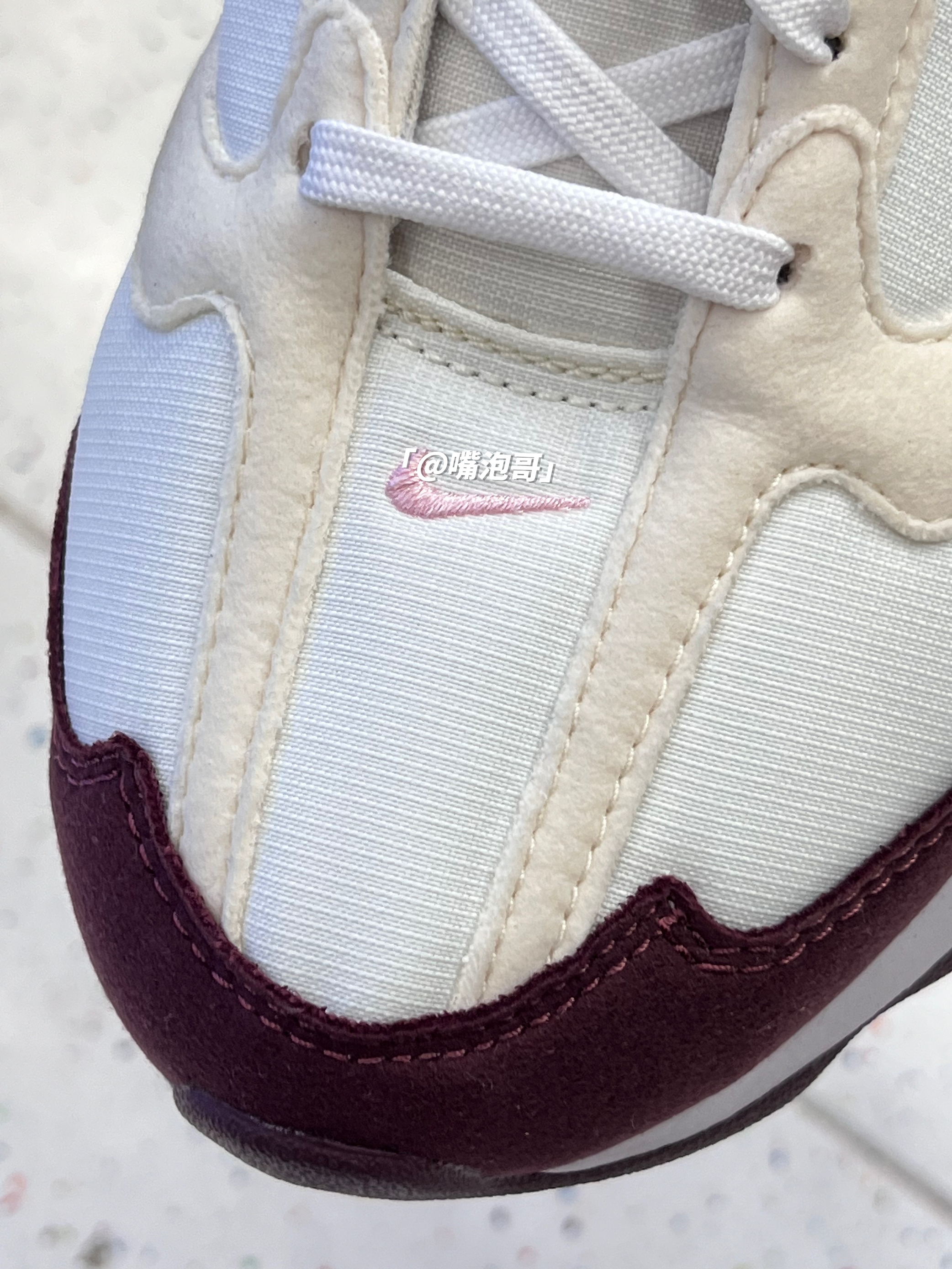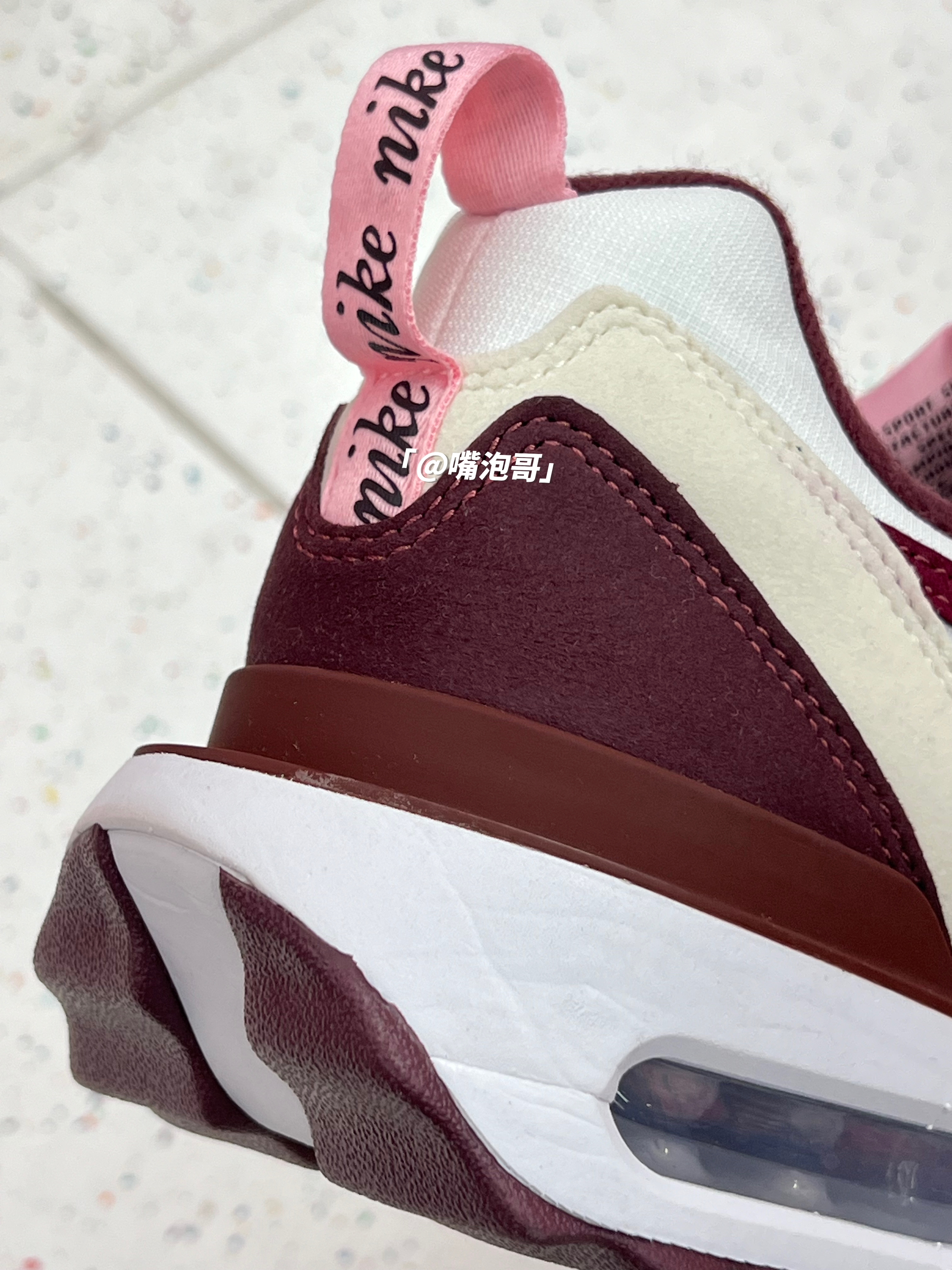 👟:Air Max Dawn 米白红 简介: 这是一双Air Max系列的休闲鞋,整双鞋子选用了米白色作为主色调,细节处加入粉色、酒红色装饰,复合织物鞋面搭配上双缓震中底,使鞋子上脚有着良好的脚感。 细节: 鞋面采用了复合织物布制作而成,使鞋面柔软且具透气性,两侧的swoosh选用了酒红色皮革制成,增加了复古感,鞋舌上的粉色绣标与后跟的粉色提手相呼应,中底全掌配色高密度缓震泡棉,并且又...