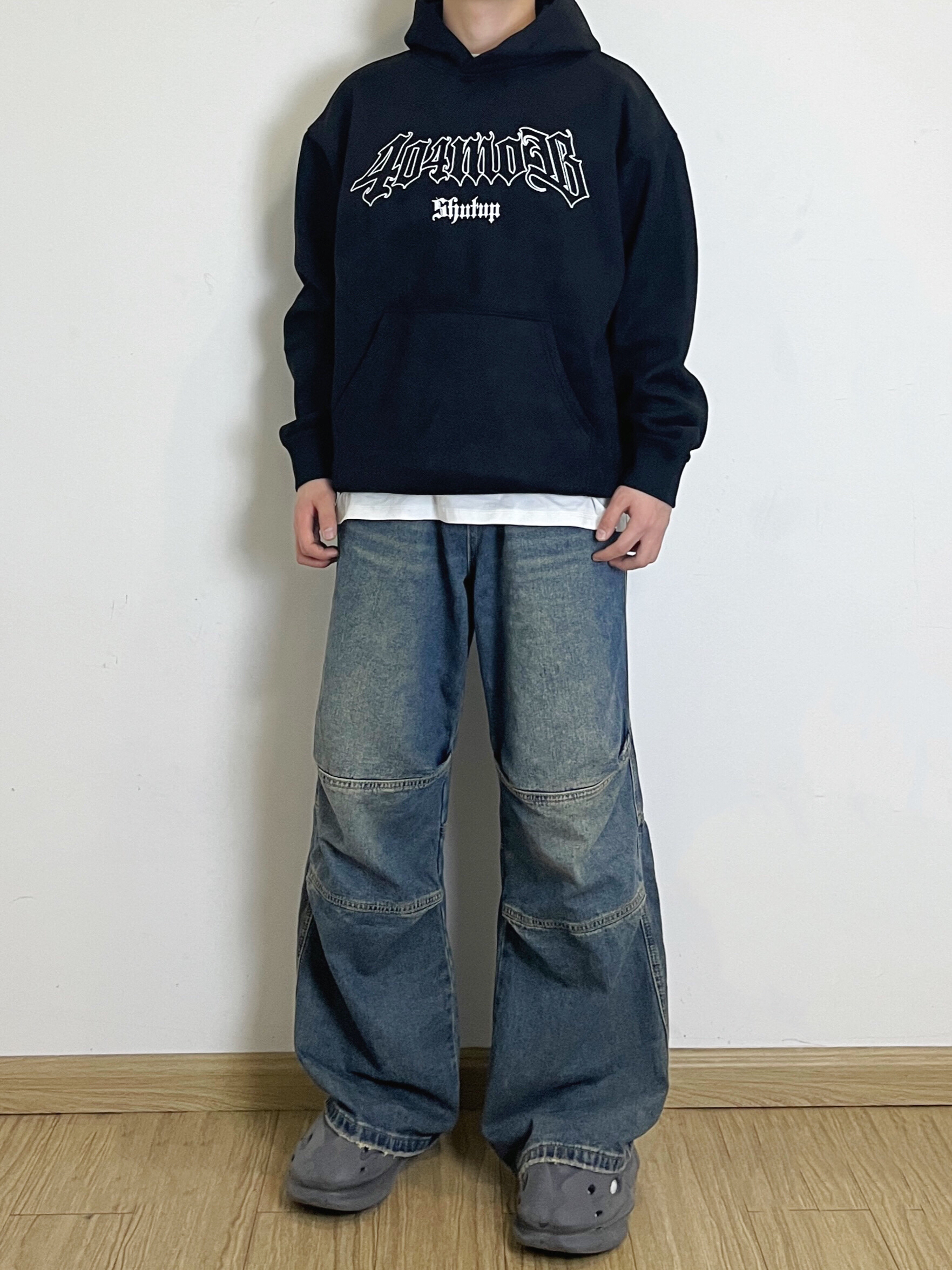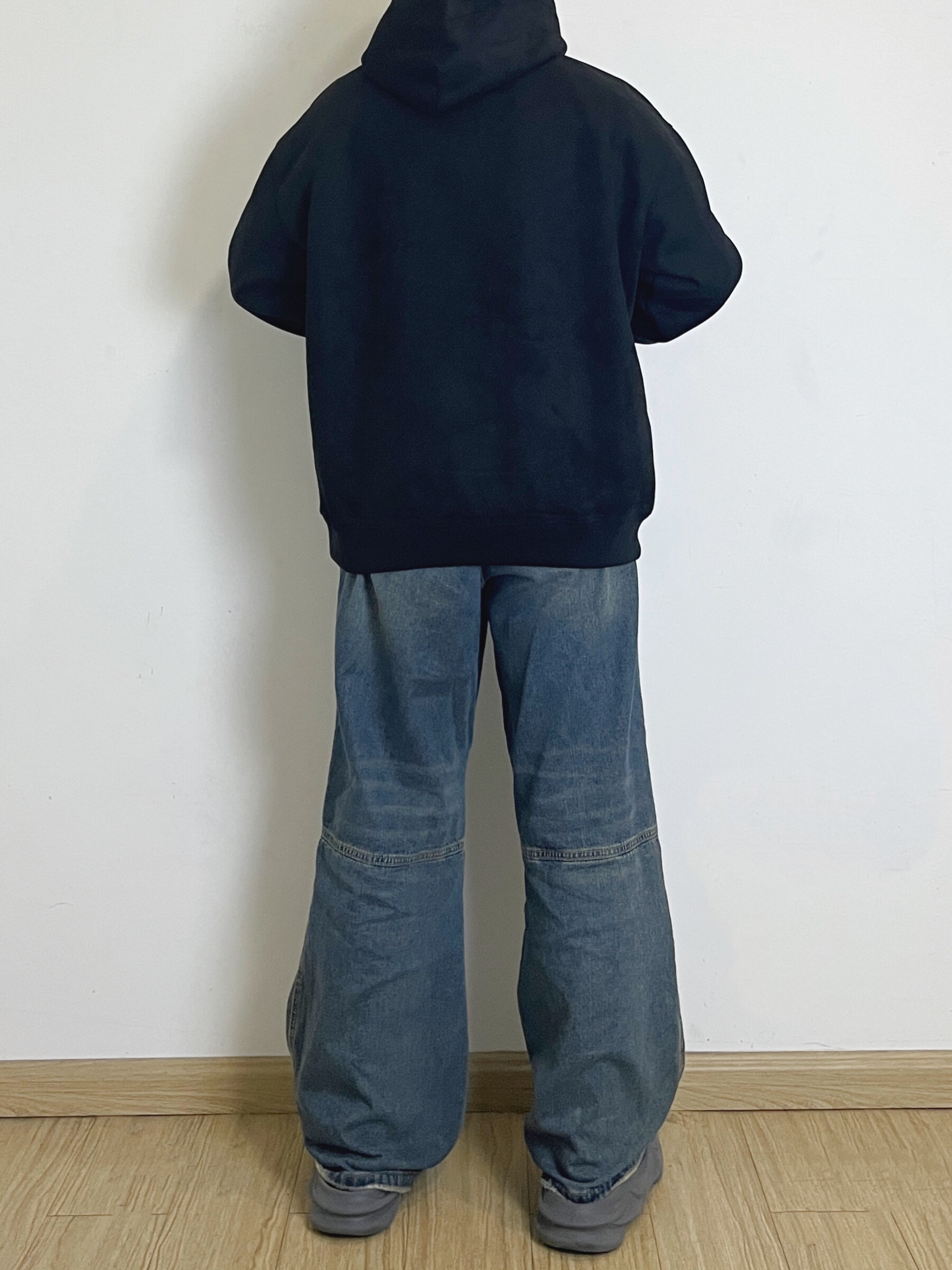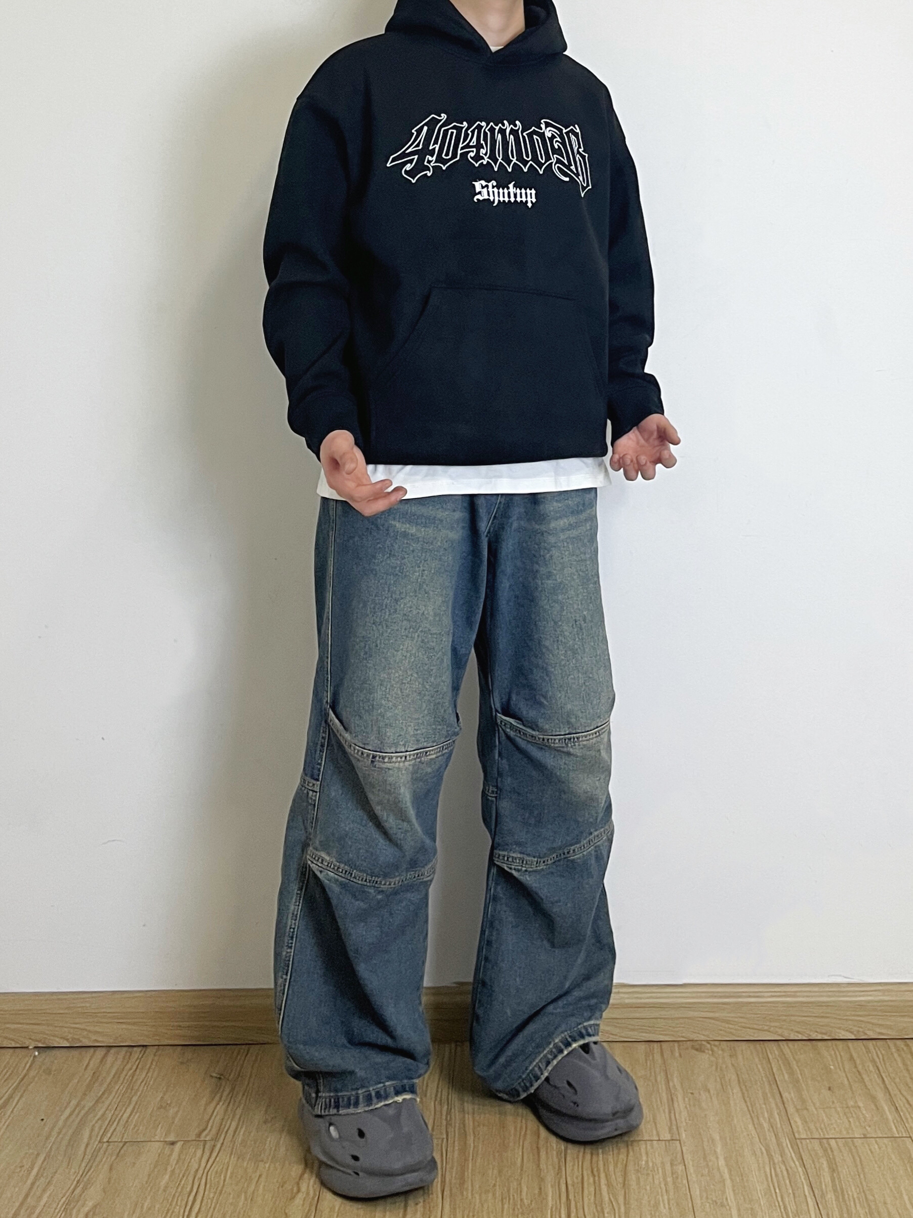 😼身高178体重68 兄弟们冬日酷帅的街头美式复古穿搭你还不会穿吗 今日美式复古街头风穿搭分享📼 黑色美式刺绣字母印花卫衣 搭配上复古蓝褶皱设计拖地牛仔🆒 黑色跟蓝色的简单搭配复古又随性📼 卫衣纯色的设计加入了刺绣🪡字母印花的点缀 上身简约的同时也不失设计感 搭配上拖地牛仔这一套就是满满的美式复古街头风 兄弟们入冬复古随性的美式穿搭还不赶快抄作业📝