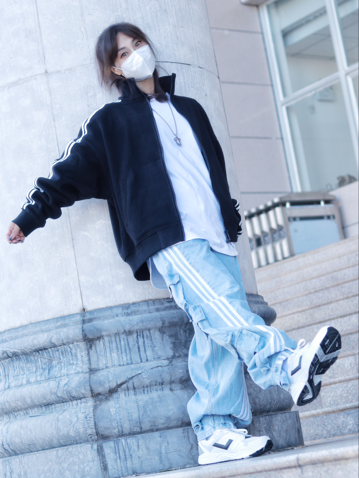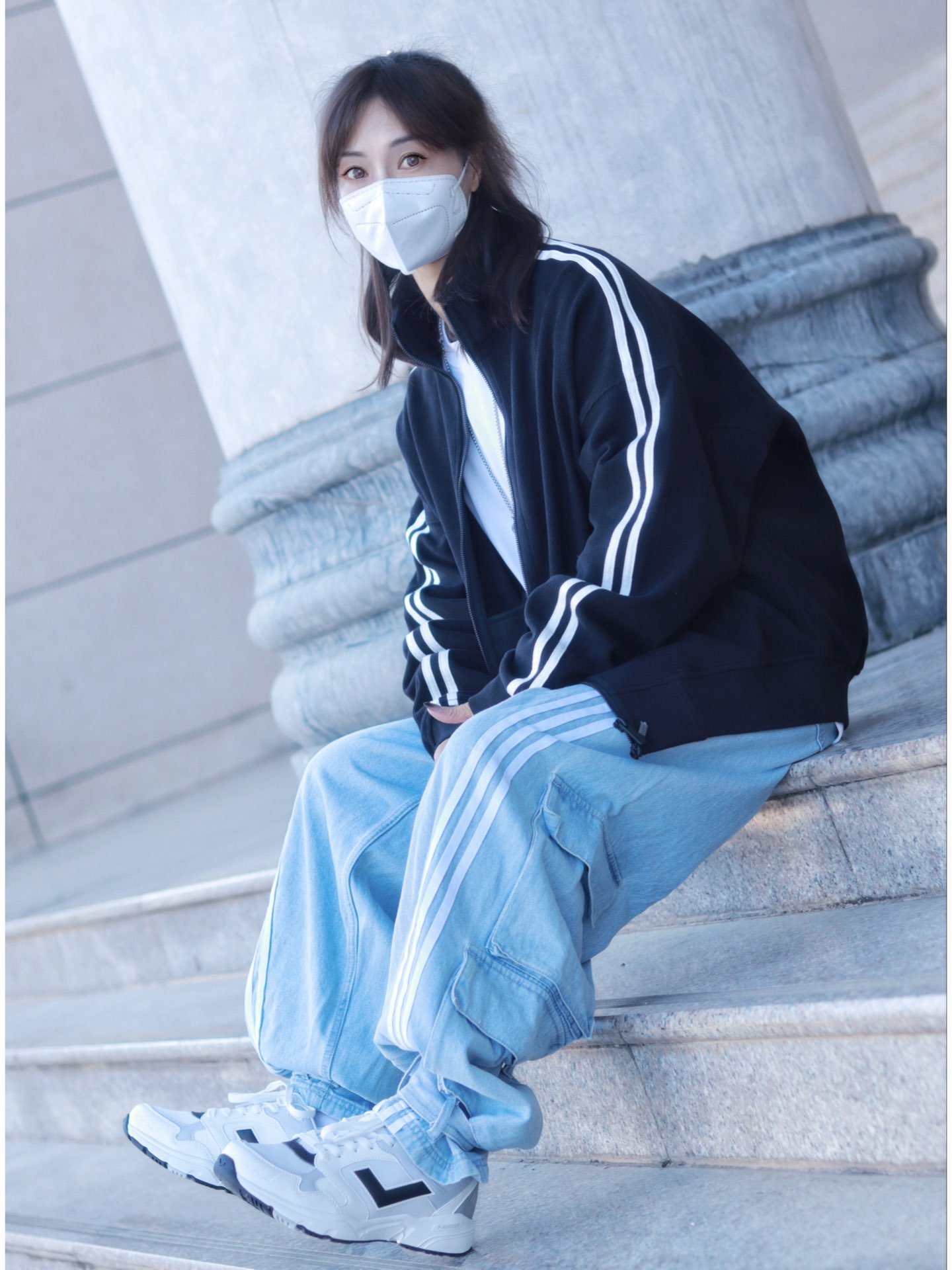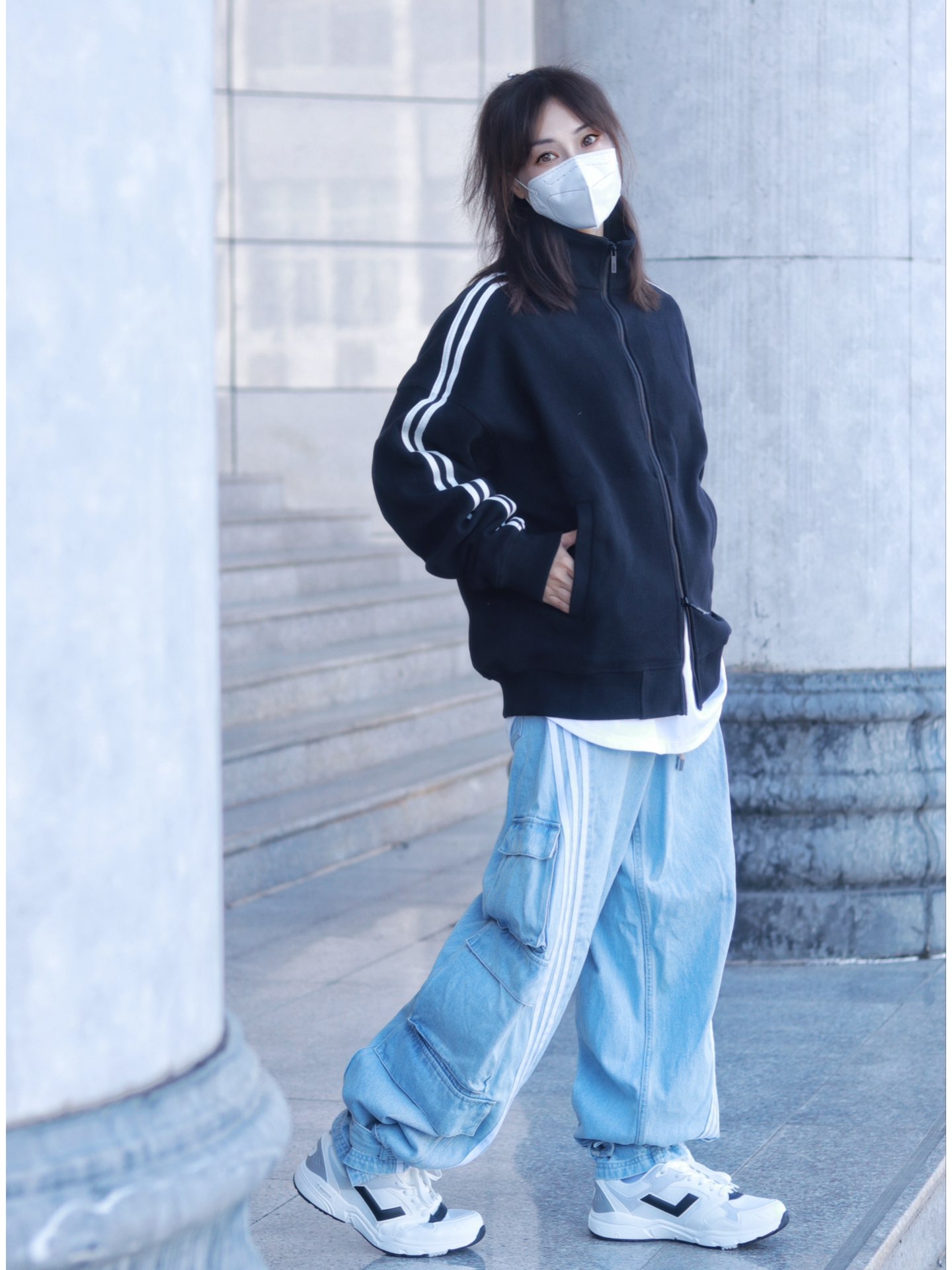 嗨~这里是【😷鹿】为防护代言😎 🌟 \【163 / 48 KG】卫衣:M 裤子:M ------------ 不穿羽绒服的冬日 简直就是限定版的存在着 让我可以随心所欲的穿搭真nice 今天这身穿搭配色提案,黑色撞浅蓝的搭配 真是撞出了干净利落清爽养眼的高级感 复古立领黑色开衫卫衣,袖子上的白色条纹完美呼应上了浅色牛仔阔腿裤的三条杠 鞋子也搭配了低饱和度的黑白撞色低帮跑步鞋 内搭白色卫衣,一个色...