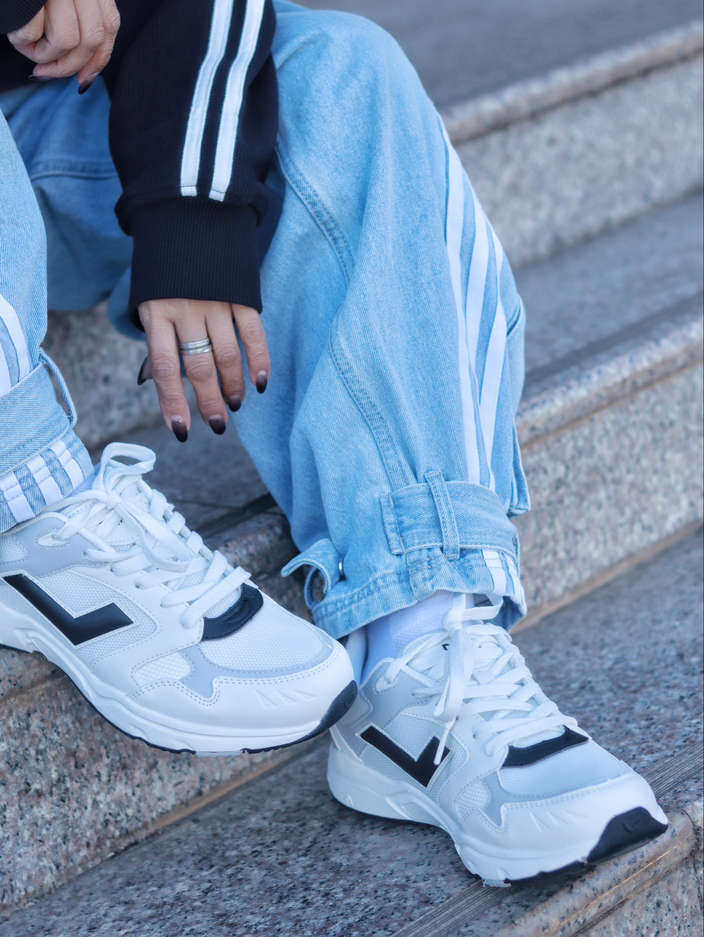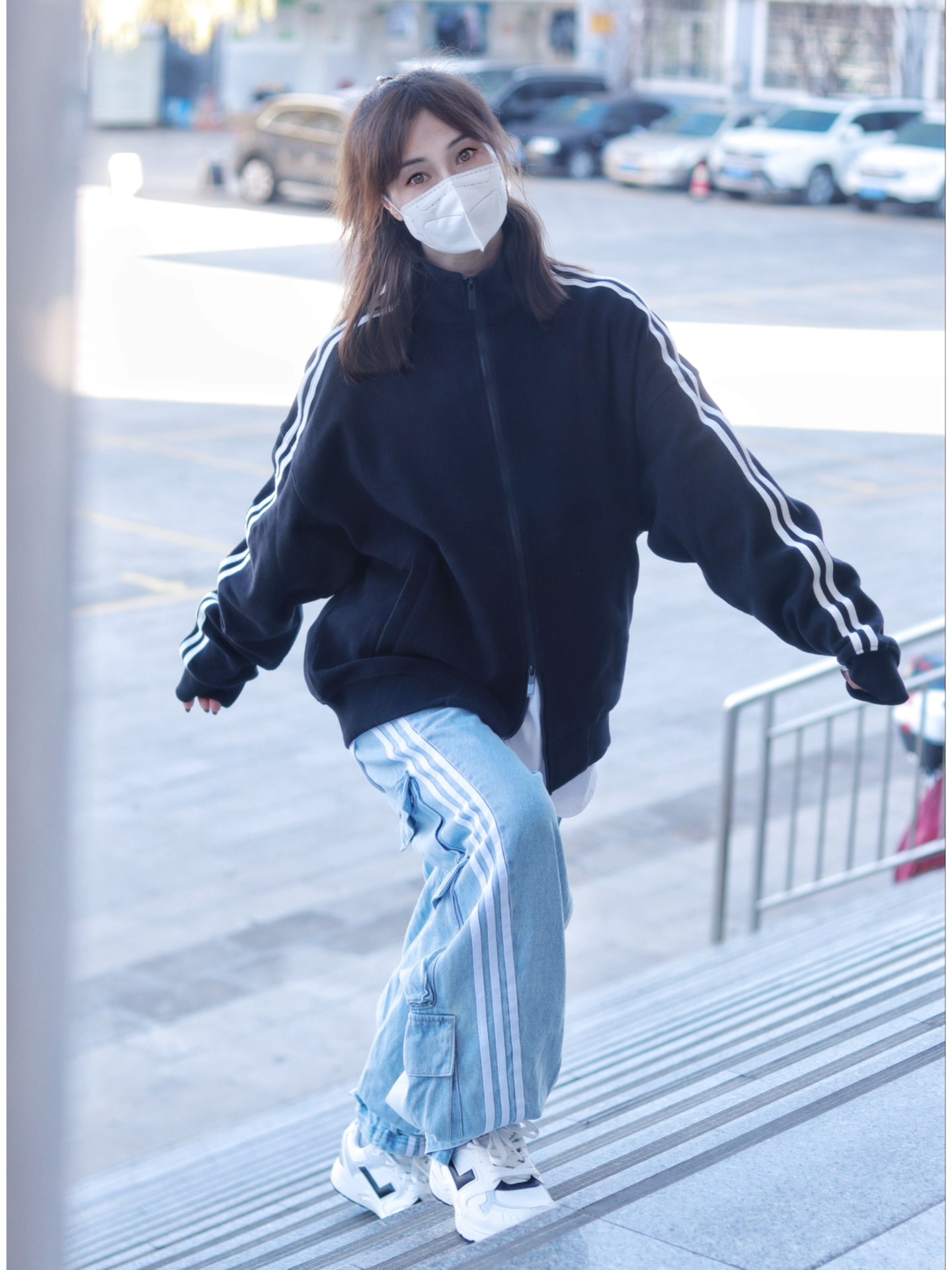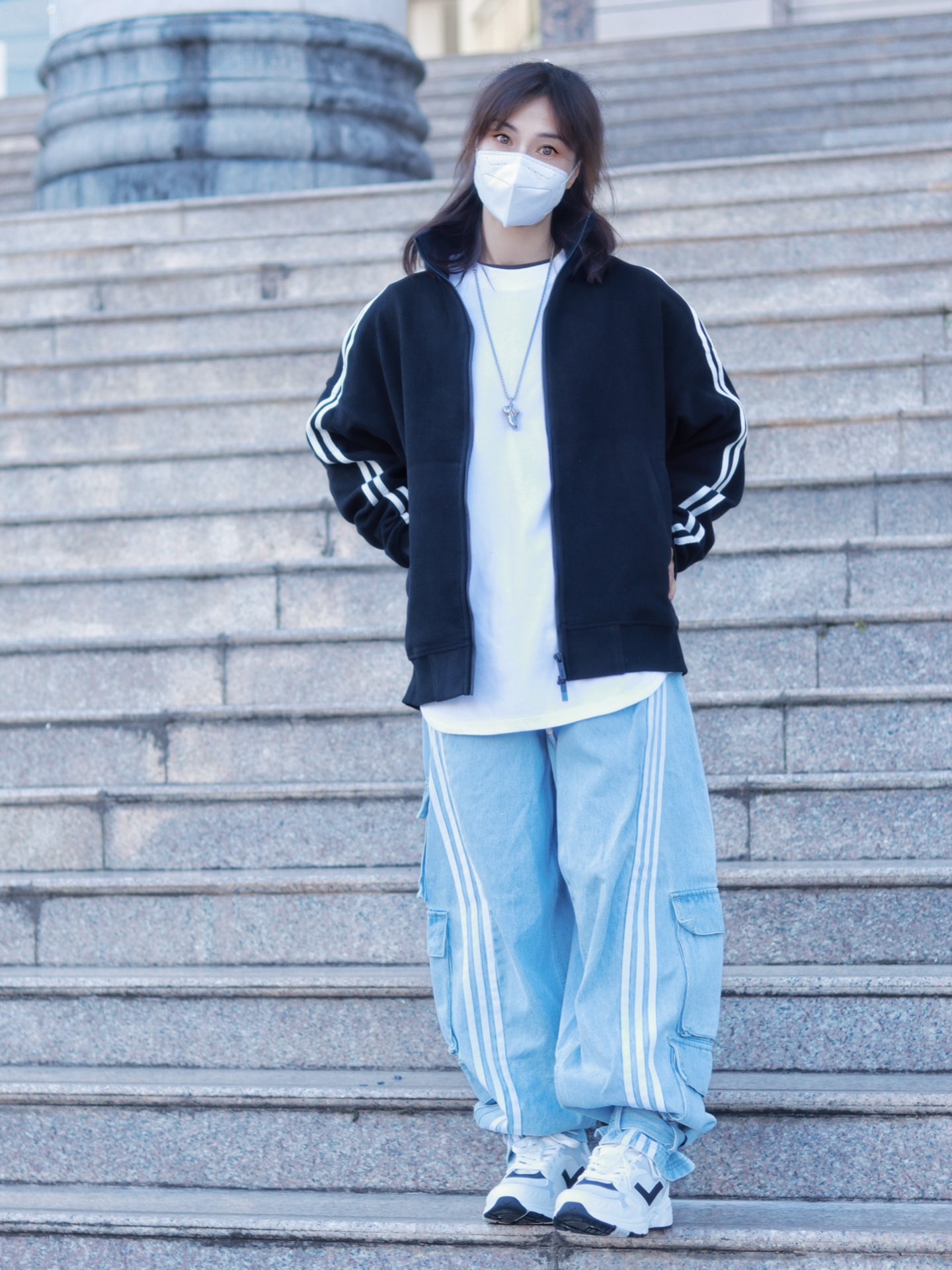 嗨~这里是【😷鹿】为防护代言😎 🌟 \【163 / 48 KG】卫衣:M 裤子:M ------------ 不穿羽绒服的冬日 简直就是限定版的存在着 让我可以随心所欲的穿搭真nice 今天这身穿搭配色提案,黑色撞浅蓝的搭配 真是撞出了干净利落清爽养眼的高级感 复古立领黑色开衫卫衣,袖子上的白色条纹完美呼应上了浅色牛仔阔腿裤的三条杠 鞋子也搭配了低饱和度的黑白撞色低帮跑步鞋 内搭白色卫衣,一个色...
