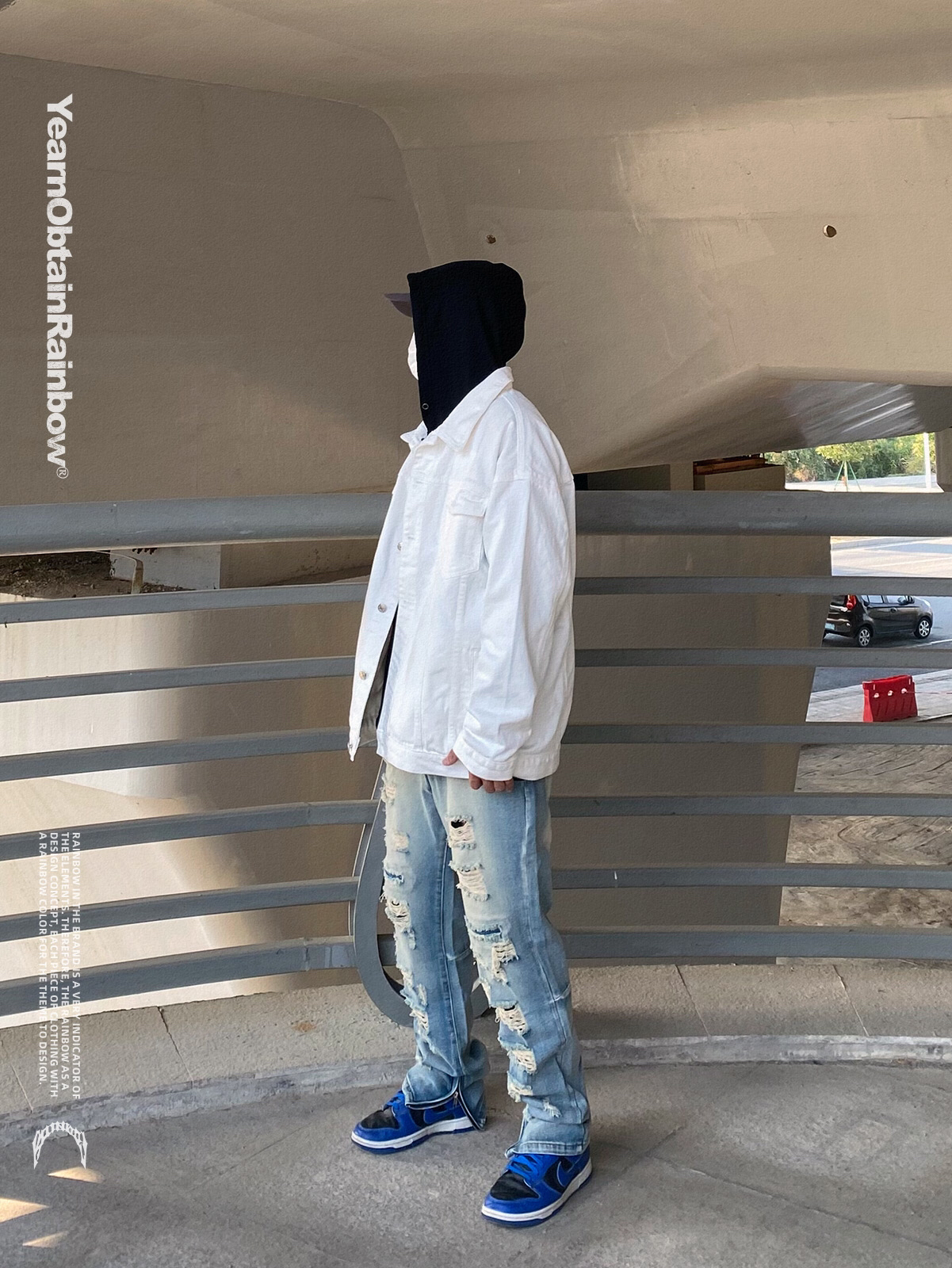白色牛仔外套搭配破洞牛仔裤好吸睛