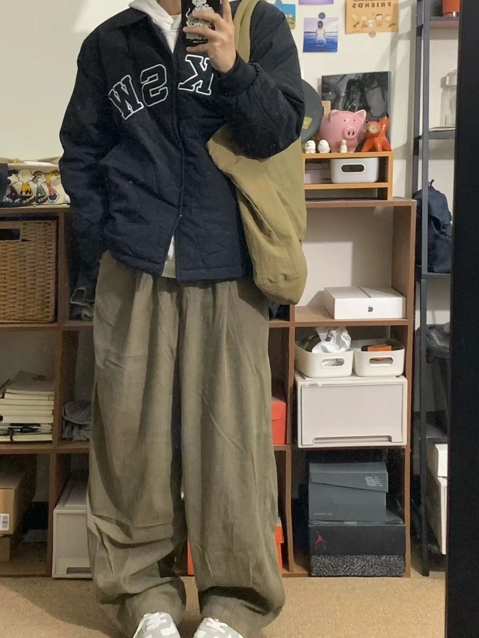 嘿嘿这套真的很经典了灰色连帽卫衣搭配黑色棉服 下面搭配了一条灯芯绒的长裤 简直是冬天的标配了