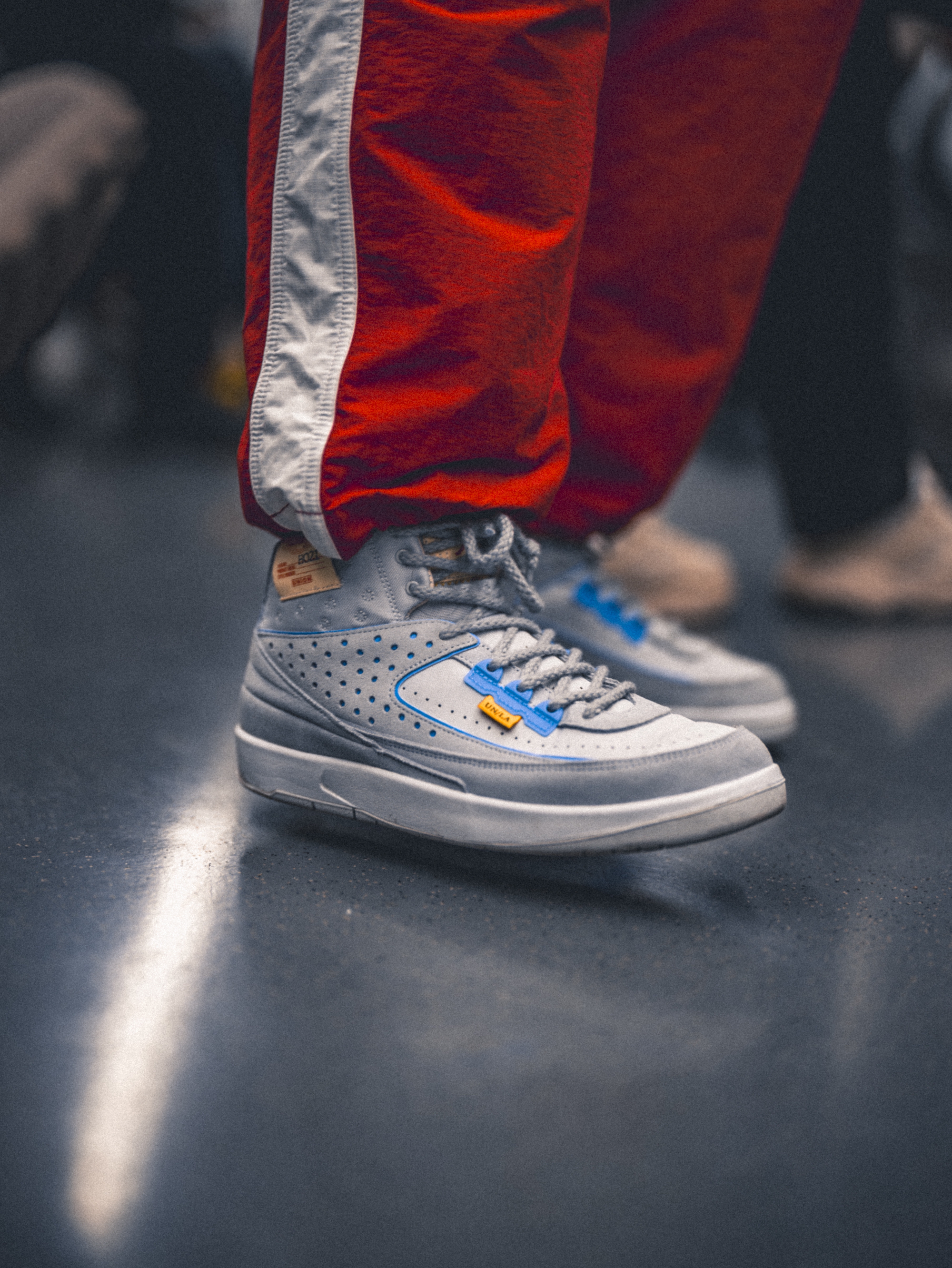 这鞋是 union la 和 Jordan 联名出的一款鞋👟,这鞋灵感是来自 86 年的 Air Jordan 2,鞋面是灰色的帆布和麂皮,上面有小孔,透出来的是亮蓝色的内衬。鞋舌有泡沫边儿,还有黄色的标签,看着挺复古的👴。鞋侧有个黄色的 “UN/LA” 标签,鞋领上有个飞翼标志,感觉挺有特色的🌟