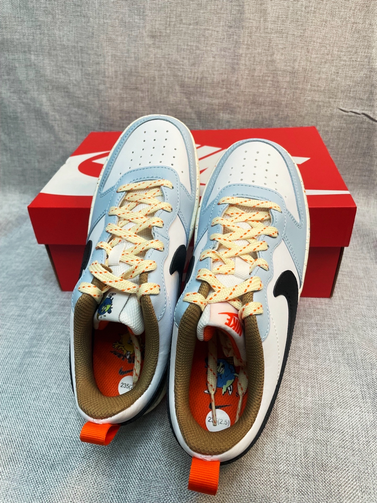 🛒好物名称:Nike Court Borough Low 2 白蓝 🤔推荐理由:鞋子主体采用了清爽的白蓝配色,搭配上黑色的swoosh和墨绿色的后跟。中底部分像蛋糕上撒的七彩糖衣一样,缤纷多彩,很有夏天的味道! 鞋面材质是牛剖层革十合成革,打理起来非常的方便,湿纸巾擦拭即可。 尺码方面选择正常码即可。
