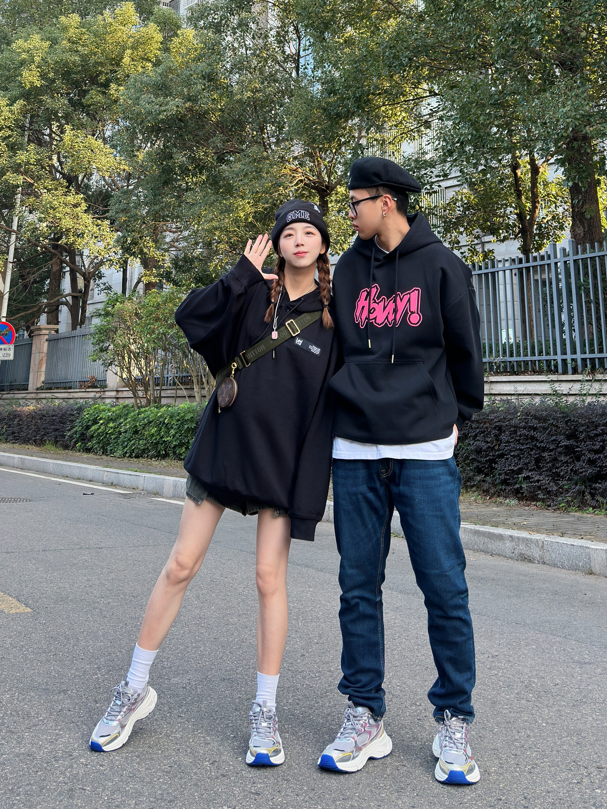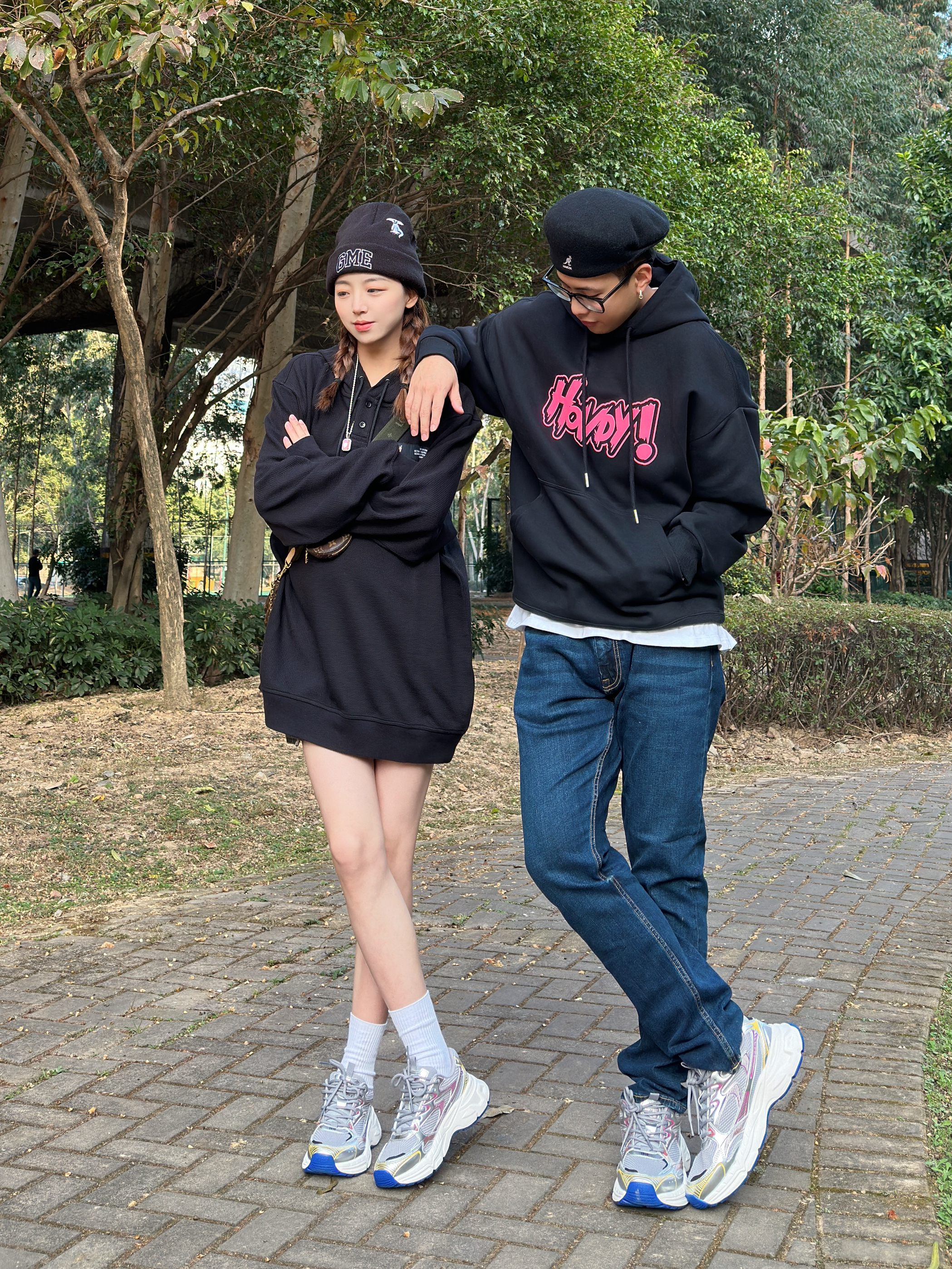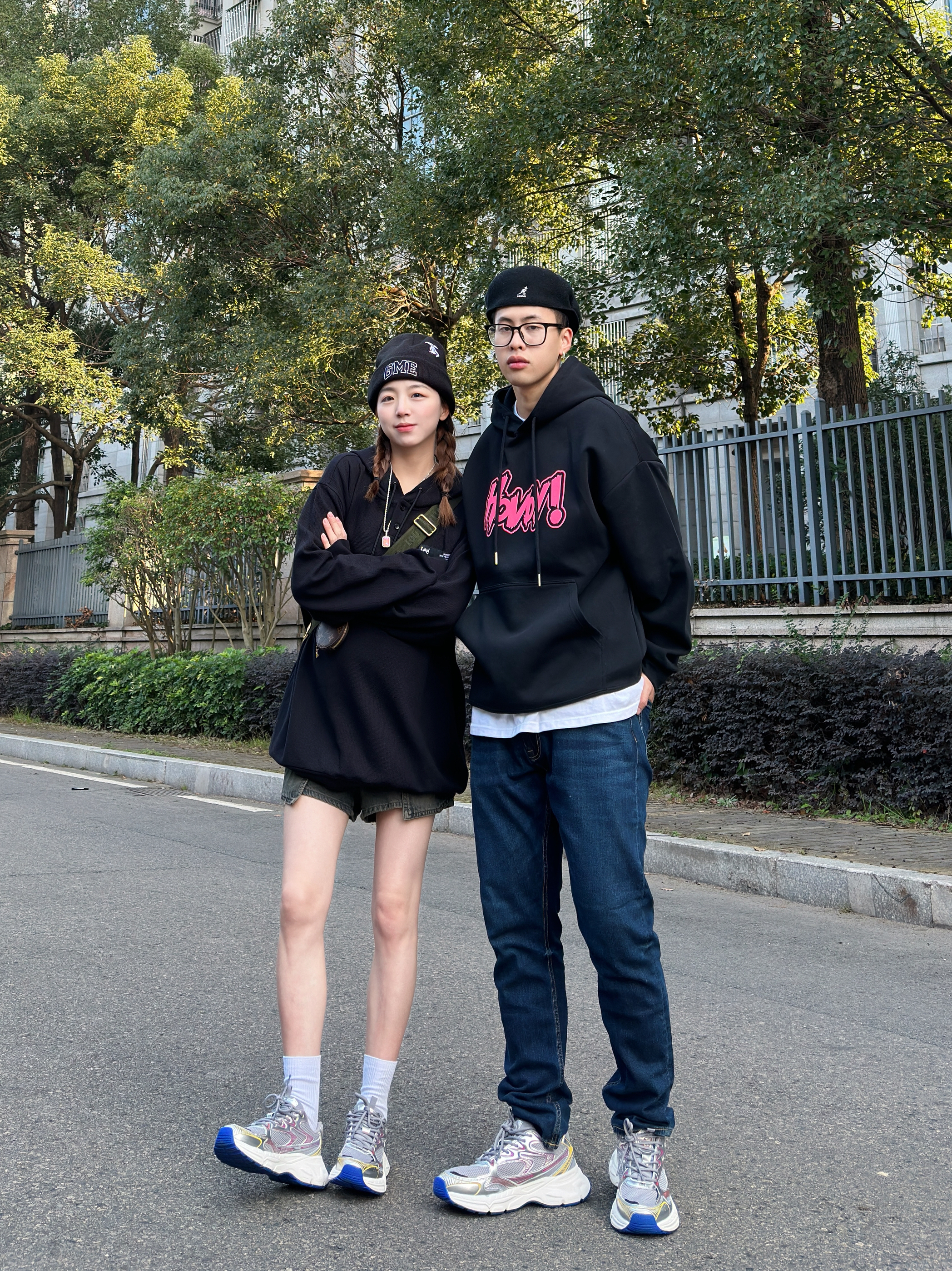 ———新年look——— 今日情侣穿搭主题:卫衣怎么搭 - 👨:182/75 黑色的卫衣搭配上粉色的趣味logo 再搭配上一条深蓝色的修身牛仔裤 鞋子搭配了灰银色的kappa 老爹鞋 今日的美式复古感是鞋子给的~ - 👧:168/48 黑色的卫衣+水洗短裤 显瘦显高就这么穿 新年的第一双情侣鞋 搭配这套再合适不过了~