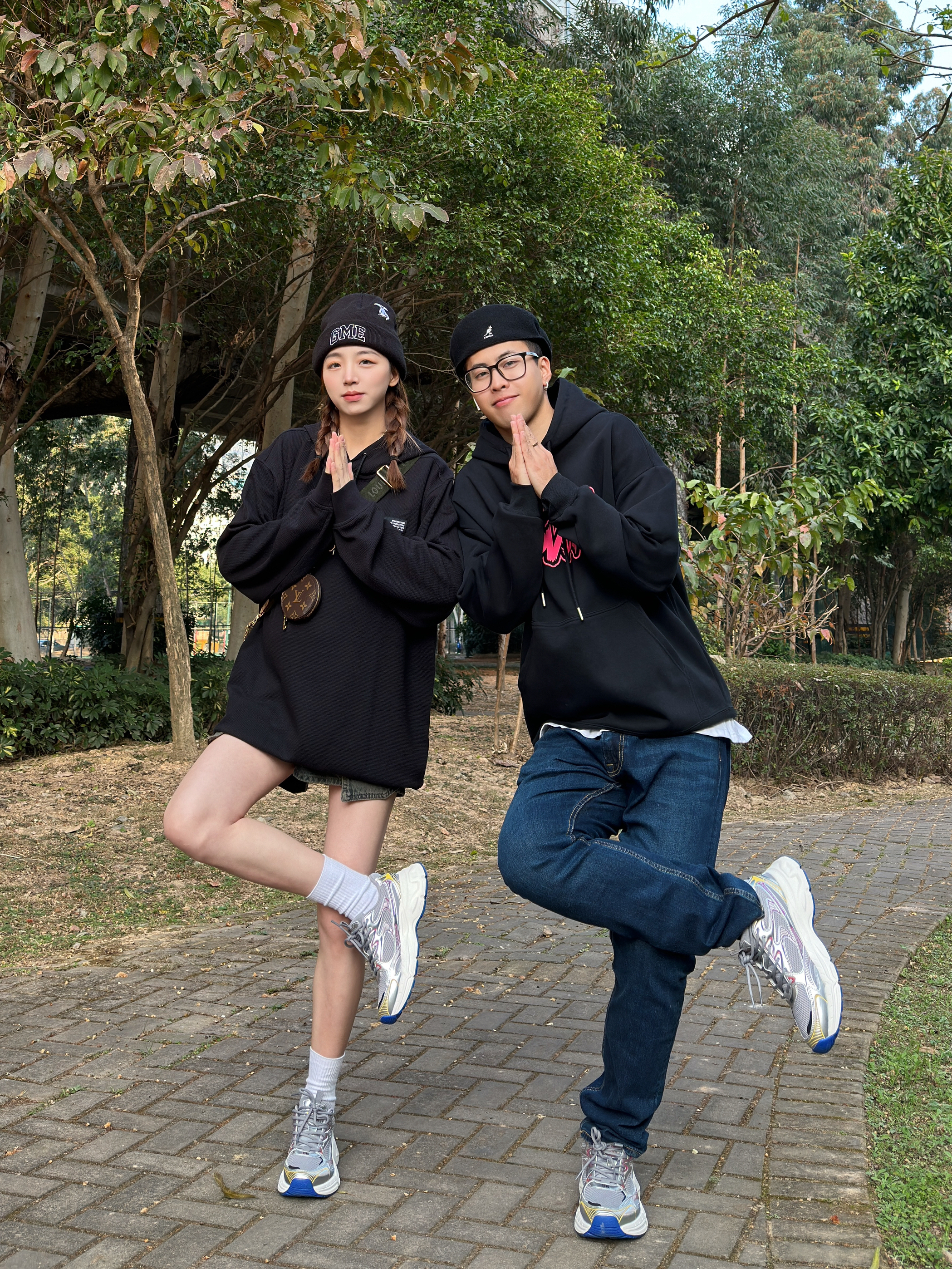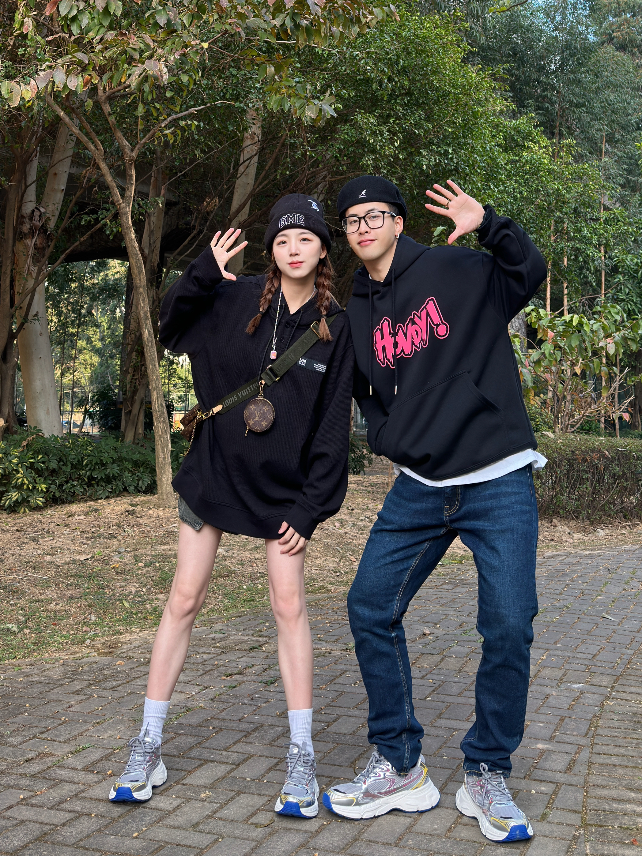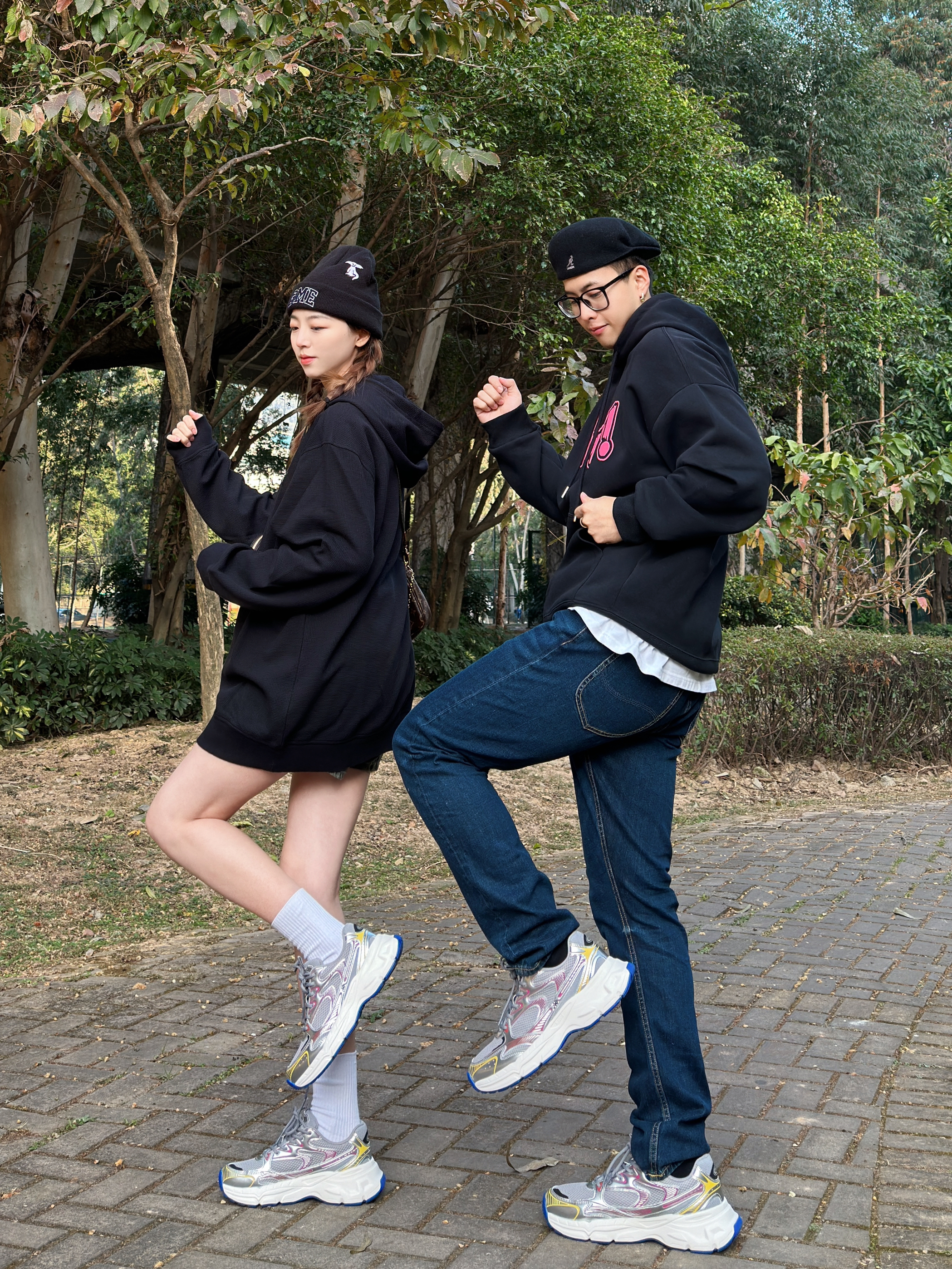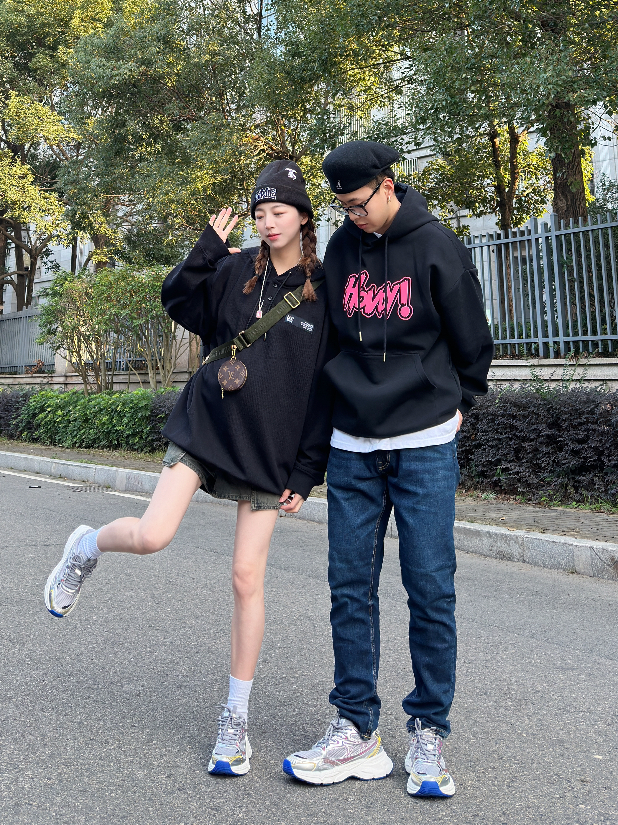 ———新年look——— 今日情侣穿搭主题:卫衣怎么搭 - 👨:182/75 黑色的卫衣搭配上粉色的趣味logo 再搭配上一条深蓝色的修身牛仔裤 鞋子搭配了灰银色的kappa 老爹鞋 今日的美式复古感是鞋子给的~ - 👧:168/48 黑色的卫衣+水洗短裤 显瘦显高就这么穿 新年的第一双情侣鞋 搭配这套再合适不过了~