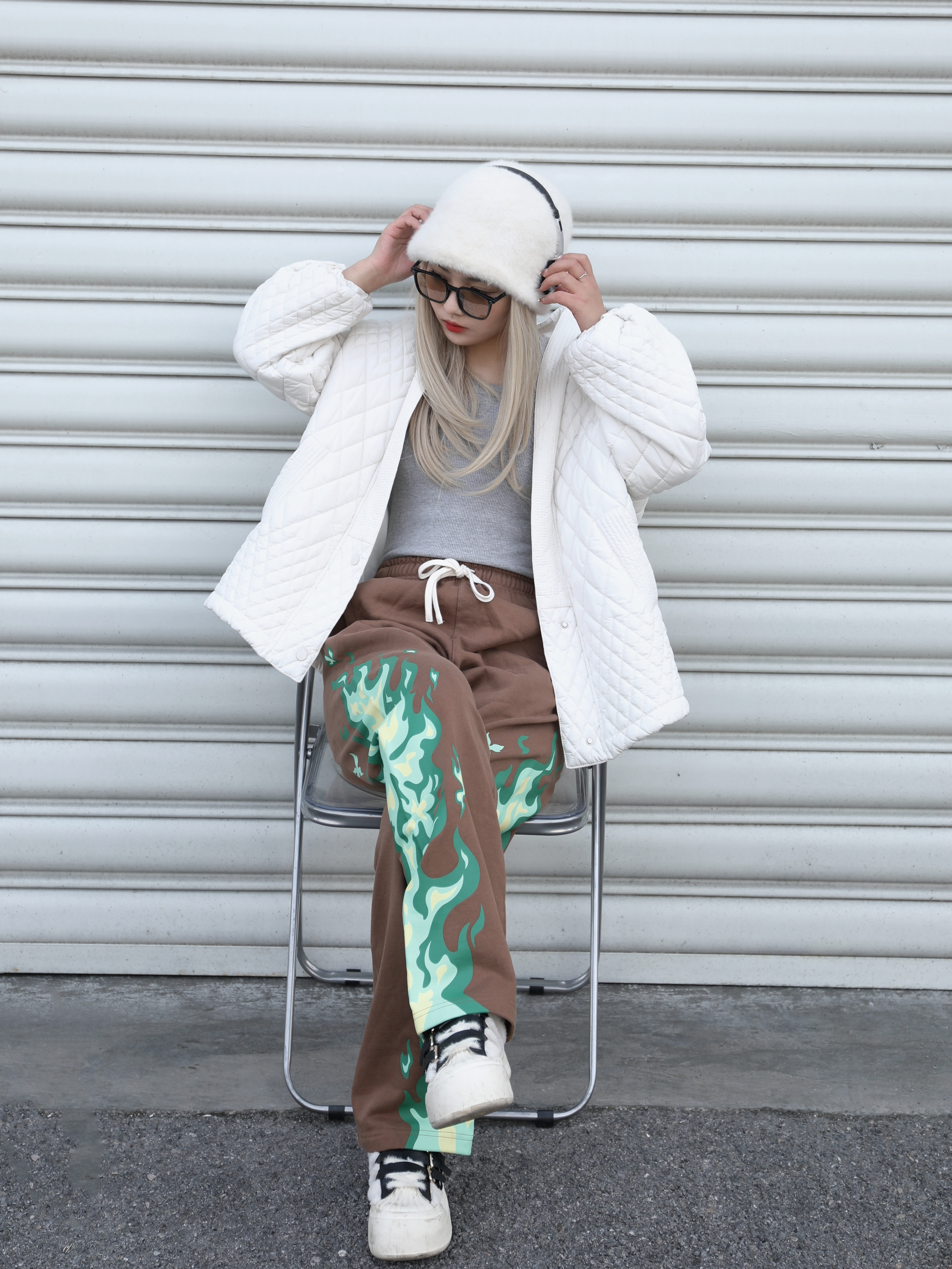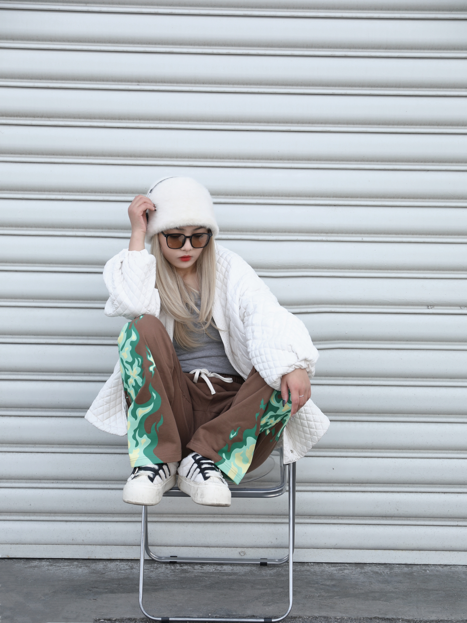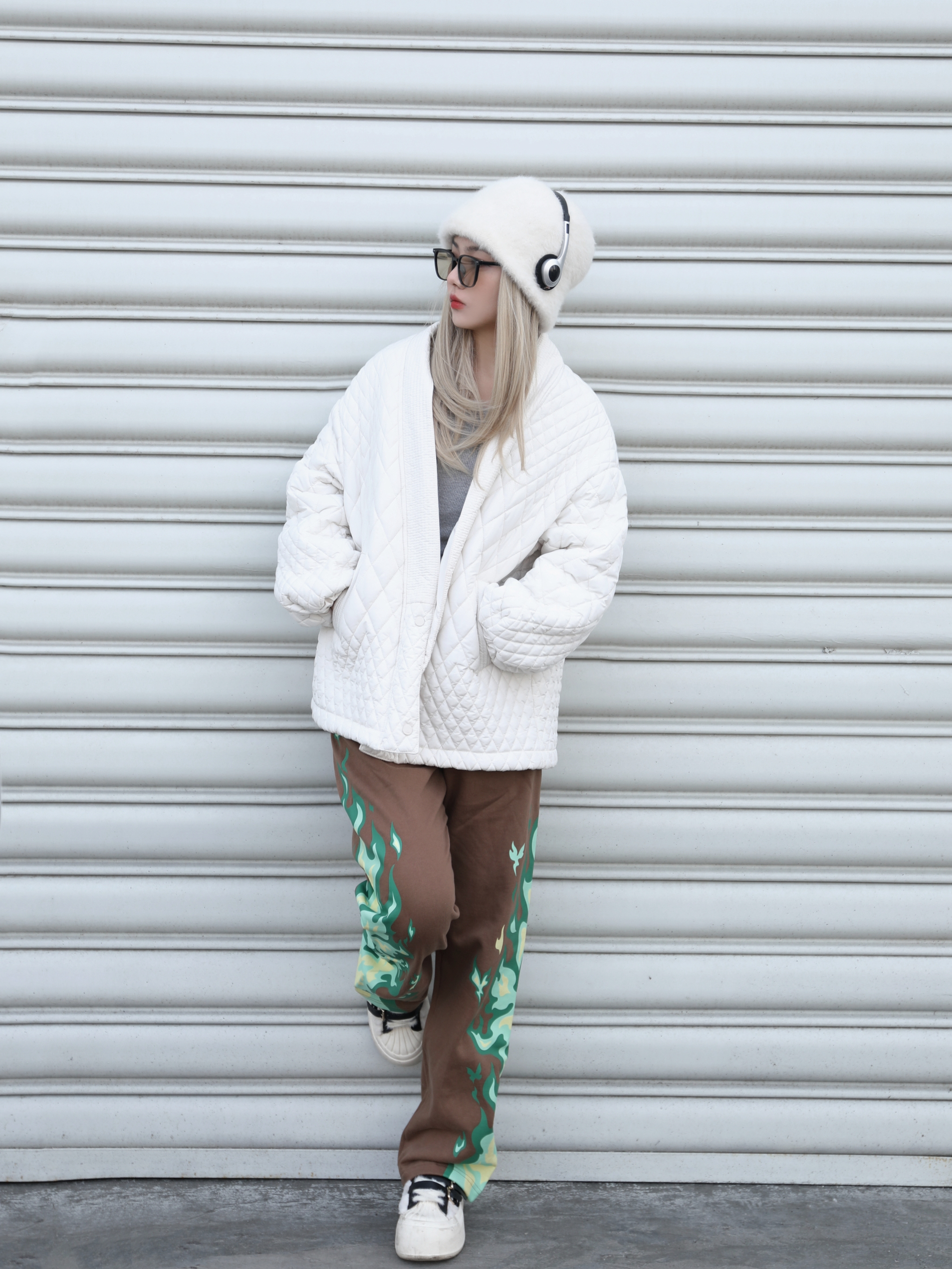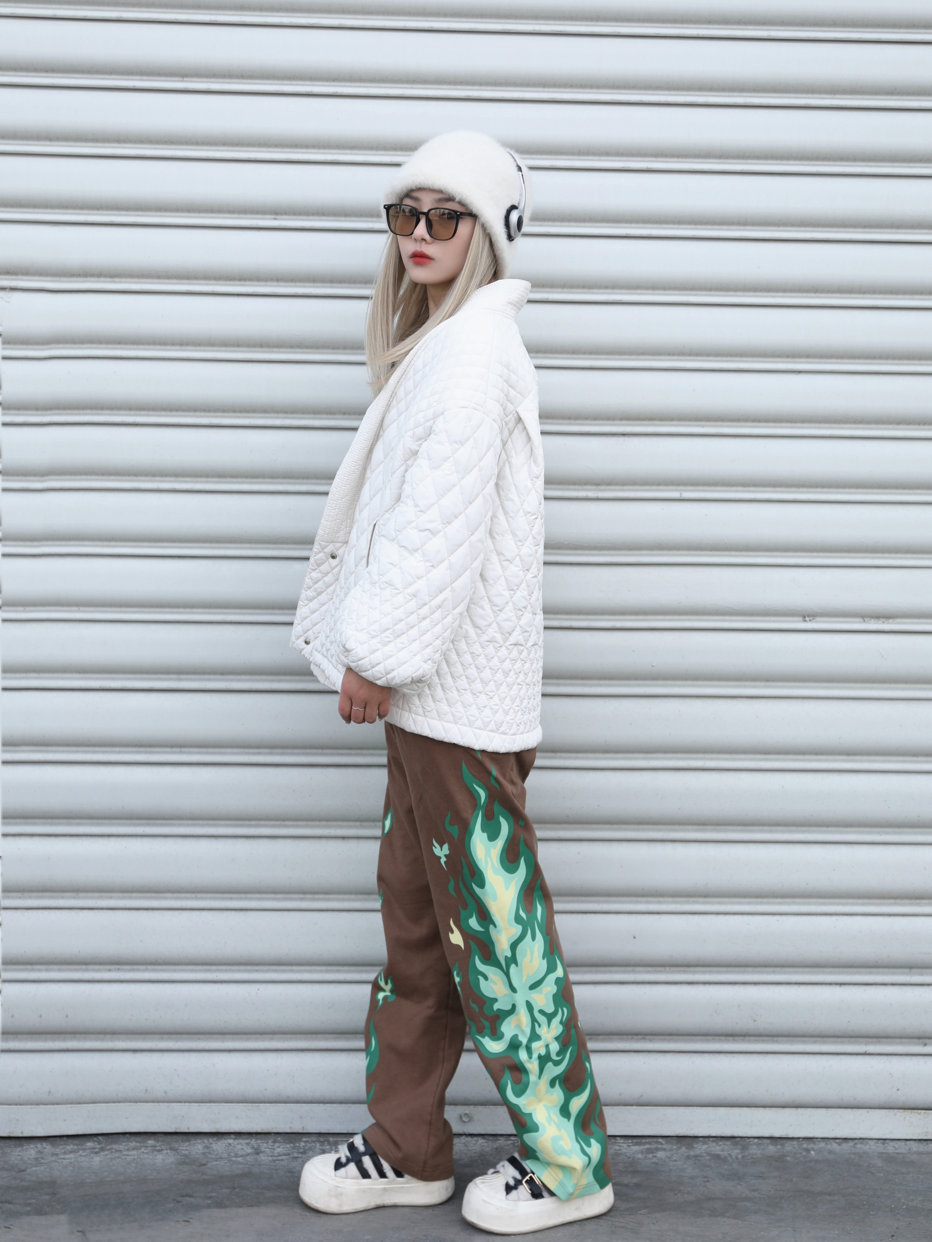 今日份的我的穿搭分享哈哈哈哈 我今天上身穿了一个白色短款棉服 搭配了 slamble 咖啡色带火焰图案的直筒裤👖 冬天这么穿真的又暖和又酷酷哎 加绒的直筒裤冬天穿一点也不冷、面料也很舒服 火焰🔥图案好炫呀、平常日常休闲穿它很舒服 我的身高是163、体重50公斤 穿这个裤子是s码的!可以给大家一个参考 上衣:实体店 裤子:slamble 鞋子:EYGPAP