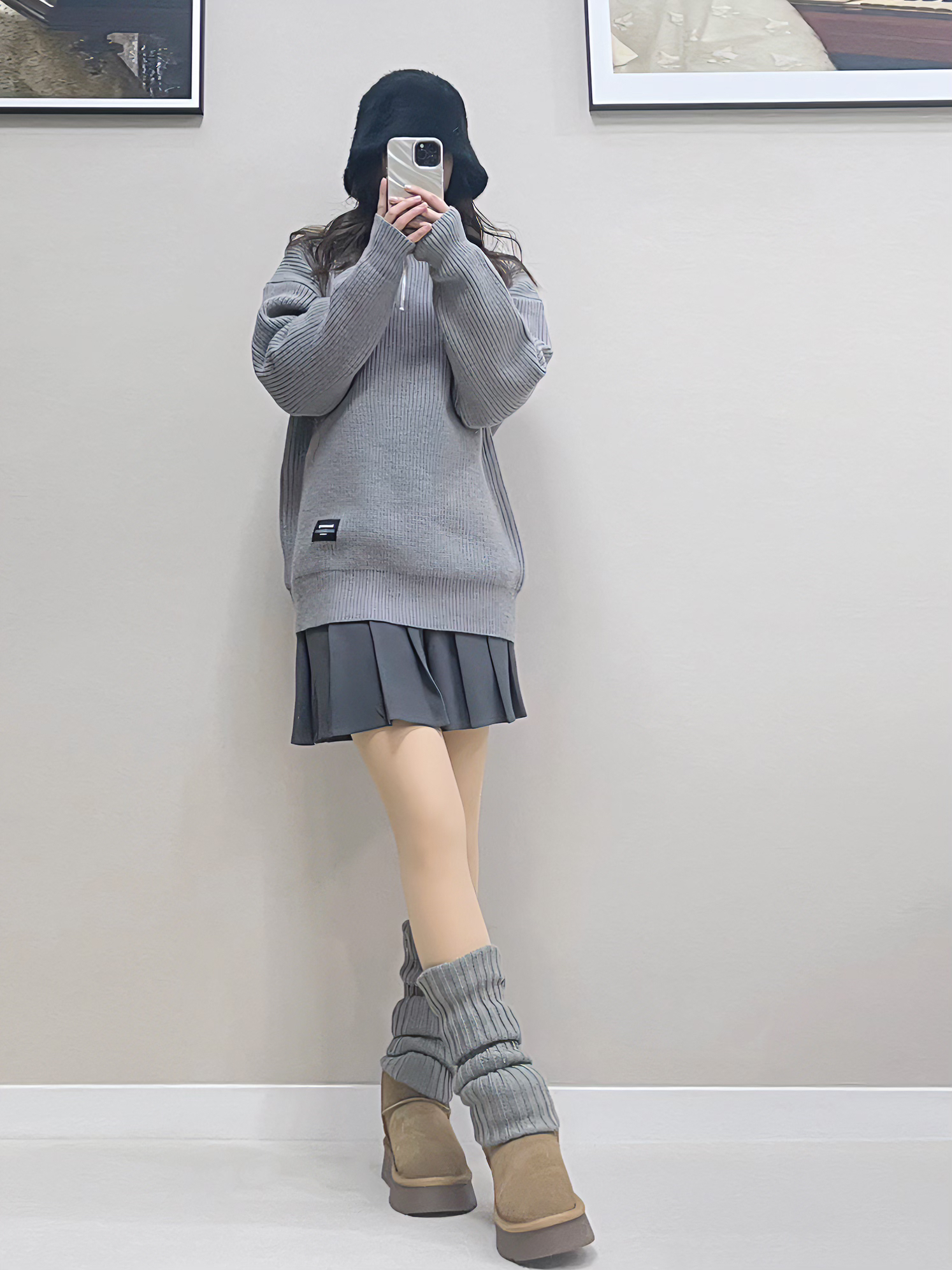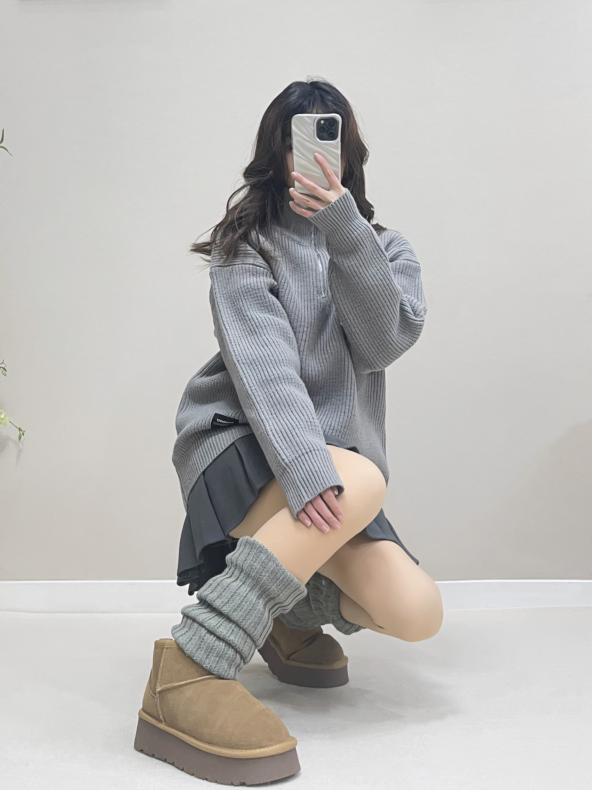 今日份灰色针织毛衣+灰色短裙+雪地靴💕 这件毛衣领口是高领的,这个领可立领可翻领,拉链直接拉起来的我很喜欢,很挡风✨✨上身是比较宽松休闲的感觉! 搭配一条同色系短裙跟袜套,就有一丢丢的可爱😜再 穿一双雪地靴完美解决温度问题啦!
