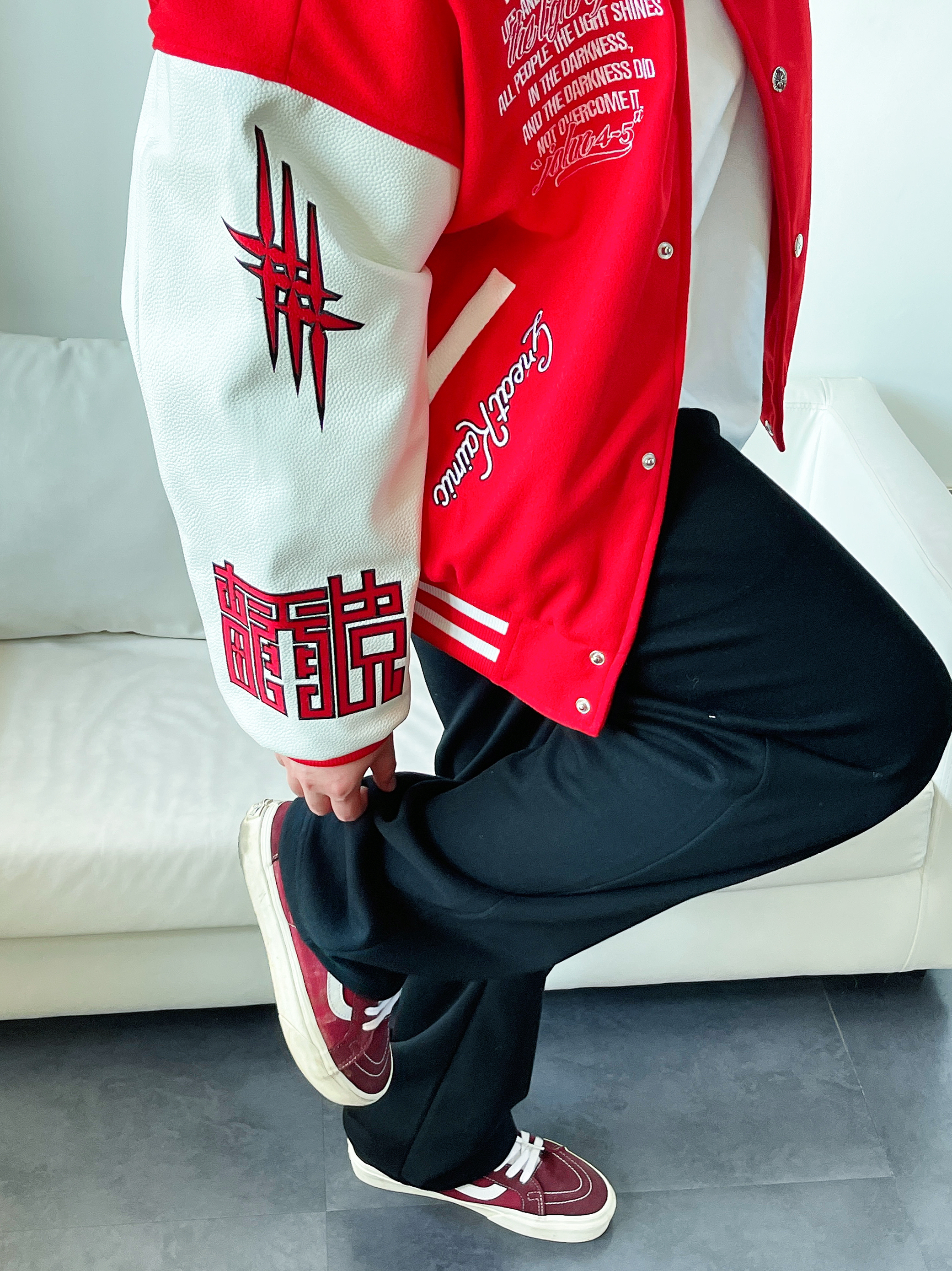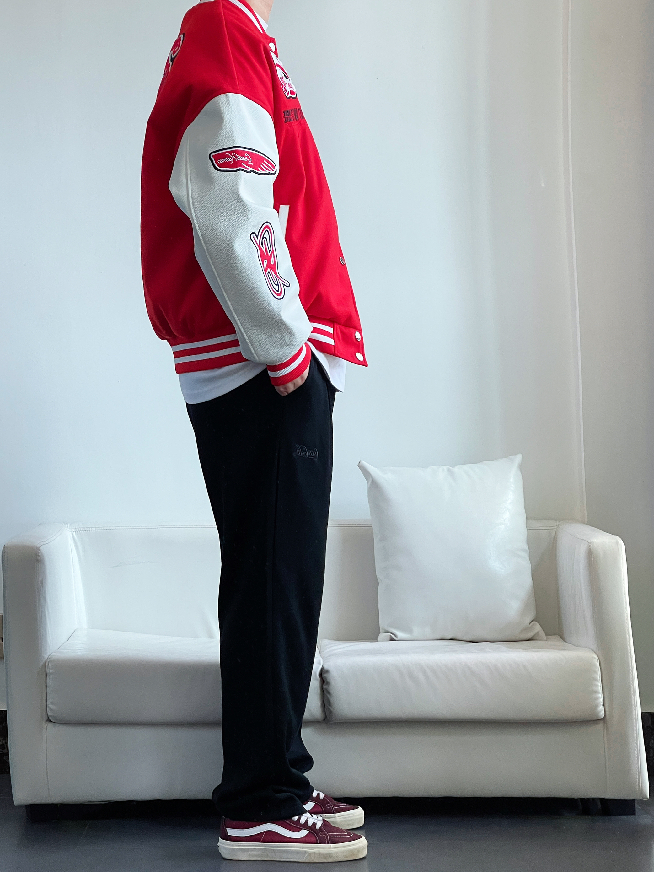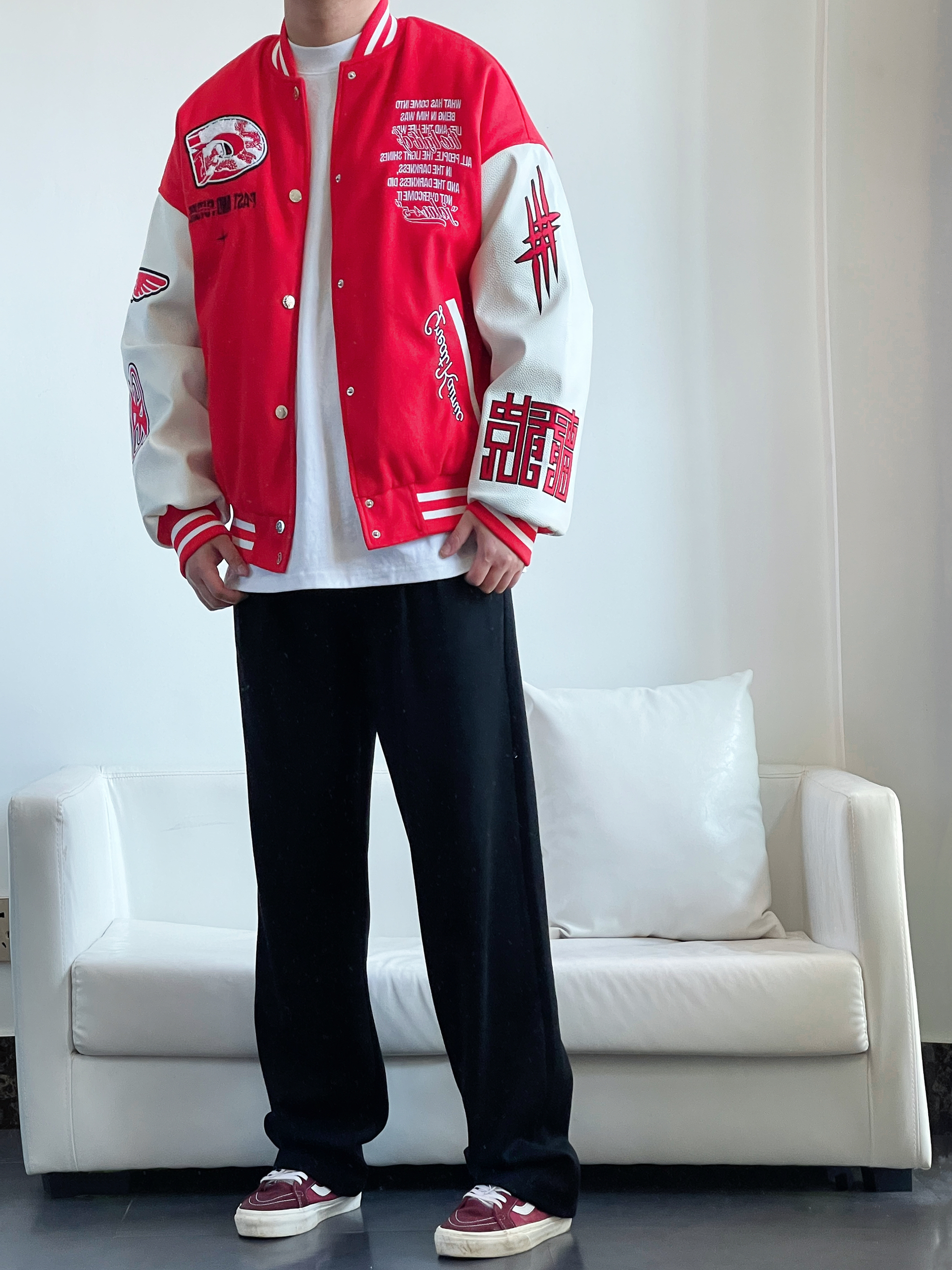 好看的穿搭 往往是最简单的色彩搭配 红色搭配黑色 高级又鲜艳 真的会❤️ 大红色棒球服 拼接白皮袖 红白撞色突出立体刺绣🐉 搭配一条黑色直筒裤 垂感十足显高显腿长 鞋子与上身颜色呼应 身高丨体重丨尺码 : 178丨90kg丨XL 👔 : CRKC 👖 : Coca-Cola 👟 : Vans