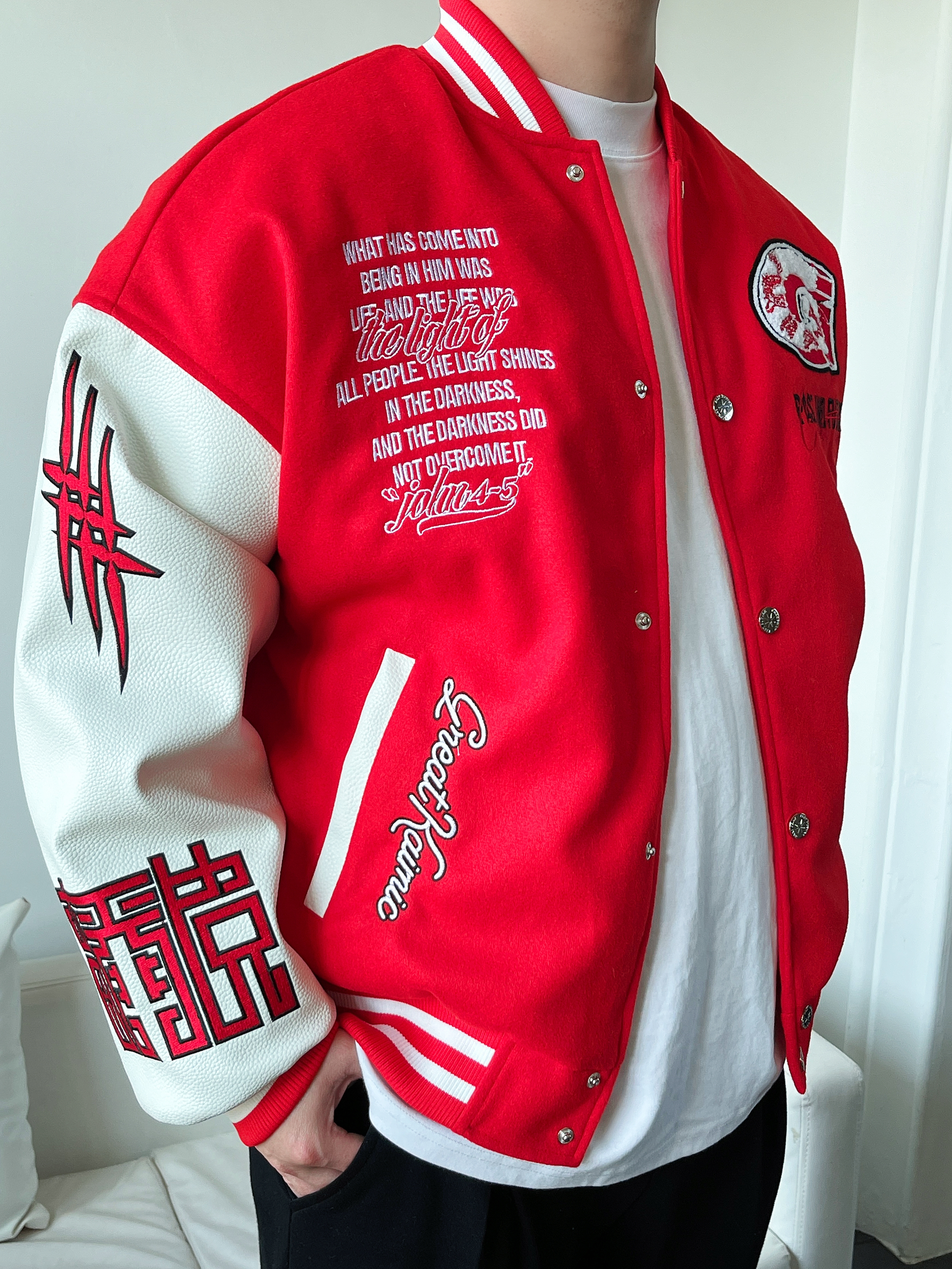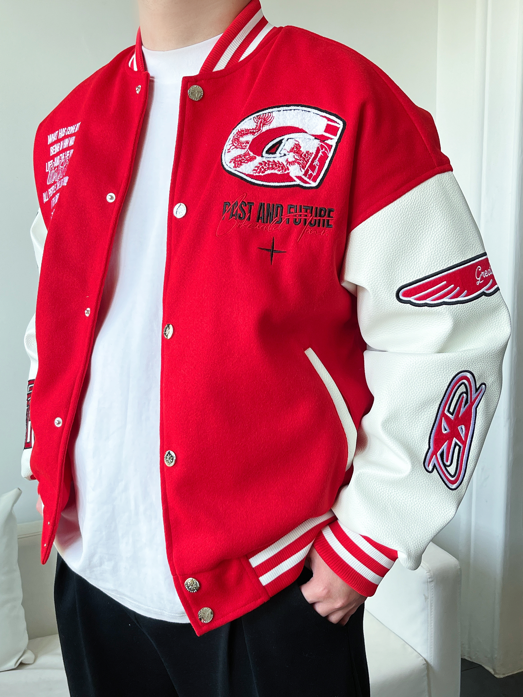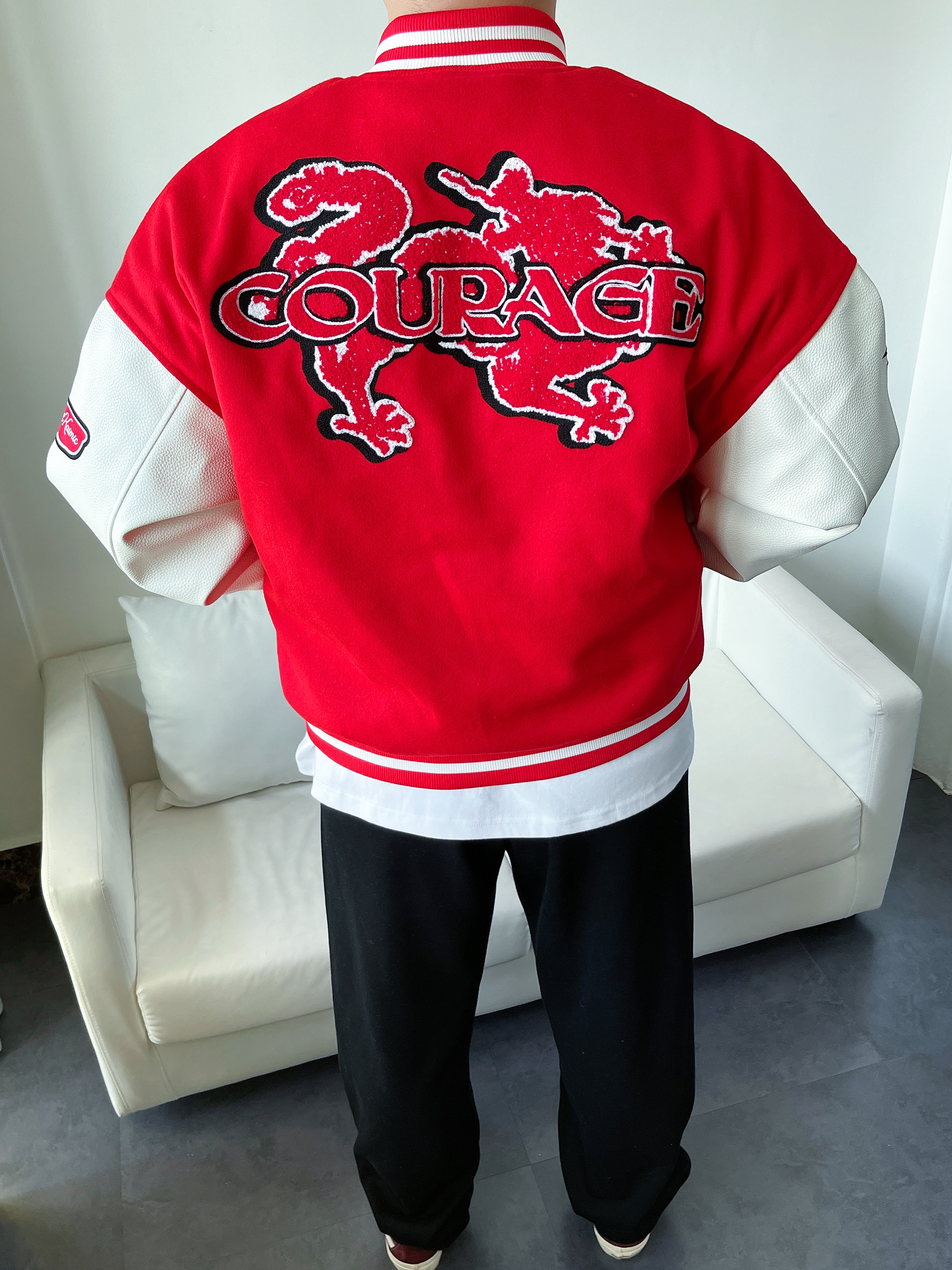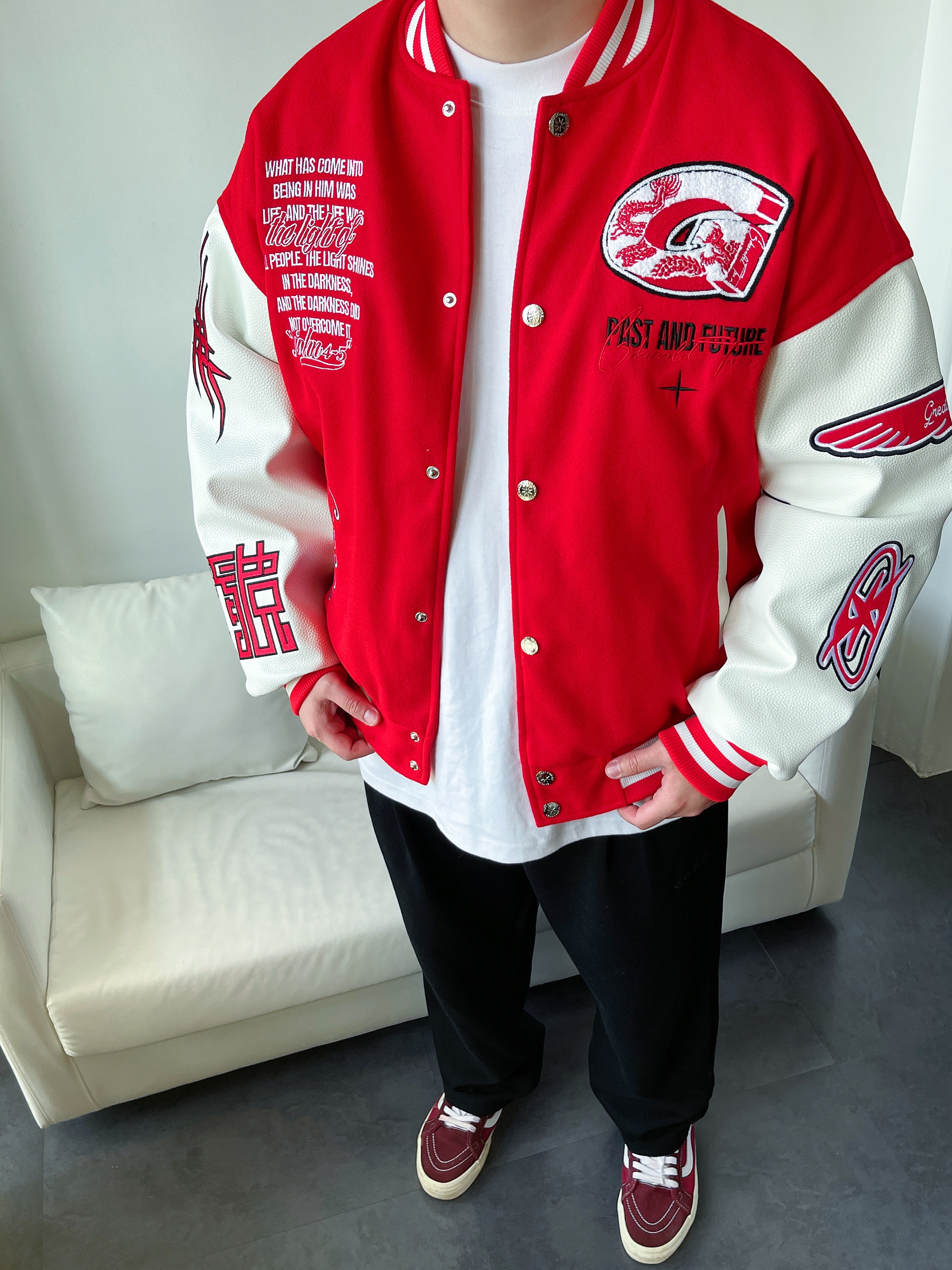 好看的穿搭 往往是最简单的色彩搭配 红色搭配黑色 高级又鲜艳 真的会❤️ 大红色棒球服 拼接白皮袖 红白撞色突出立体刺绣🐉 搭配一条黑色直筒裤 垂感十足显高显腿长 鞋子与上身颜色呼应 身高丨体重丨尺码 : 178丨90kg丨XL 👔 : CRKC 👖 : Coca-Cola 👟 : Vans