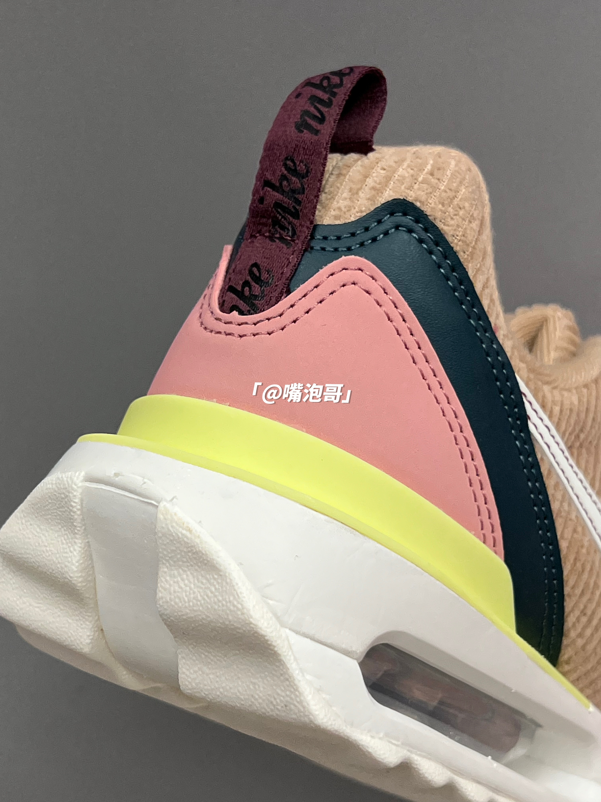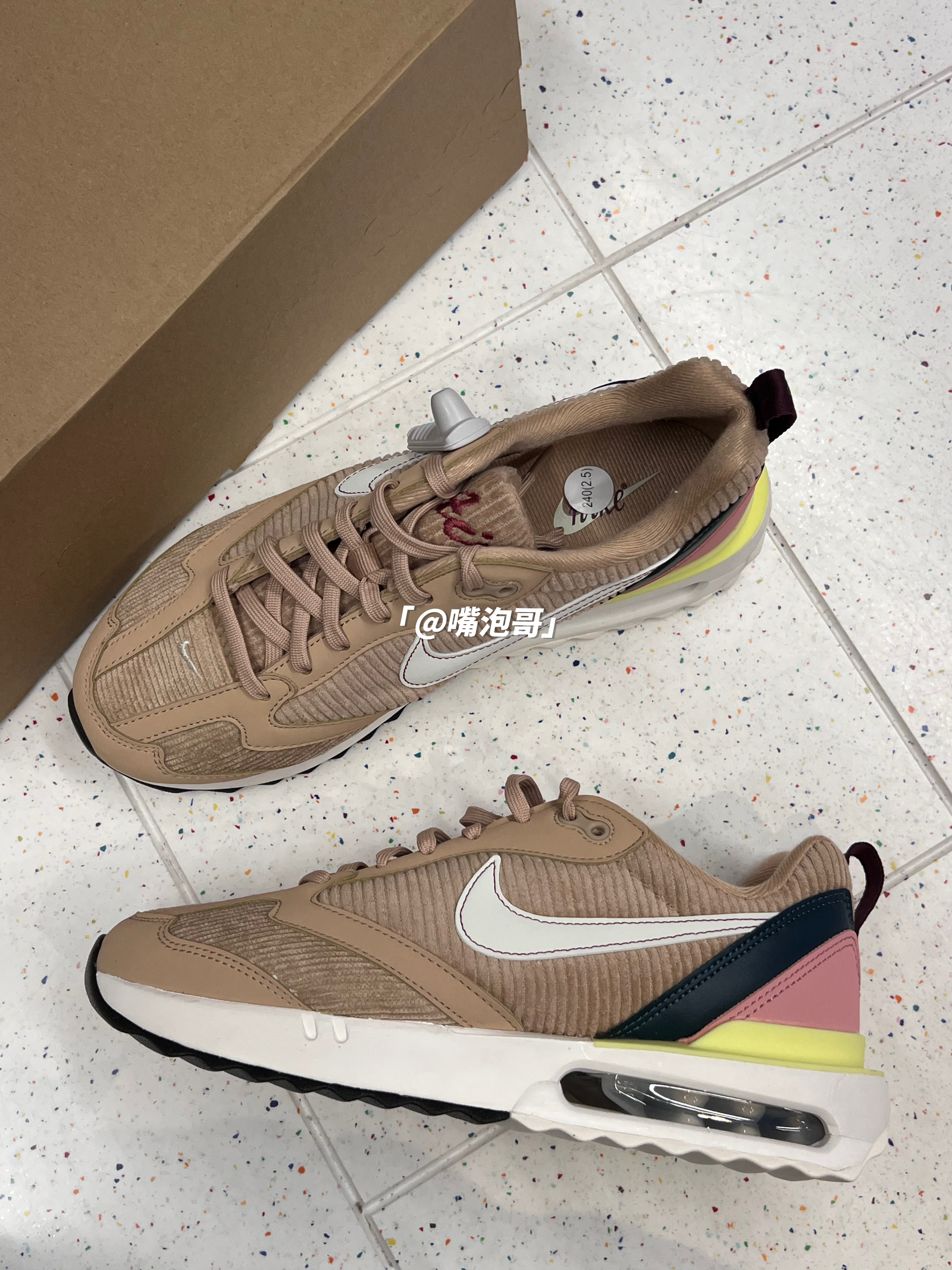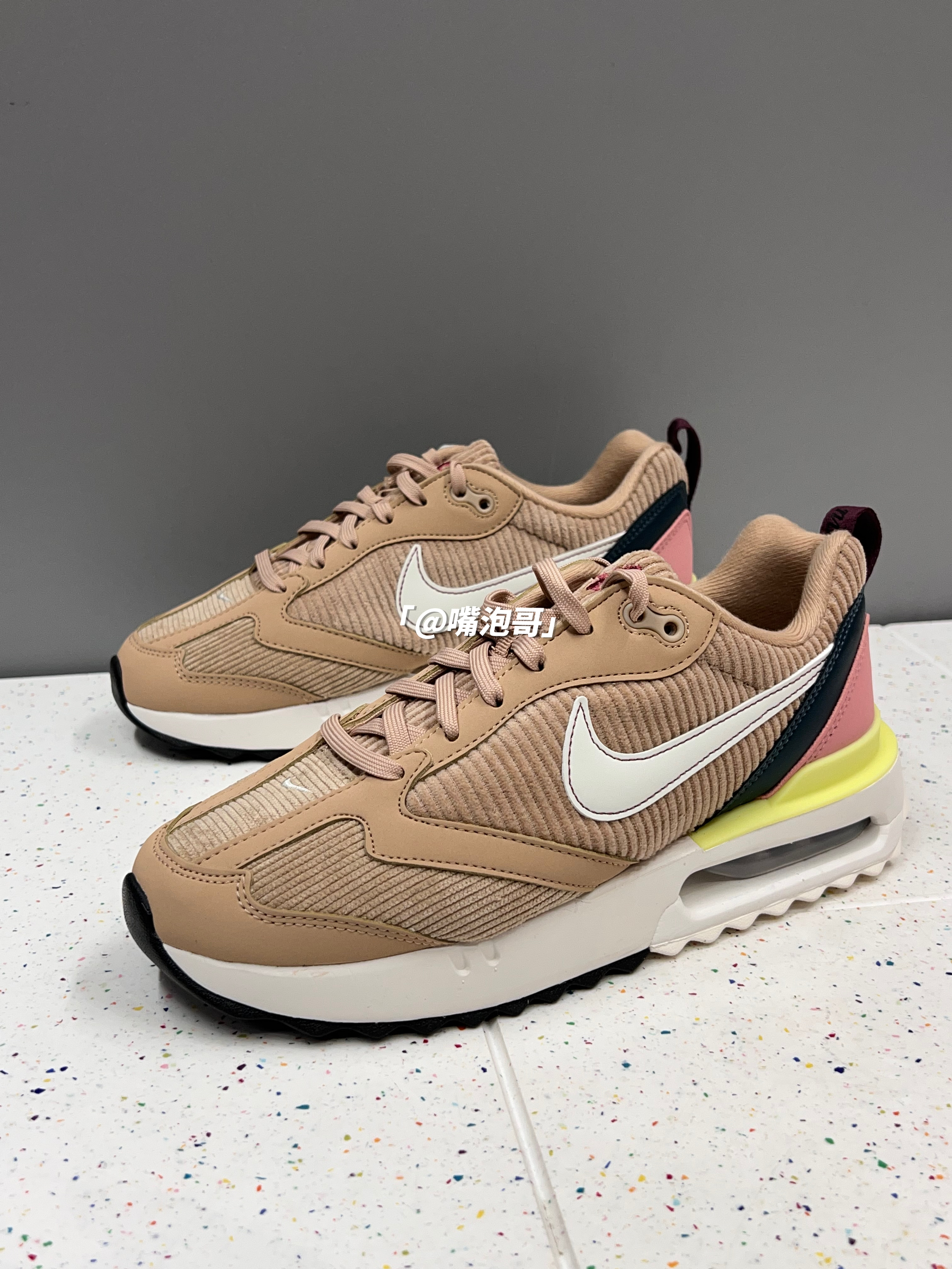 👟:Air Max Dawn 古铜色 简介: 鞋子是Air Max Dawn 系列的休闲鞋,整双鞋子选用了浅棕色作为主色调,还蛮适合冬季的美拉德穿搭,同时又加入了浅粉色与黑色装饰,增加了色彩层次,灯芯绒材料制作的鞋面很具有质感,搭配上中底双缓震中底,整体上脚有着良好的脚感。 细节: 鞋面、鞋舌都采用了具有质感的灯芯绒布打造而成,冬季穿有一定的保暖效果,鞋身两侧的swoosh选用了白色制...