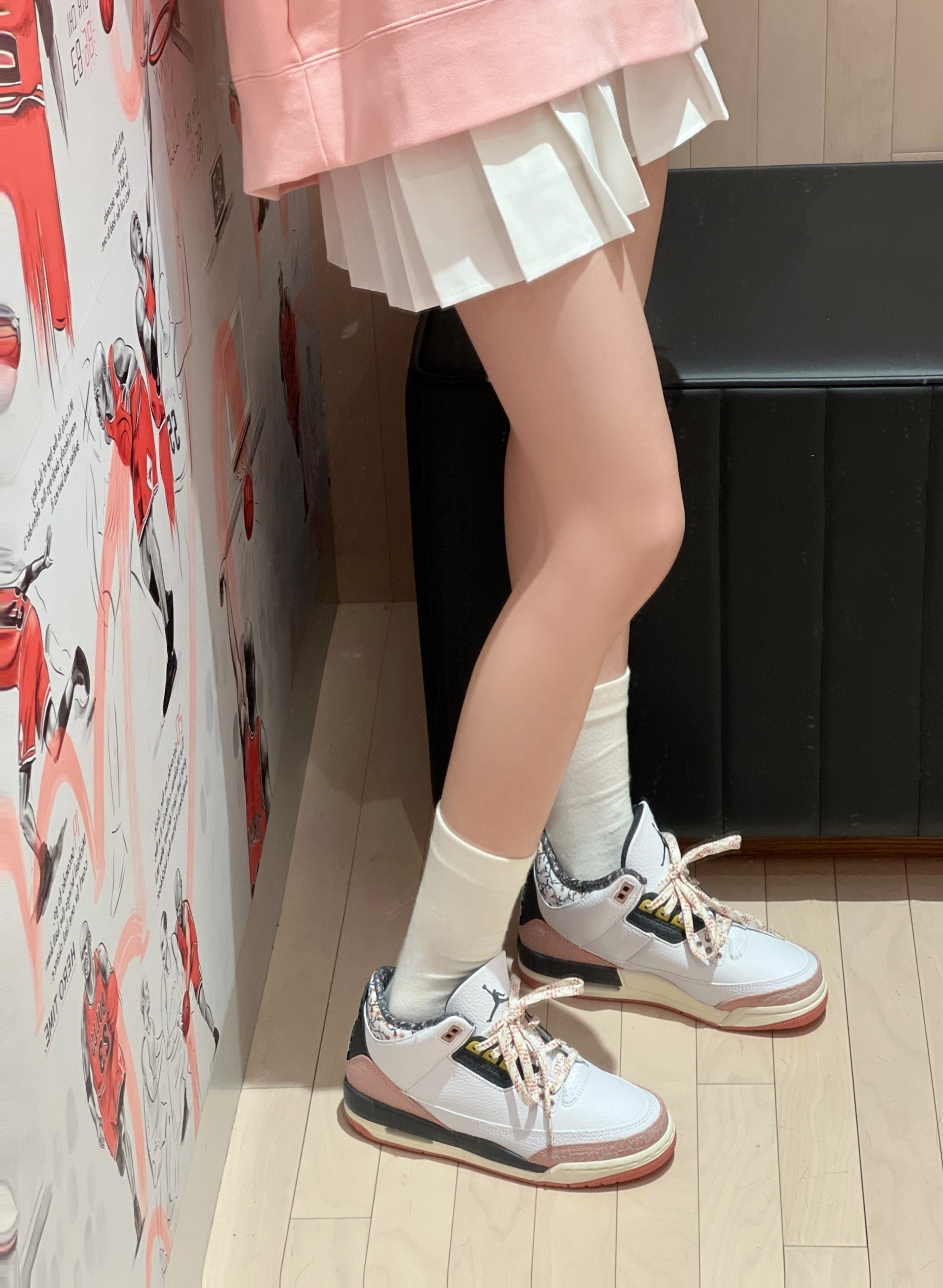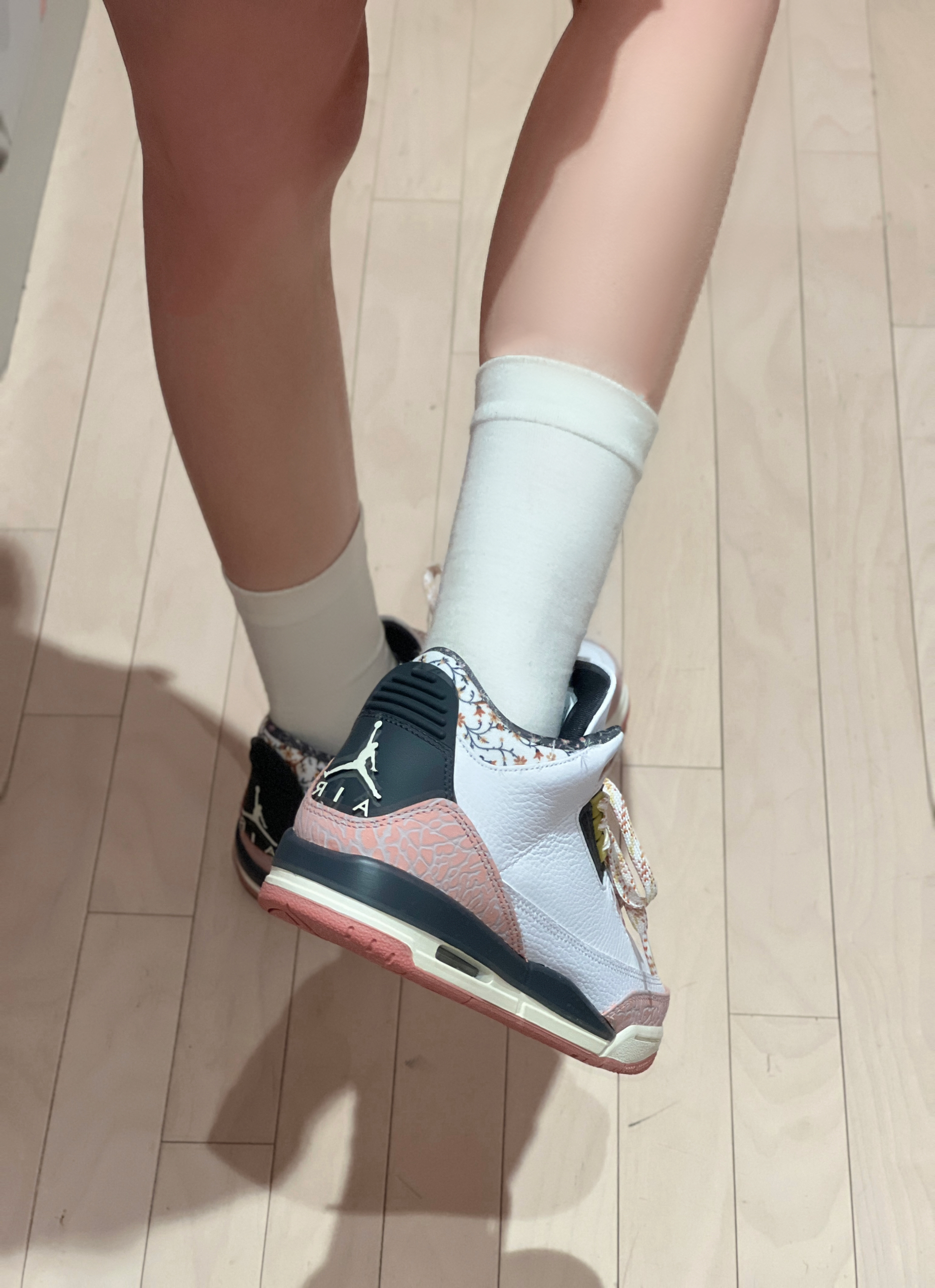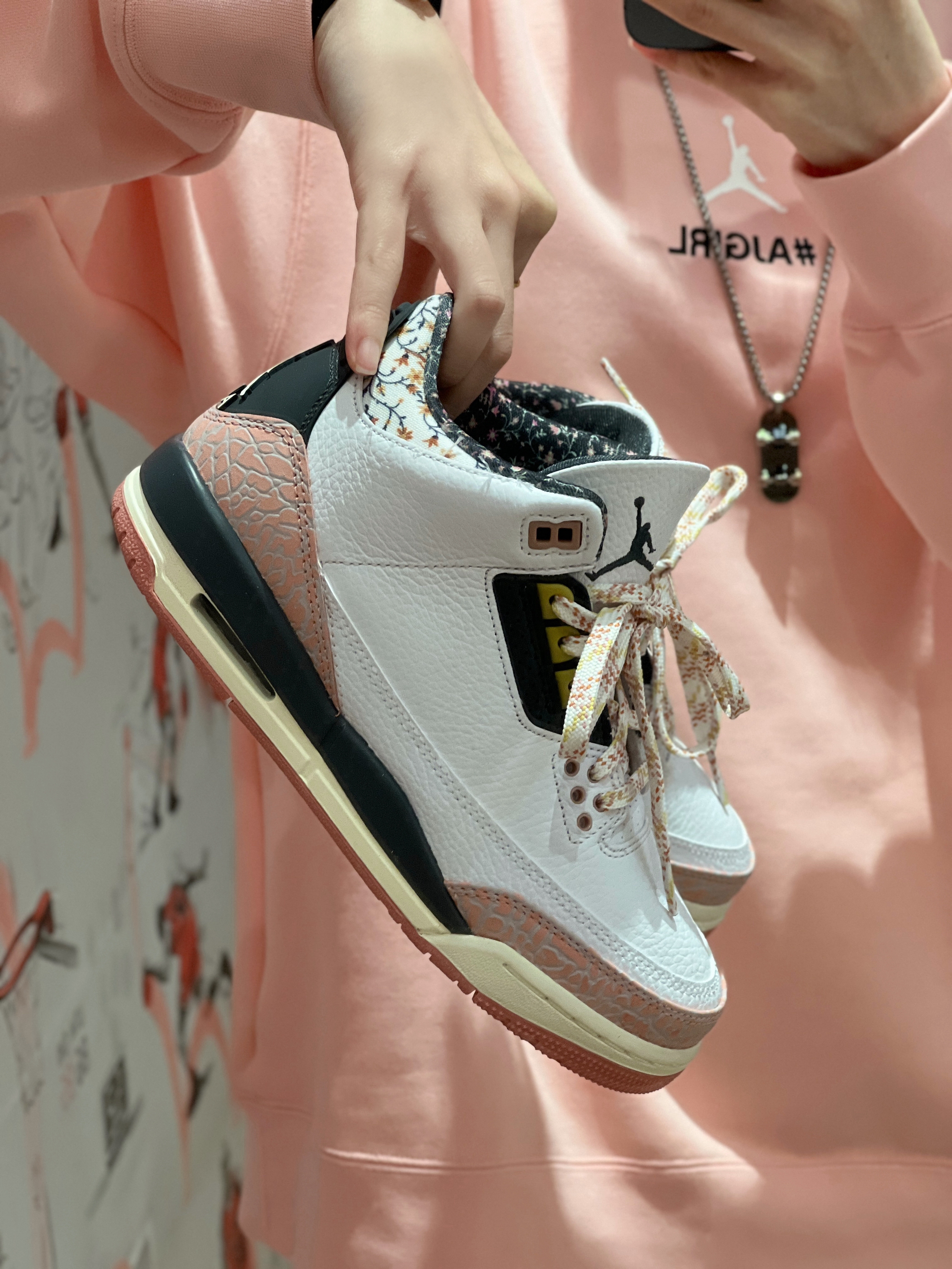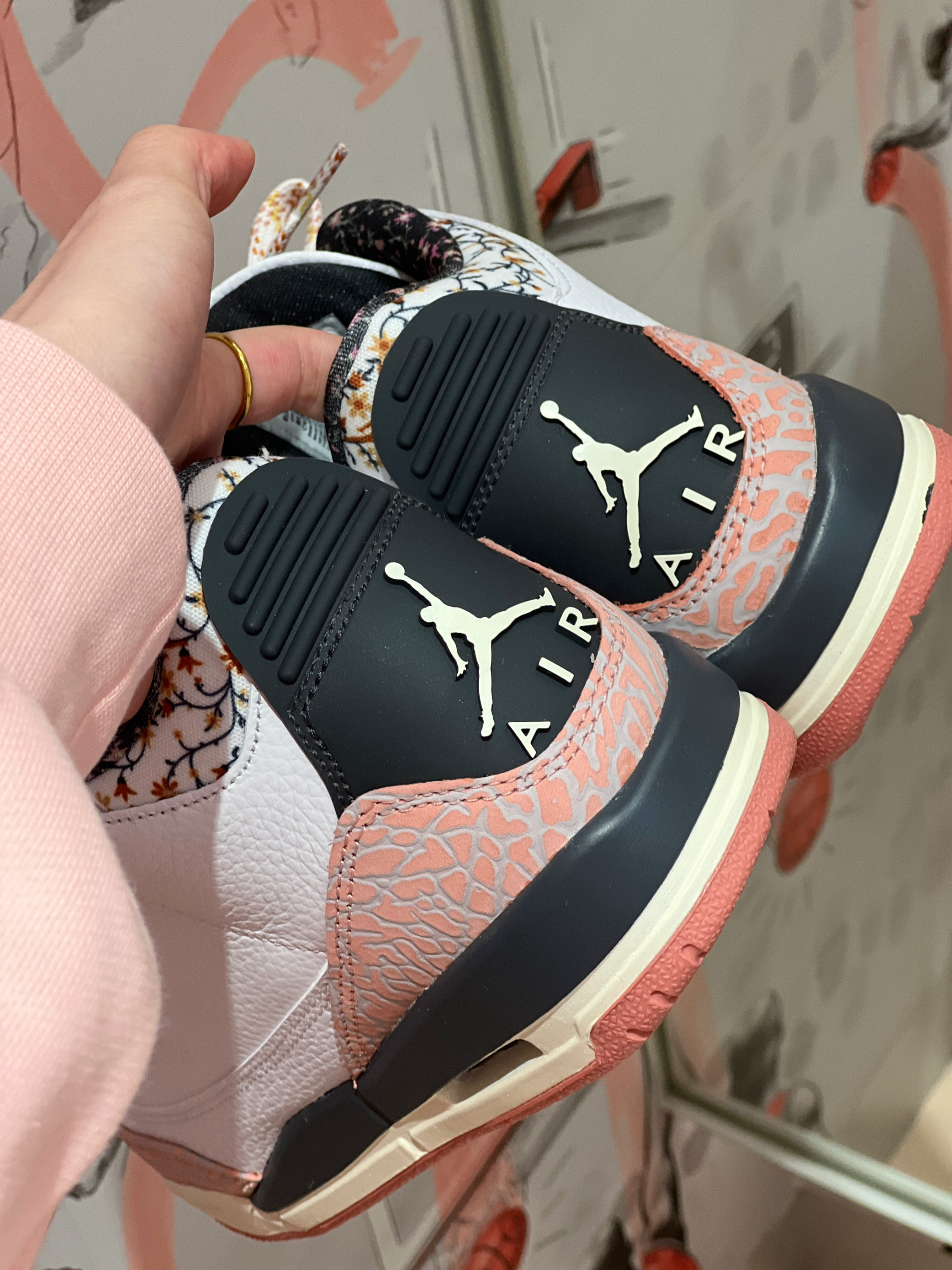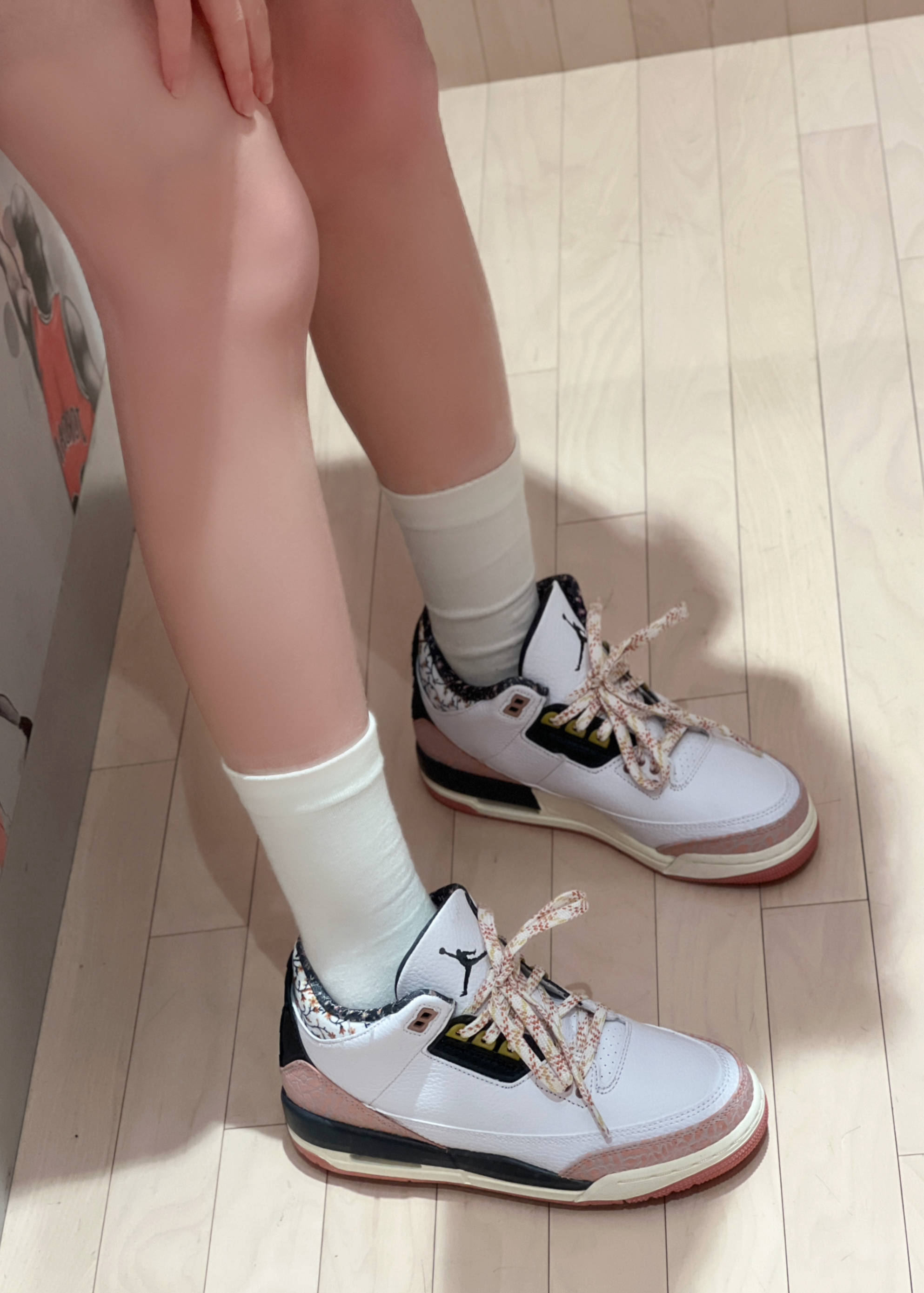 今天分享是款Aj3花卉专属配色一眼就爱上啦🥰 整体是白粉设计鞋面整体是荔枝皮 质感不错👍 粉色的爆裂纹 后跟还有特别的花卉以及鞋内衬都是有超特别滴!! 少女心满棚💕