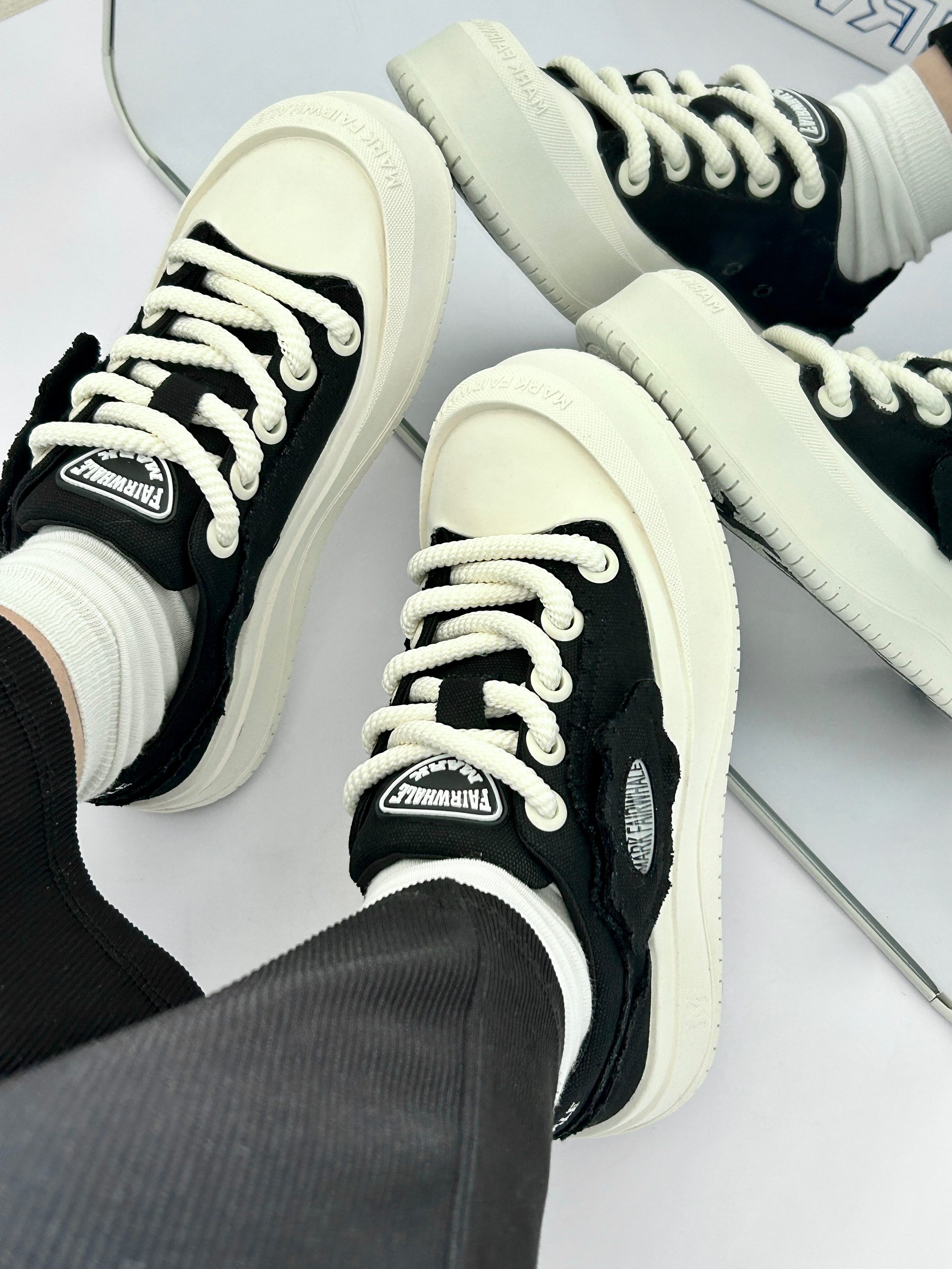 黑白经典配色 不管搭配短裤,长裤,牛仔裤,休闲裤,运动裤 只要你能想到的裤子 就能搭配 而且设计独特,细节致胜 大爱的一款帆布潮鞋 来自马克华菲品牌 超级推荐