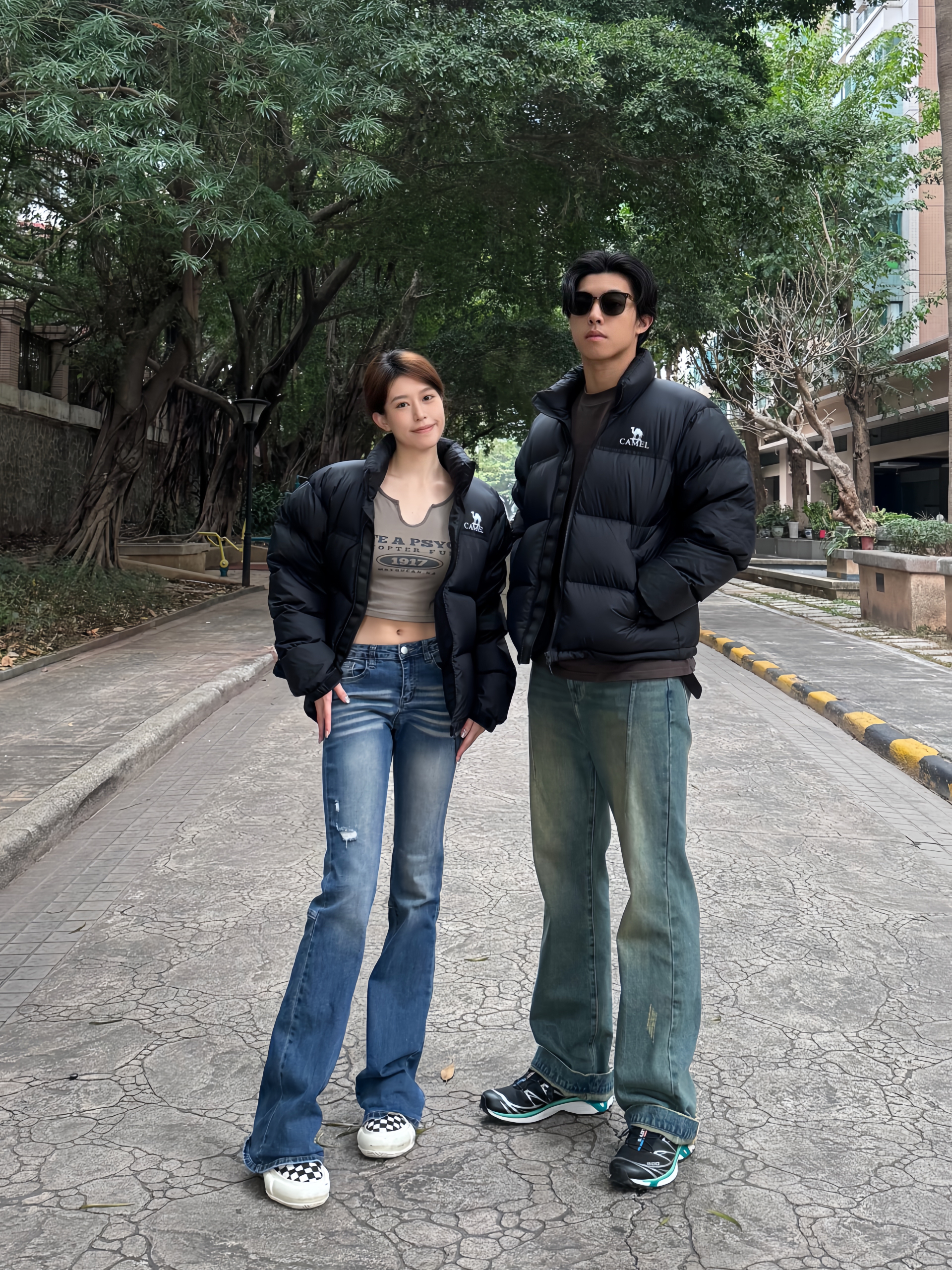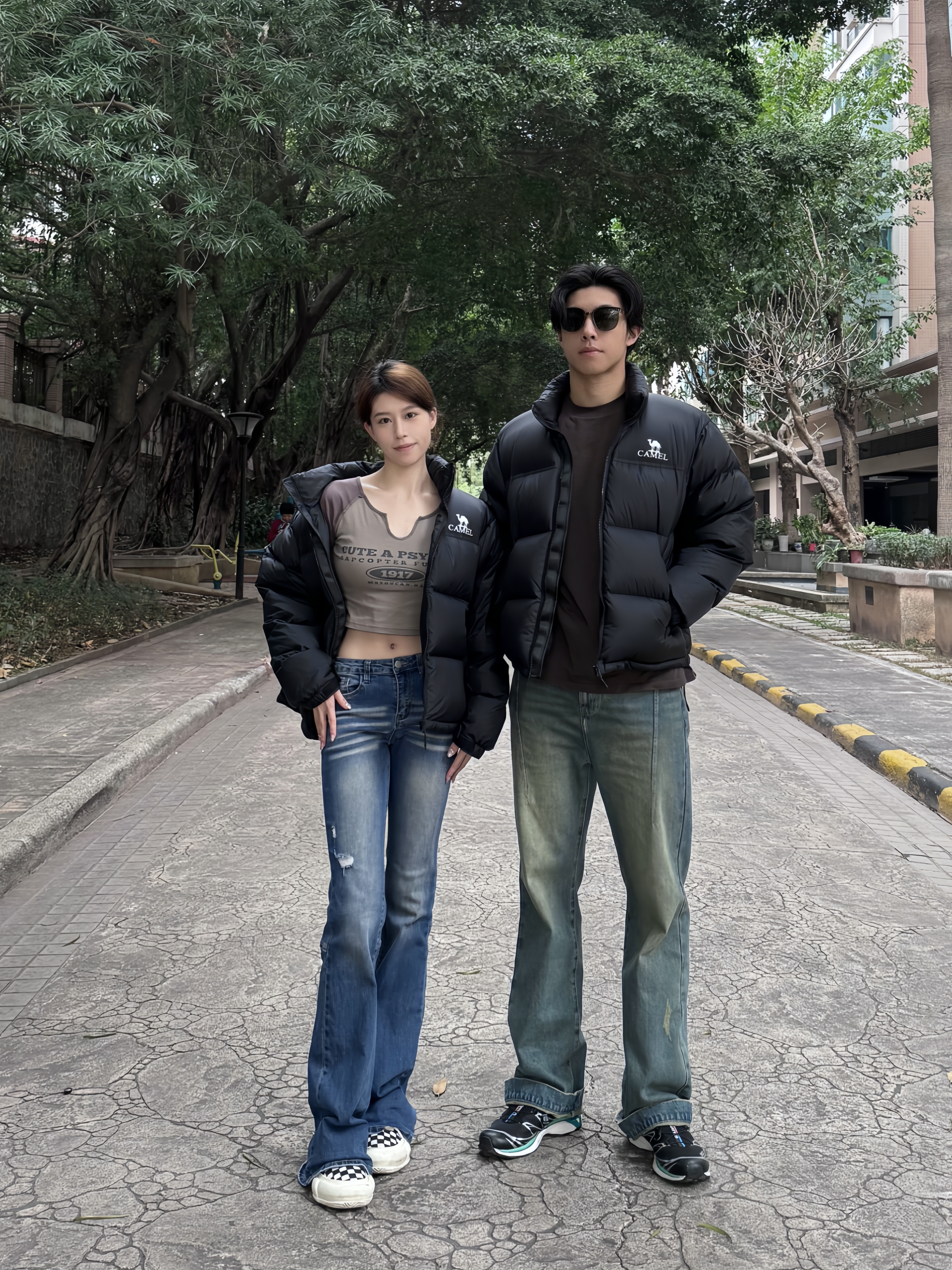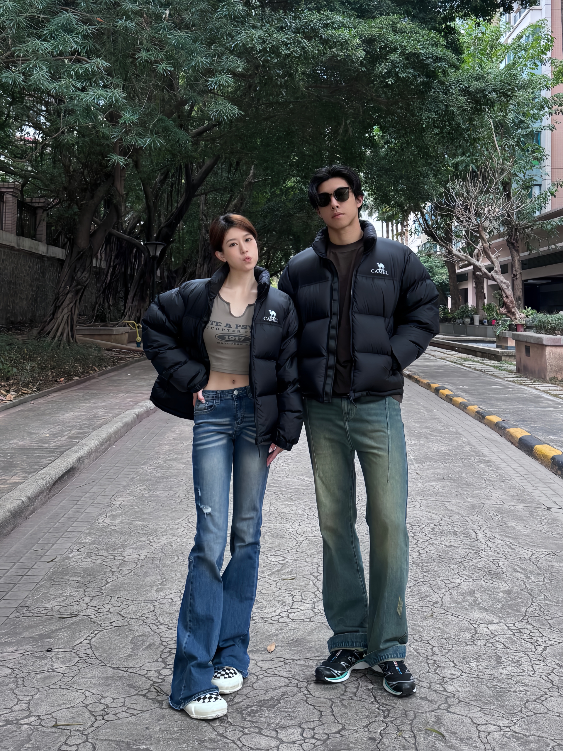 今天穿的是情侣骆驼羽绒服 短款设计尊嘟好显腿长 穿上也不会显臃肿!