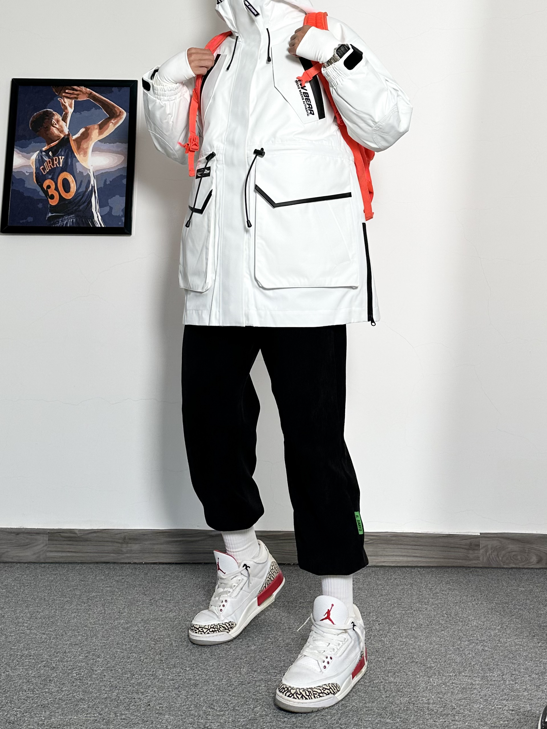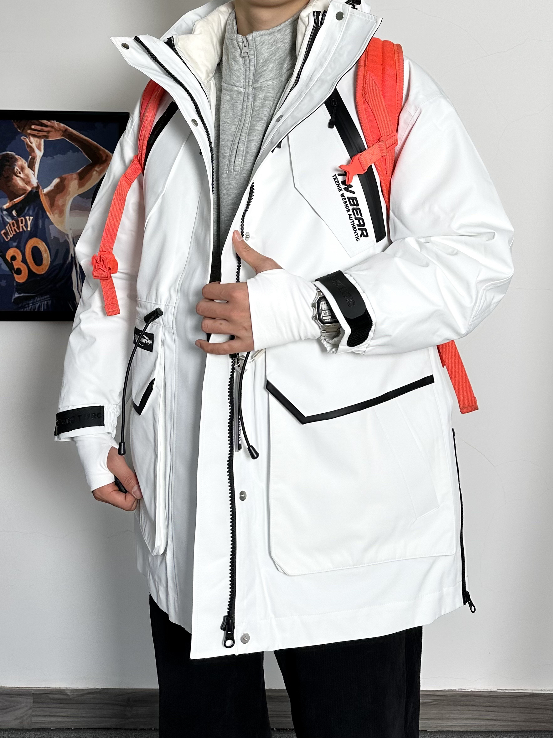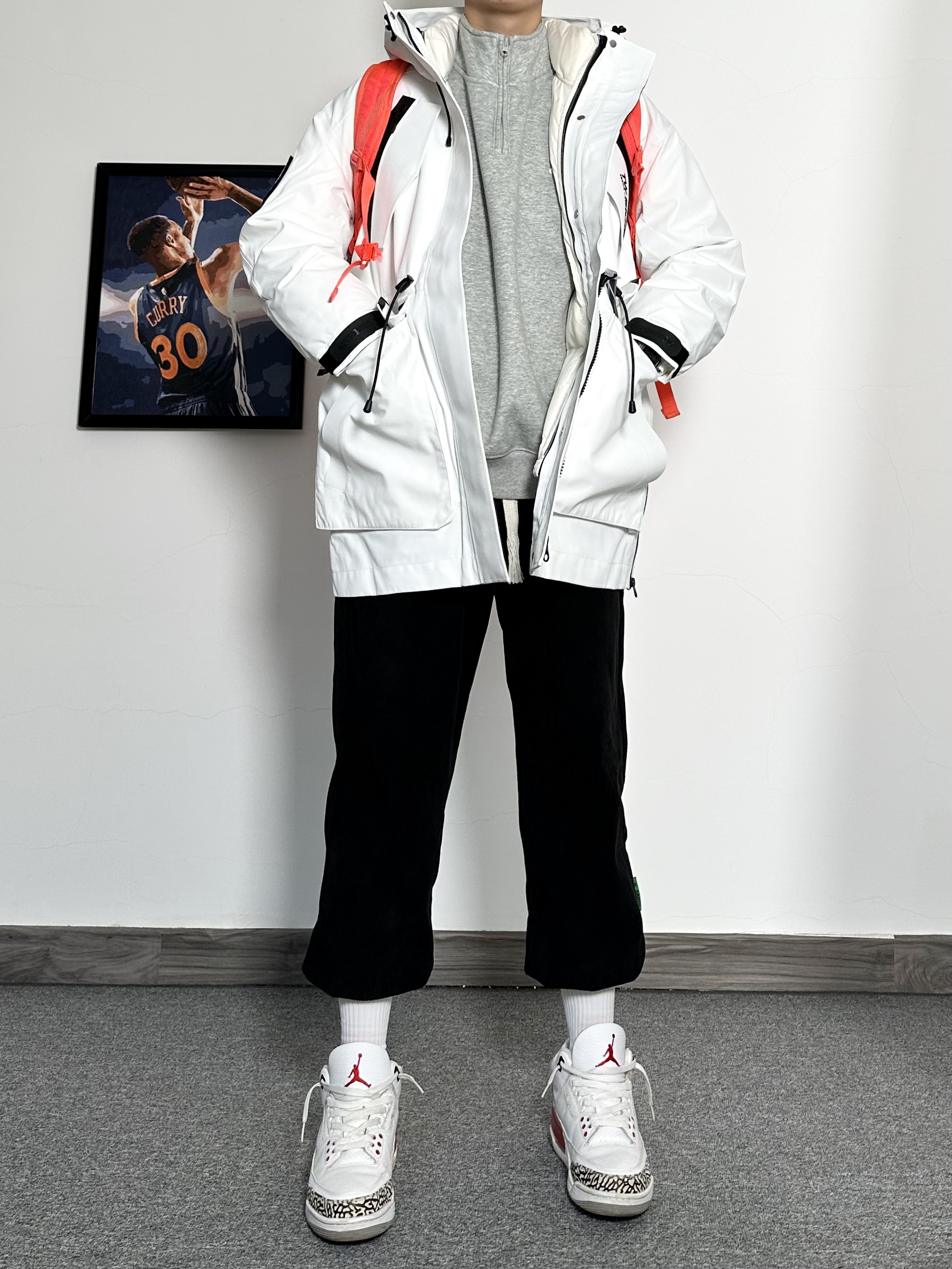 户外三防冲锋衣真的很帅男生穿简直杀疯了 内置羽绒打底保暖效果一绝 外套的冲锋衣材质是防风防水的 冬天去户外滑雪活动都是OK的 搭配上一条加绒灯芯绒卫裤黑白搭配yyds 最后再穿上一双秋冬必备的运动鞋 这种冬季美式户外穿搭我可太喜欢了