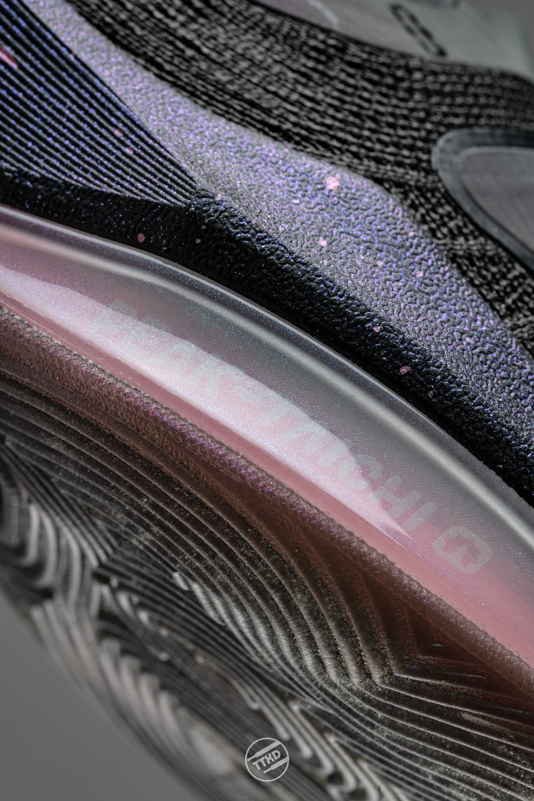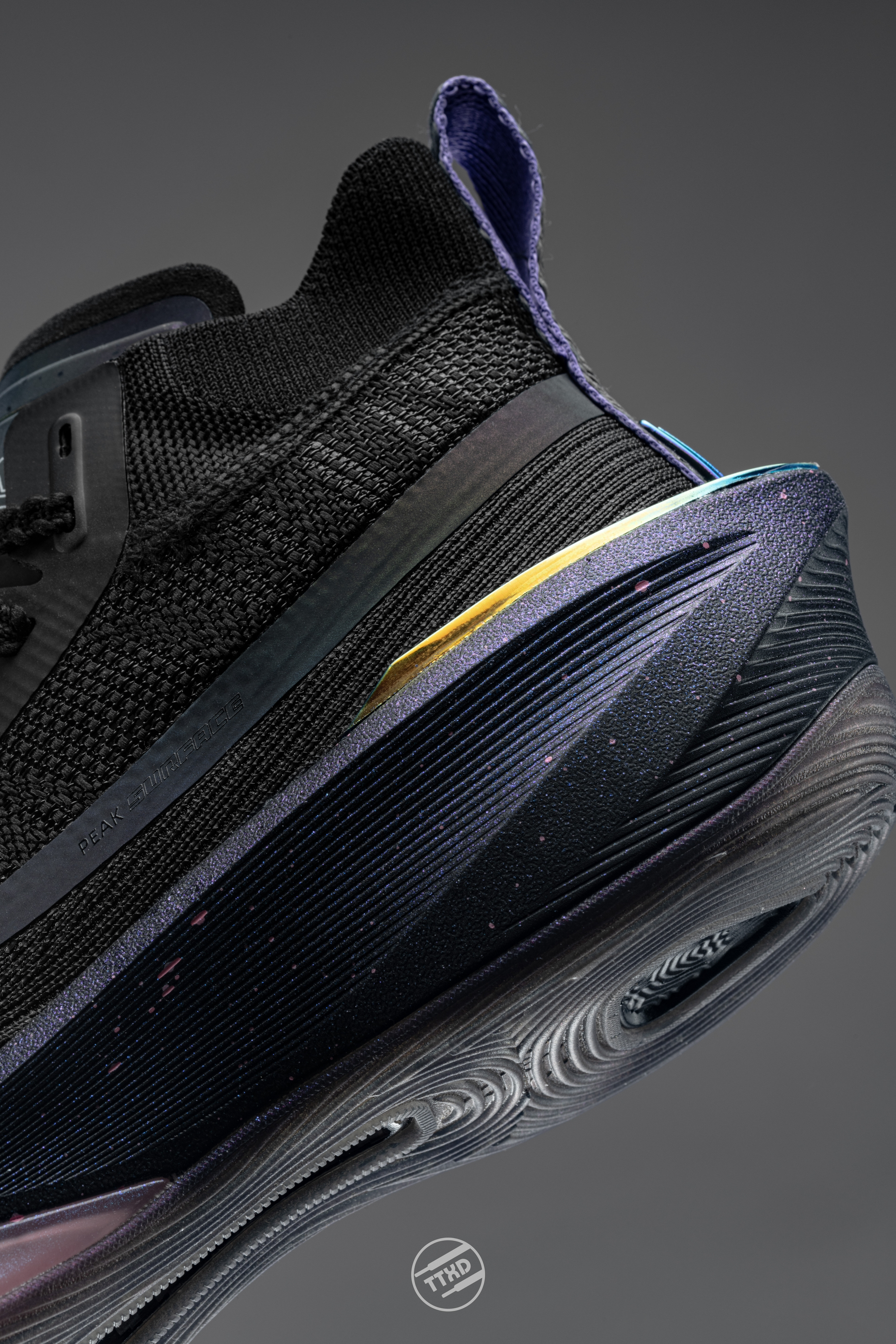 之前见到大三角的时候就感觉事情不会这么简单,果然力都发在Pro版本上了。 除了鞋帮在视觉上会有点空以外,整双鞋都是满满的设计感,中底的造型凌厉到起飞,试穿之后发现前掌看似僵硬的鞋盖支撑也出奇的足,当然可能和我前脚掌宽度也有关系。 轻量化态极中底搭配前掌PSoon模块提供不那么傻软的缓震,延伸到前掌3/4处碳板和鞋头巧妙的上翘度又给鞋子一定的前向推进力的辅助。 当然我最喜欢的还是这块珠光效果的...