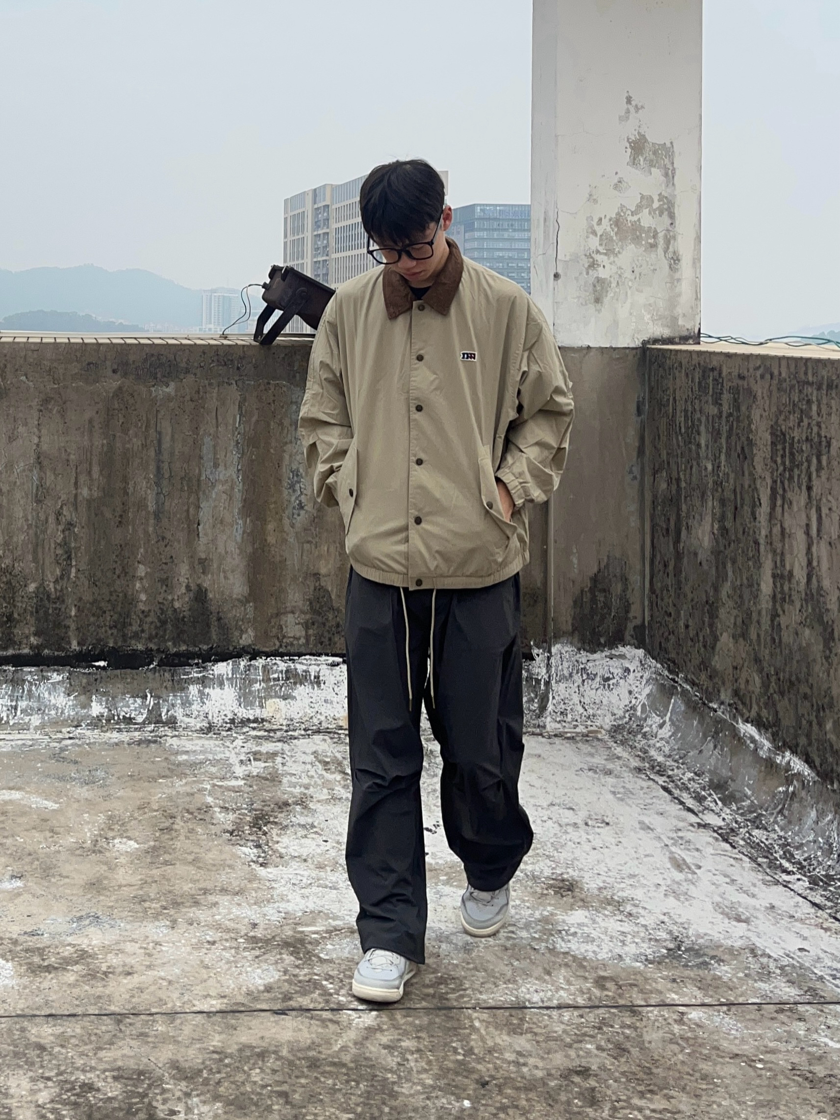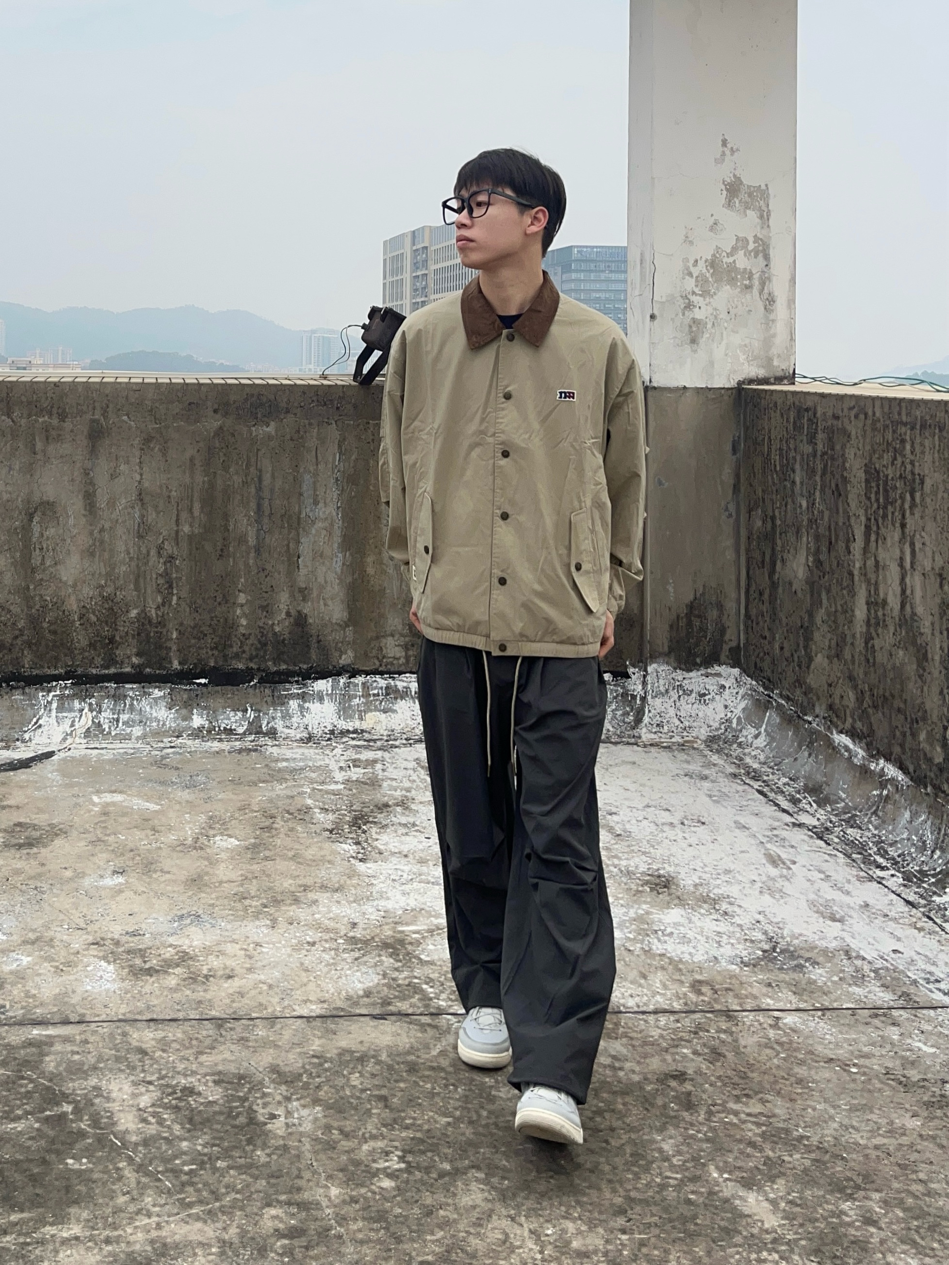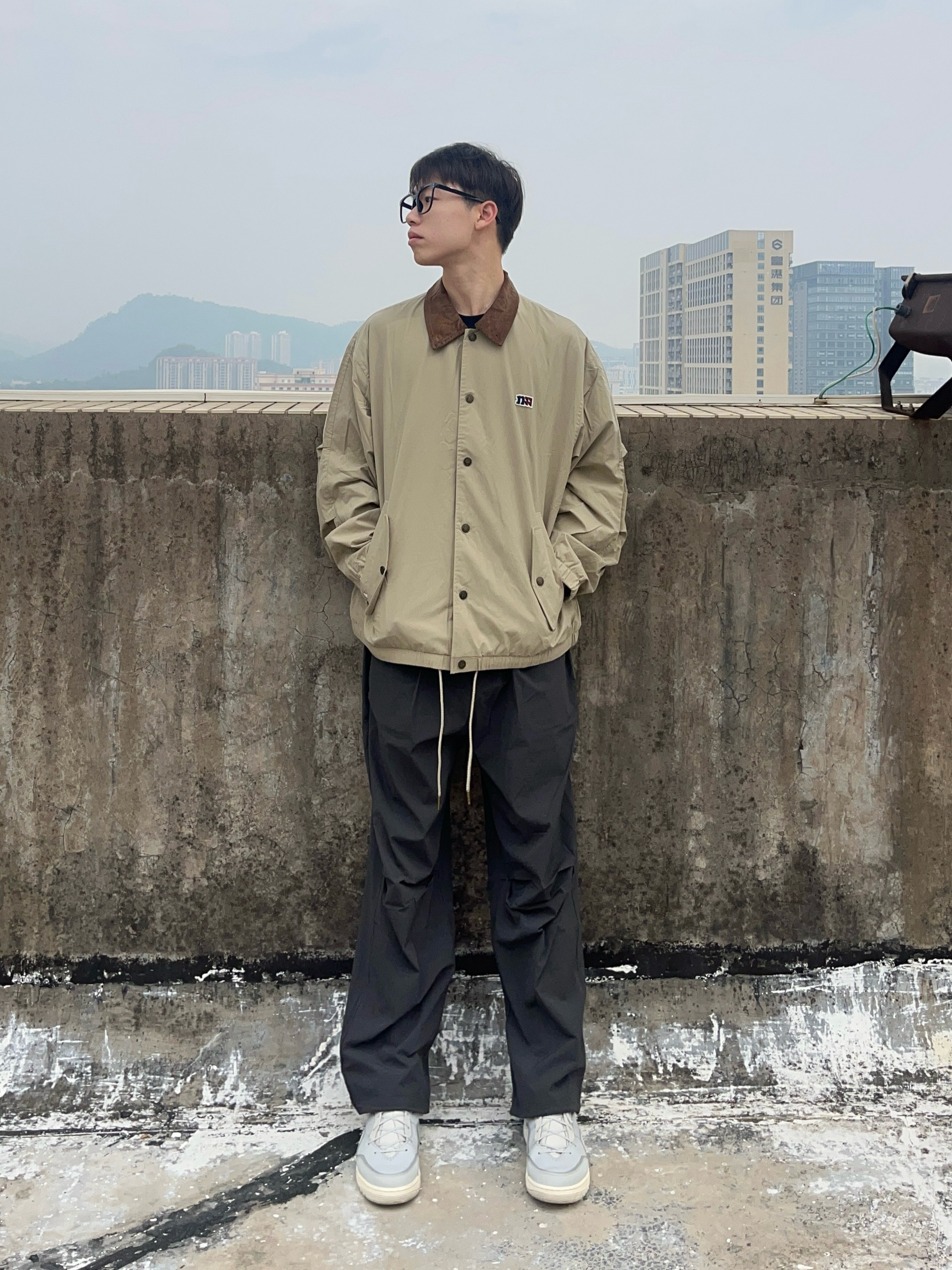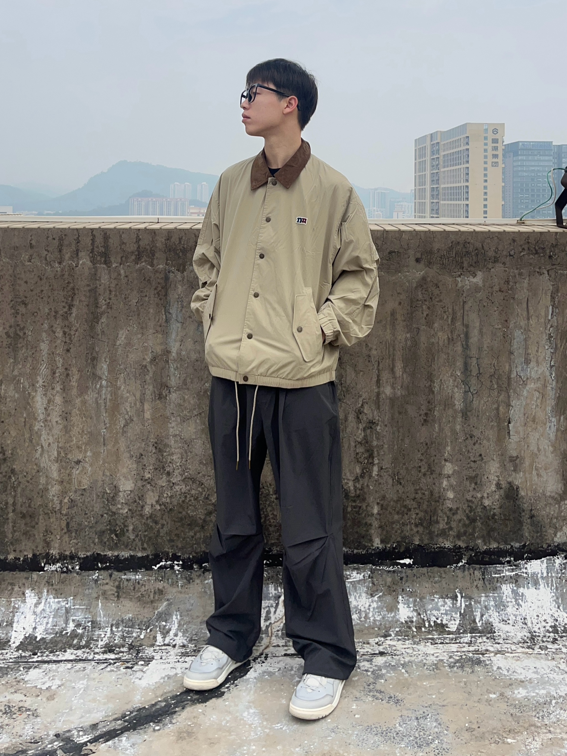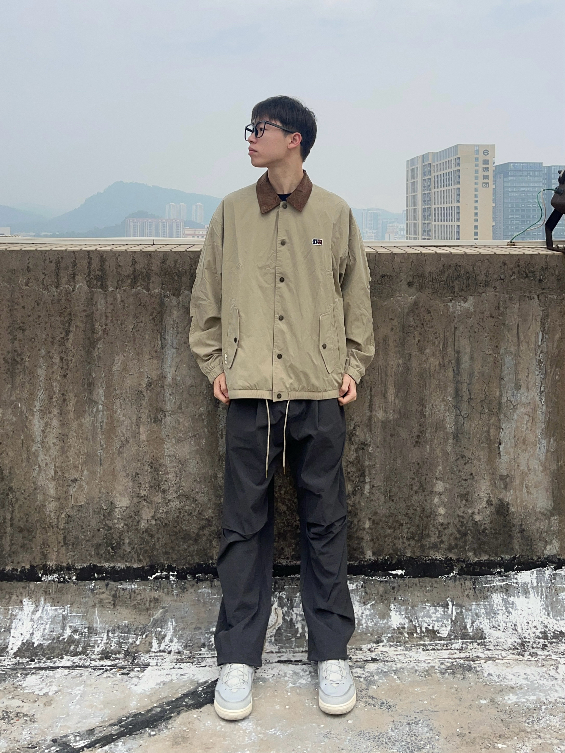 今日份穿搭分享👀 衣服是 NOTHOMME 家的卡其色猎装夹克 防风防水防污三合一设计 采用灯芯绒面料 穿上后柔软舒适 再搭配 NOTHOMME 家的冰川灰直筒伞兵裤 版型宽松显瘦又显高 最后灰色板鞋点缀 一套搭配下来 无论是户外运动还是日常出街都很合适