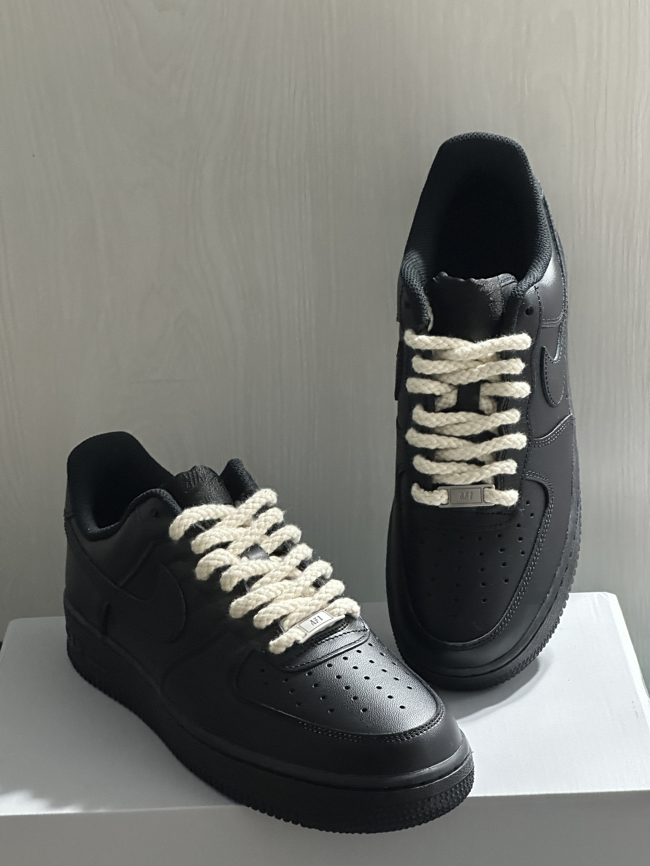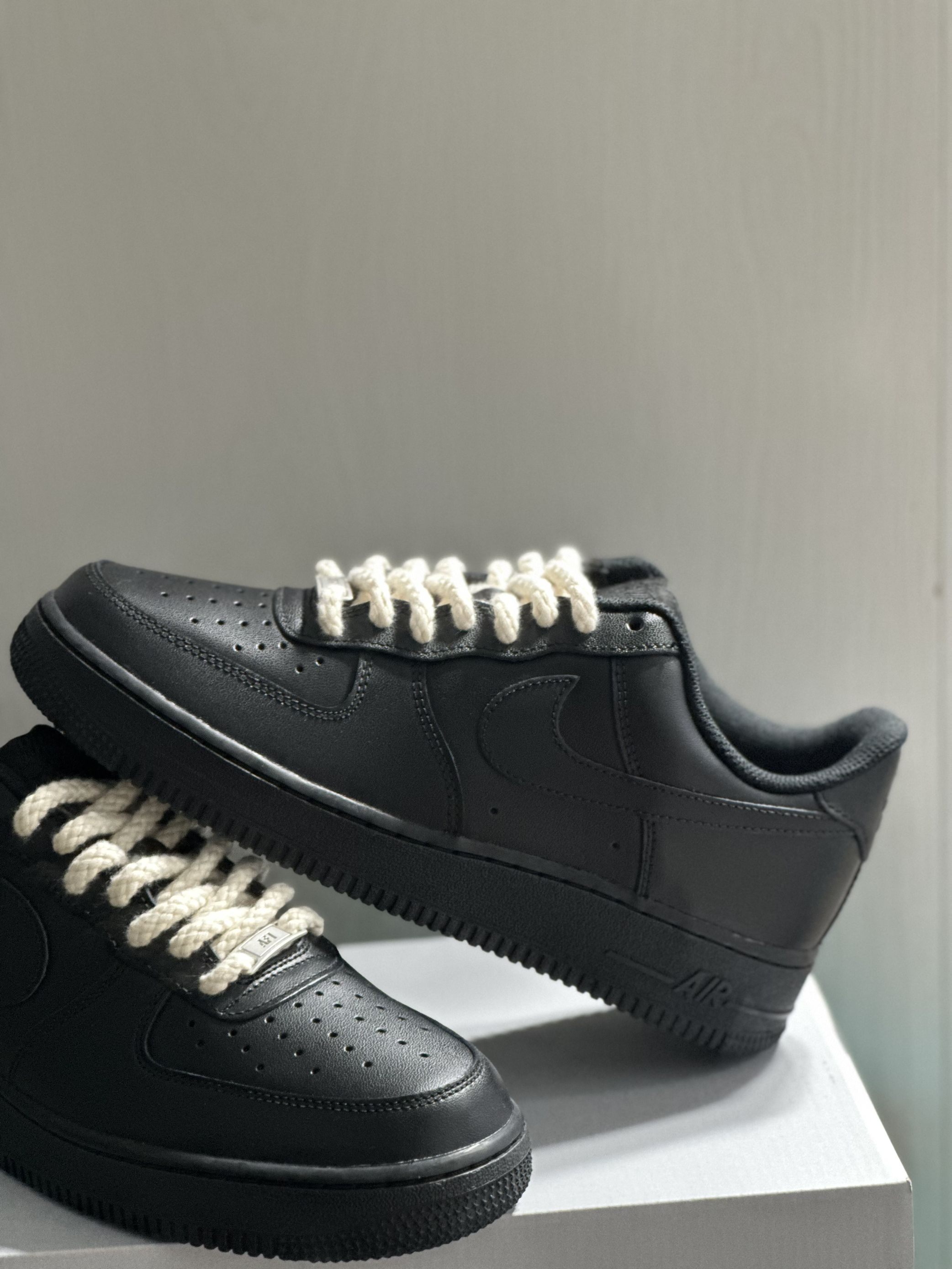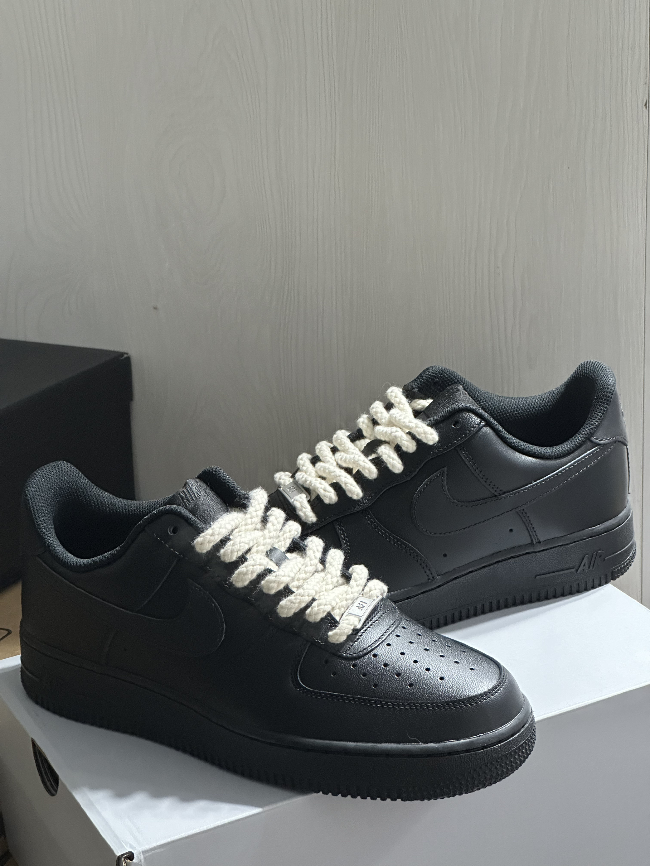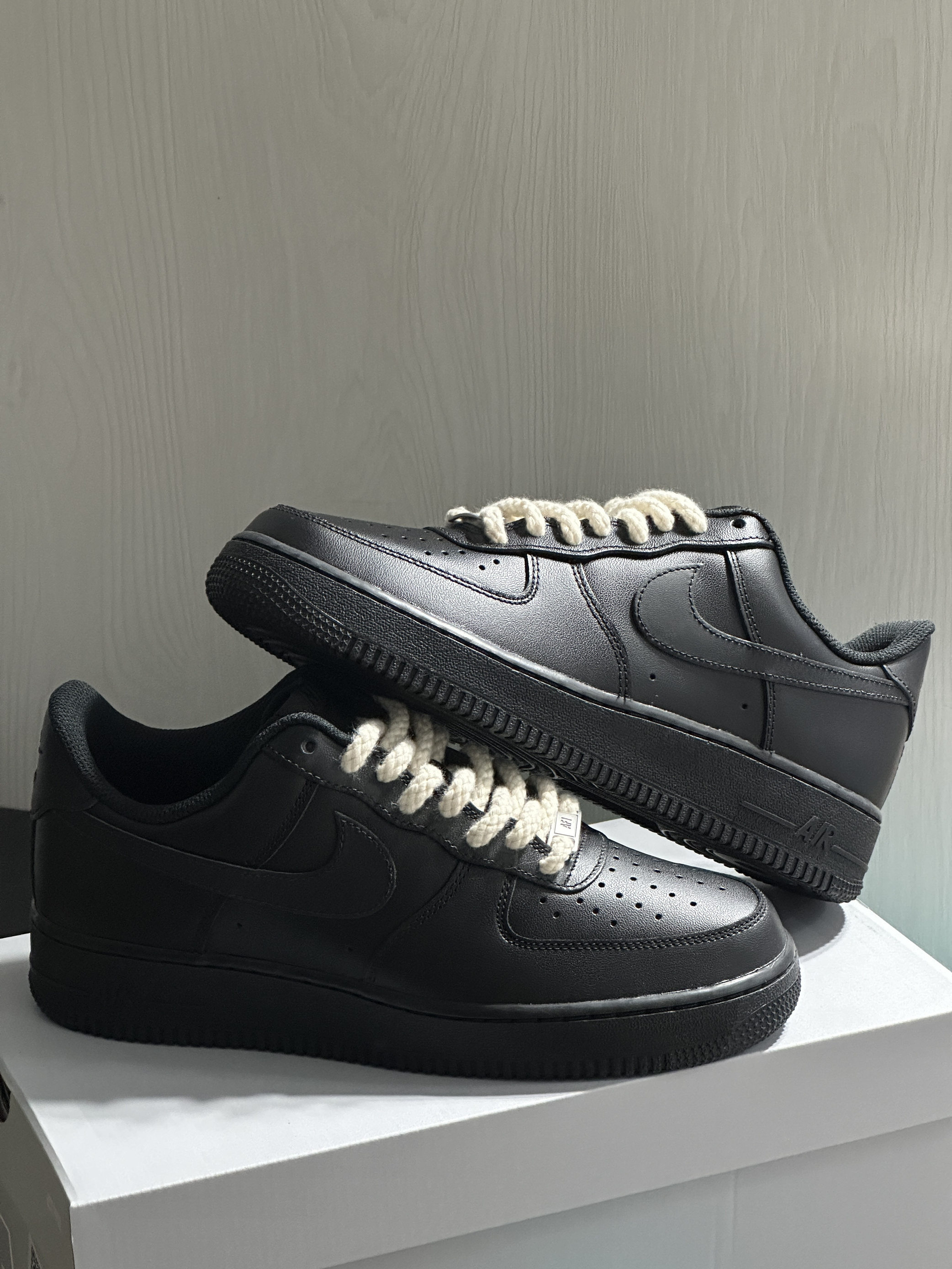 👟:Nike Air Force 1 Low 07 男朋友新买的Nike Air Force 1 Low 07 黑色真的很酷🆒耶! 如果觉得全黑色太单调,还可以自己DIY装饰一下, 像这双换了麻绳鞋带也可以非常好看哒,完全不奇怪, 时尚潮流感满满的😁。 日常搭配阔腿裤与工装裤别提有多帅了😎。
