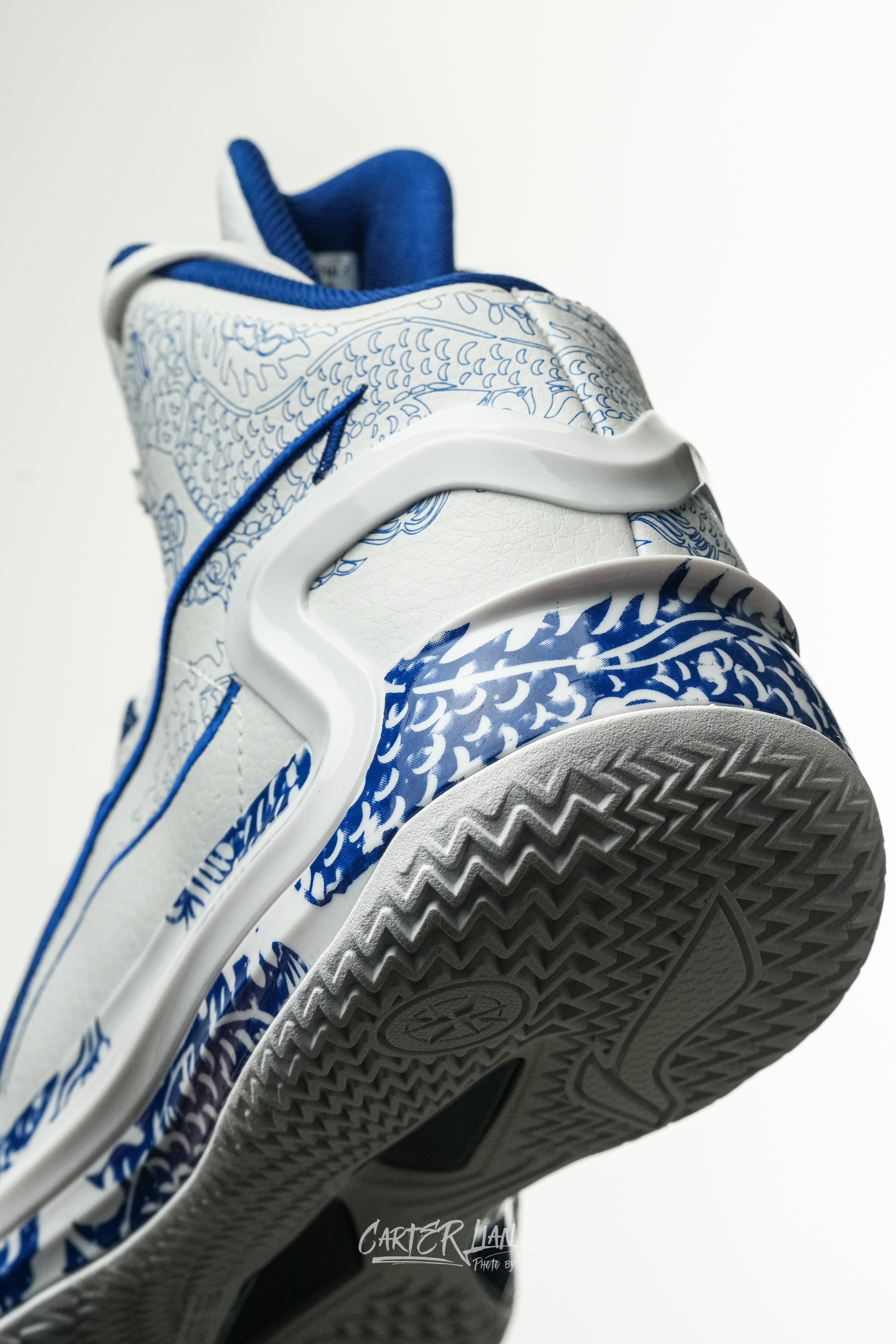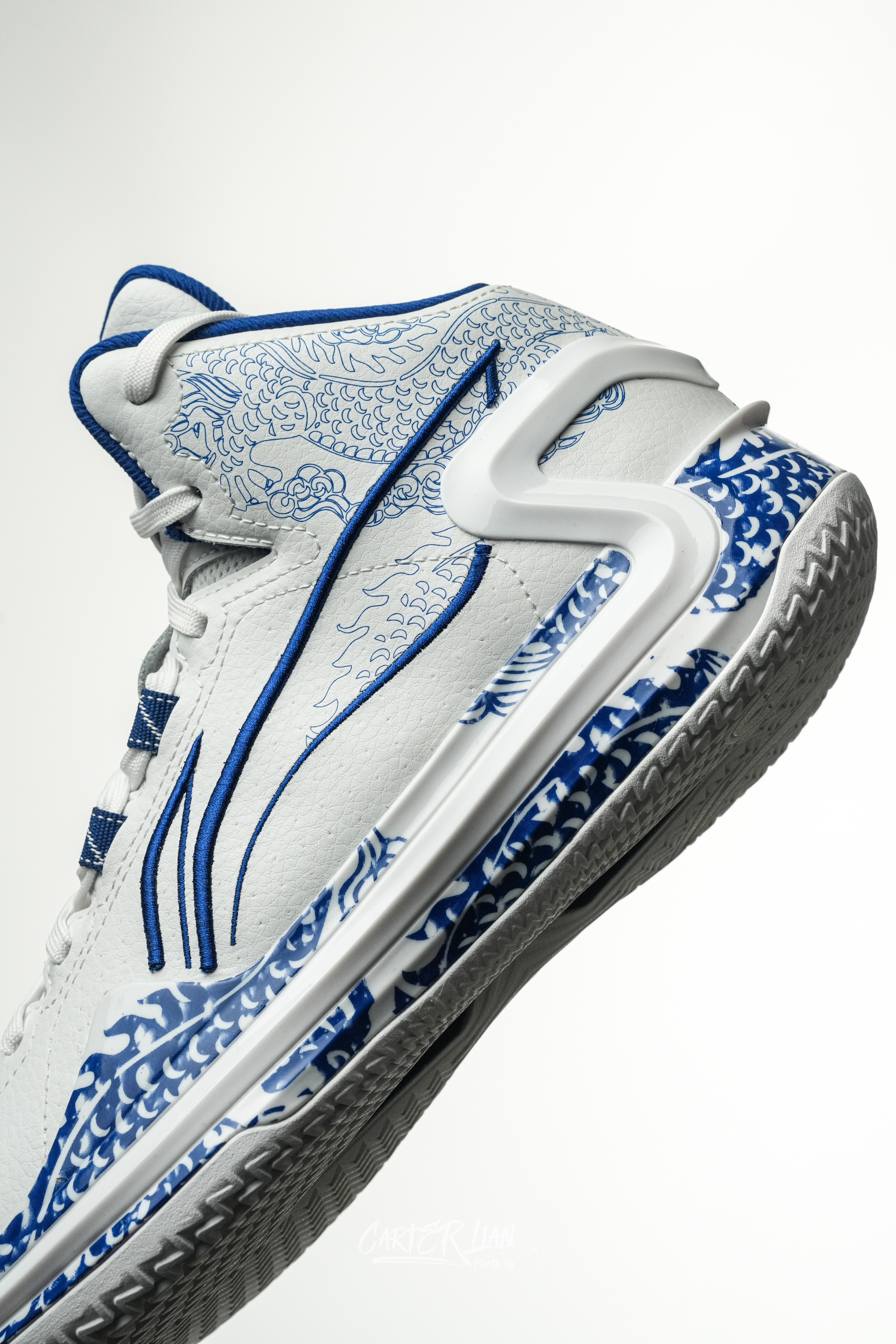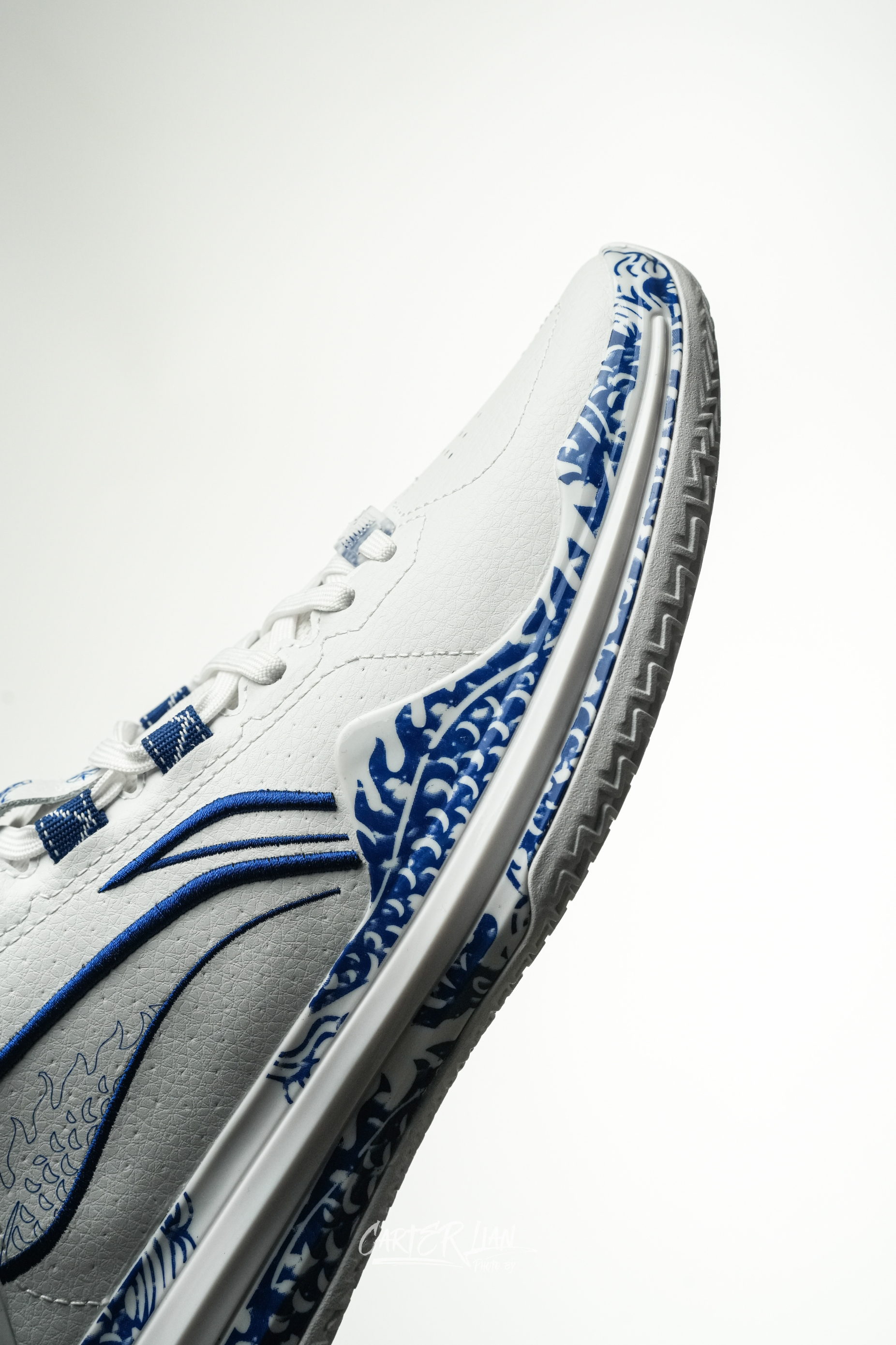 利刃系列可以说每次出的国风典藏配色都很有匠心设计感,这次青萦配色也是时隔6年后再次回归。 整双鞋以青花瓷为灵感,再现了明清之际独特的釉下彩质感,鞋面采用了少有的头层牛皮材质,仿佛让人触摸到了古代瓷器的温润与细腻。TPU、鞋帮、鞋舌都有用到青花龙纹点缀,对龙的细节刻画更是巧夺天工,栩栩如生,有种青花龙纹余韵萦绕的感觉。logo和鞋舌也都用了刺绣工艺。整个青花瓷与龙纹的呼应,也是很好地把中国元素...