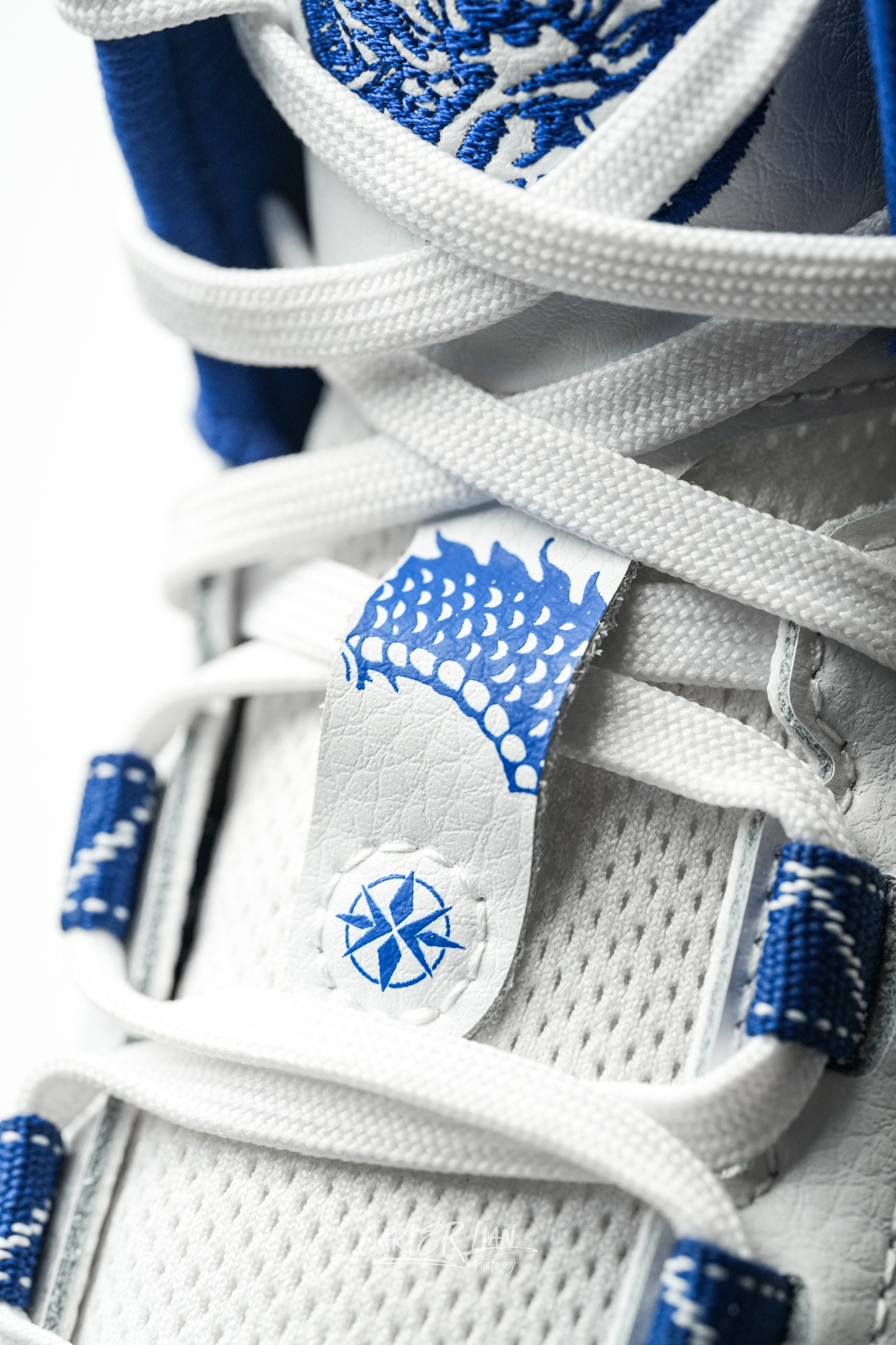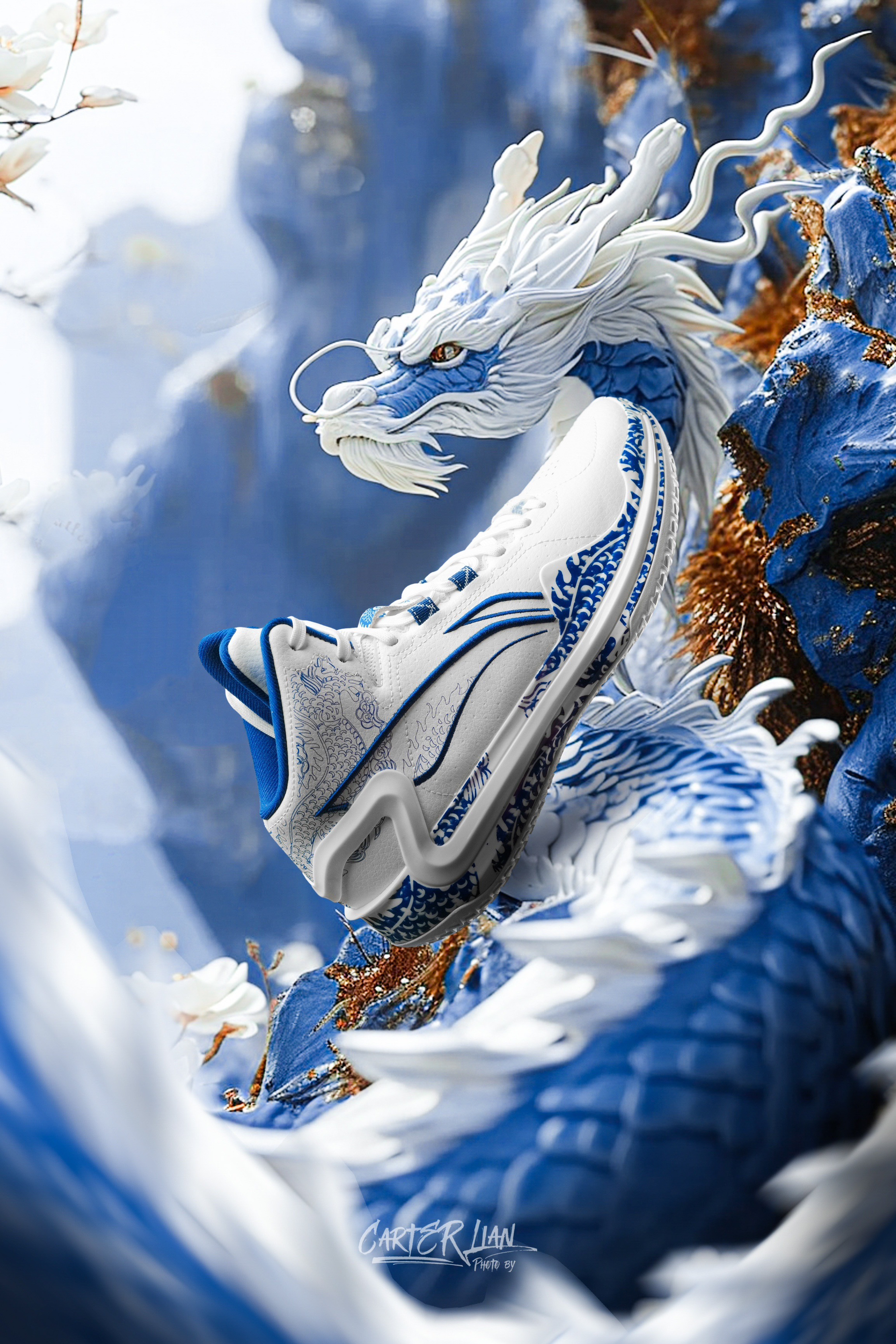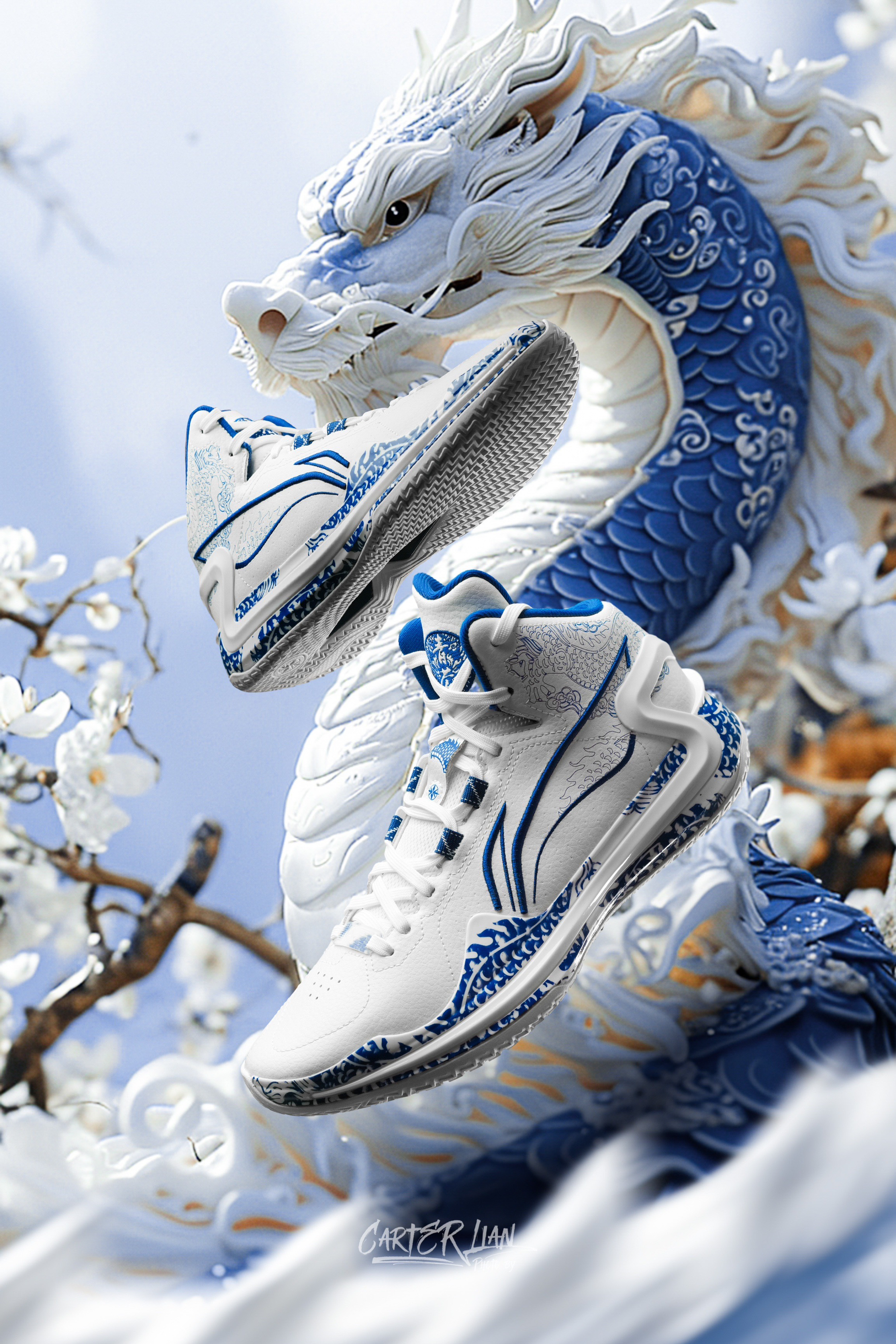 利刃系列可以说每次出的国风典藏配色都很有匠心设计感,这次青萦配色也是时隔6年后再次回归。 整双鞋以青花瓷为灵感,再现了明清之际独特的釉下彩质感,鞋面采用了少有的头层牛皮材质,仿佛让人触摸到了古代瓷器的温润与细腻。TPU、鞋帮、鞋舌都有用到青花龙纹点缀,对龙的细节刻画更是巧夺天工,栩栩如生,有种青花龙纹余韵萦绕的感觉。logo和鞋舌也都用了刺绣工艺。整个青花瓷与龙纹的呼应,也是很好地把中国元素...
