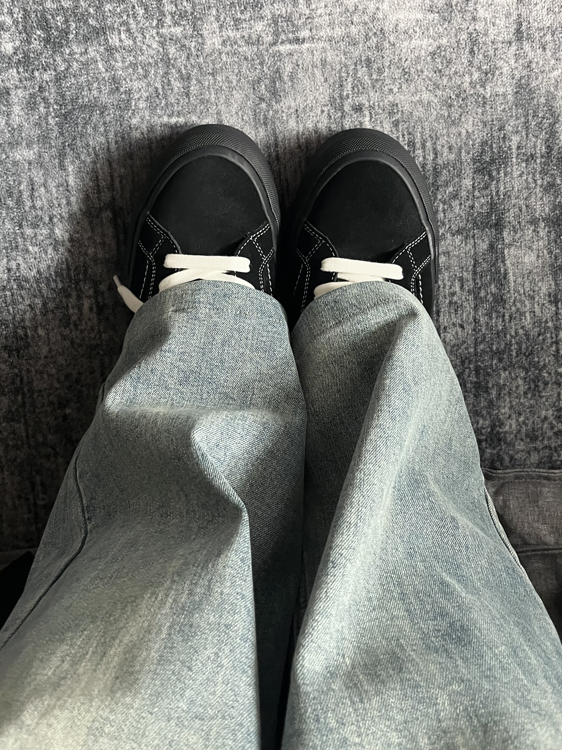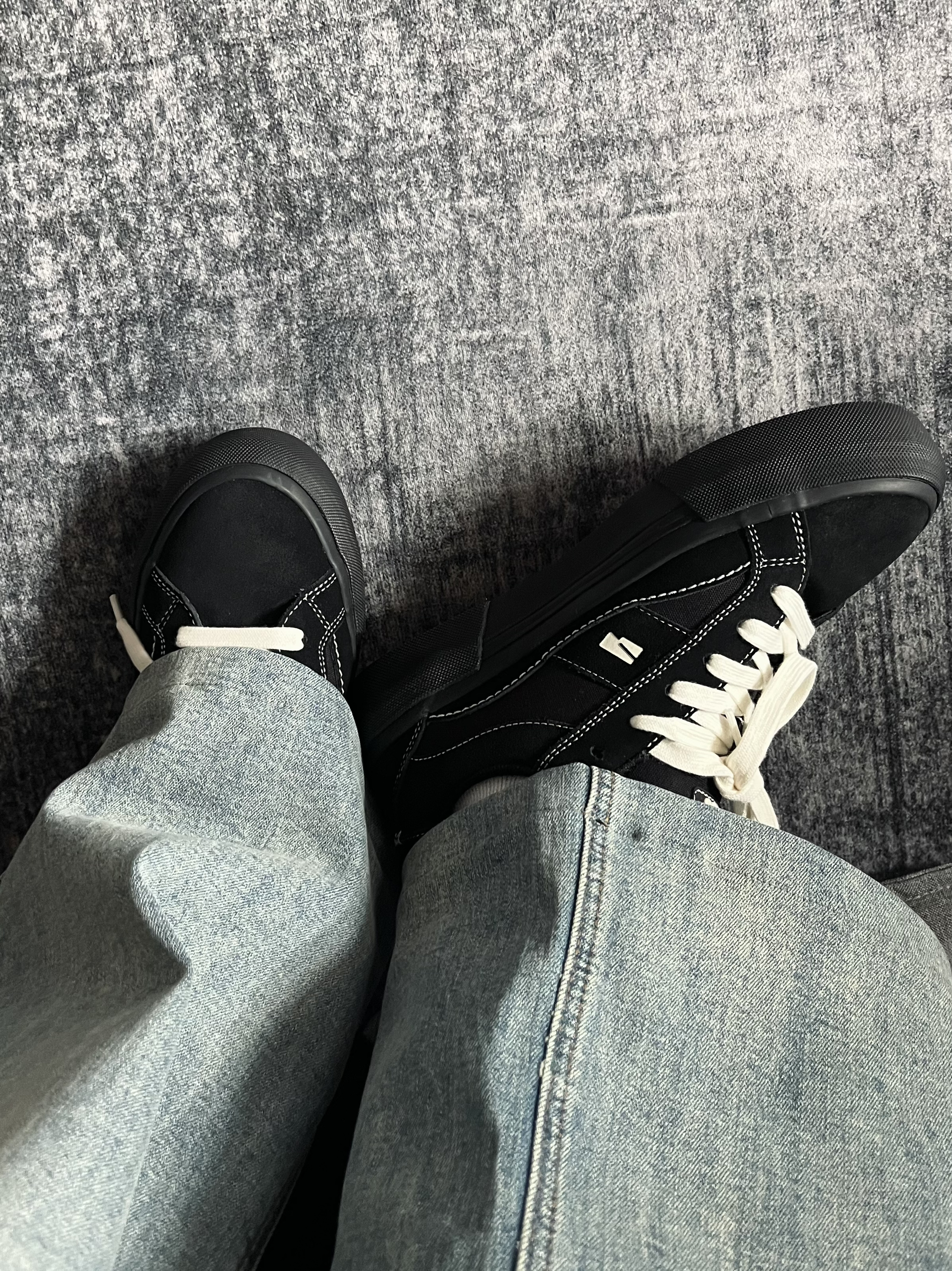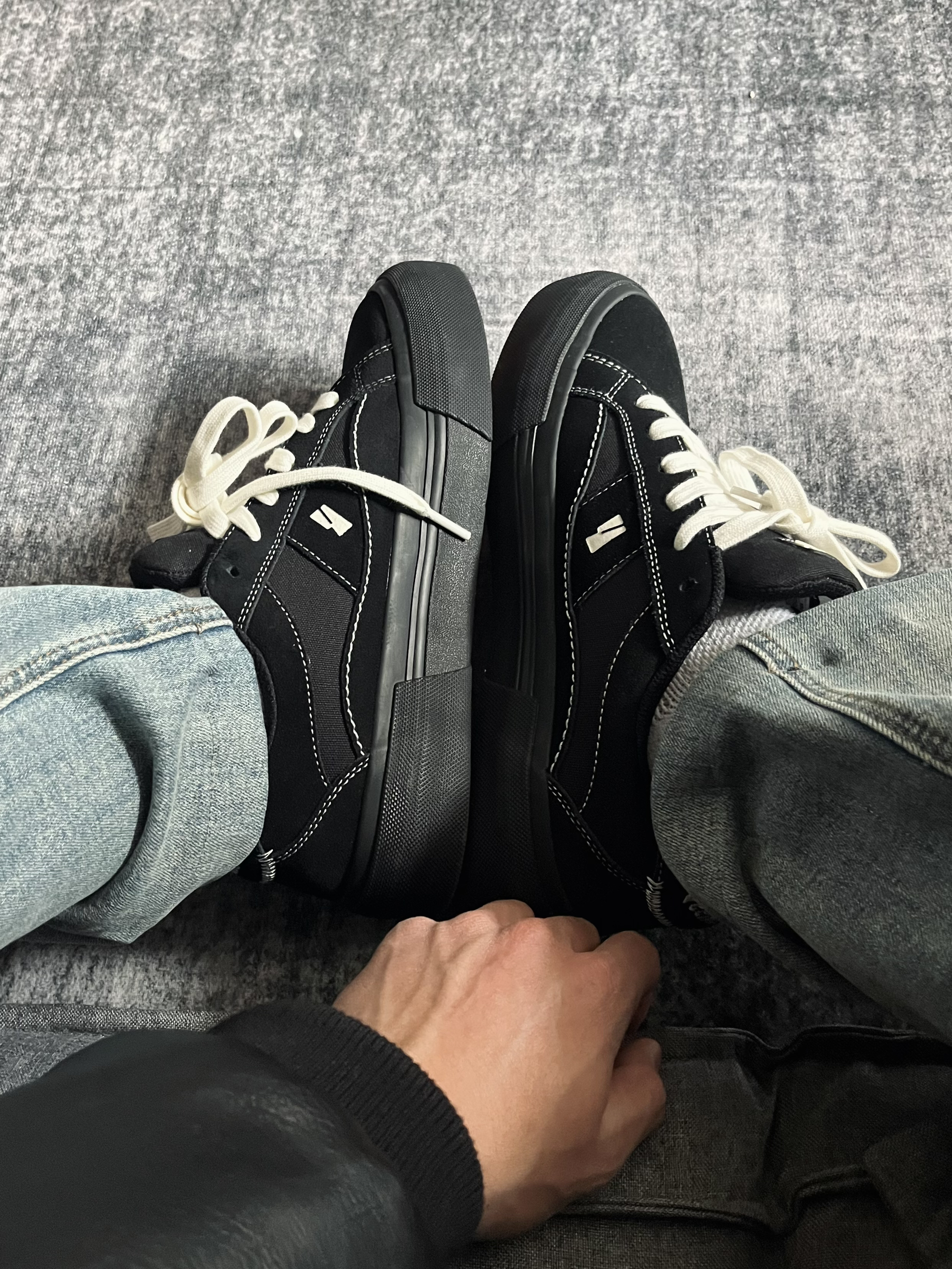 👟一款厚底黑色滑板鞋. ◻️首先这个鞋我真的是太喜欢了,整个鞋真的是太有质感了,黑色的设计加上白色线的点缀,真的是太百搭了! ◼️其次脚感也是没得说了,踩上去很舒服,还赠了一个黑色的鞋带,变成黑武士配色也是很好看.