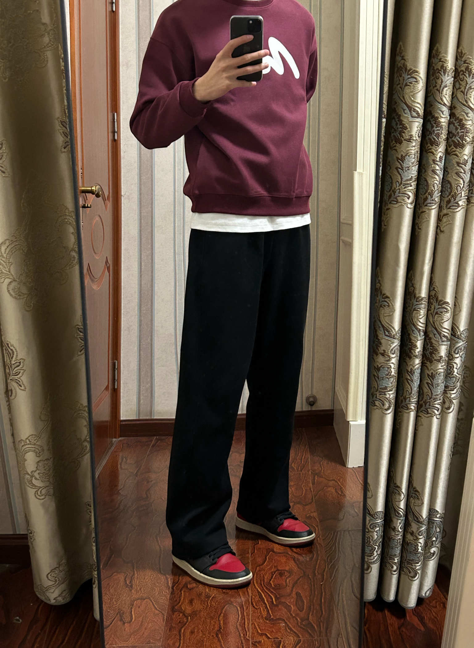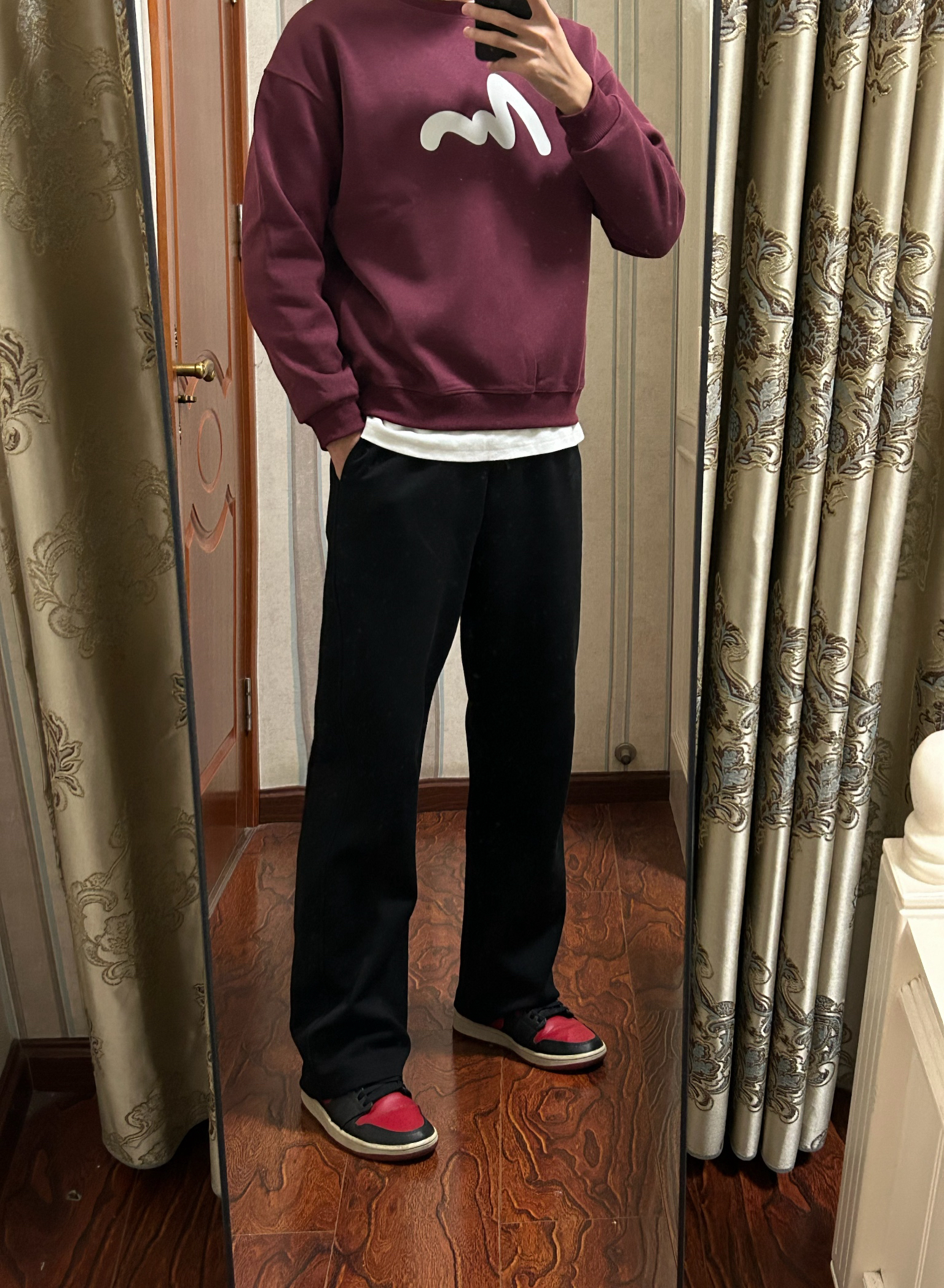 ⬆️ 圆领卫衣(卫衣整体版型偏合身,大一个码应该更效果更好些,但整体样式来说没什么毛病,内里薄绒,穿着也挺舒服,风格也比较潮流 ⬇️ 直筒西裤(直筒版型,修饰上下比例,显腿更长,也不挑腿型