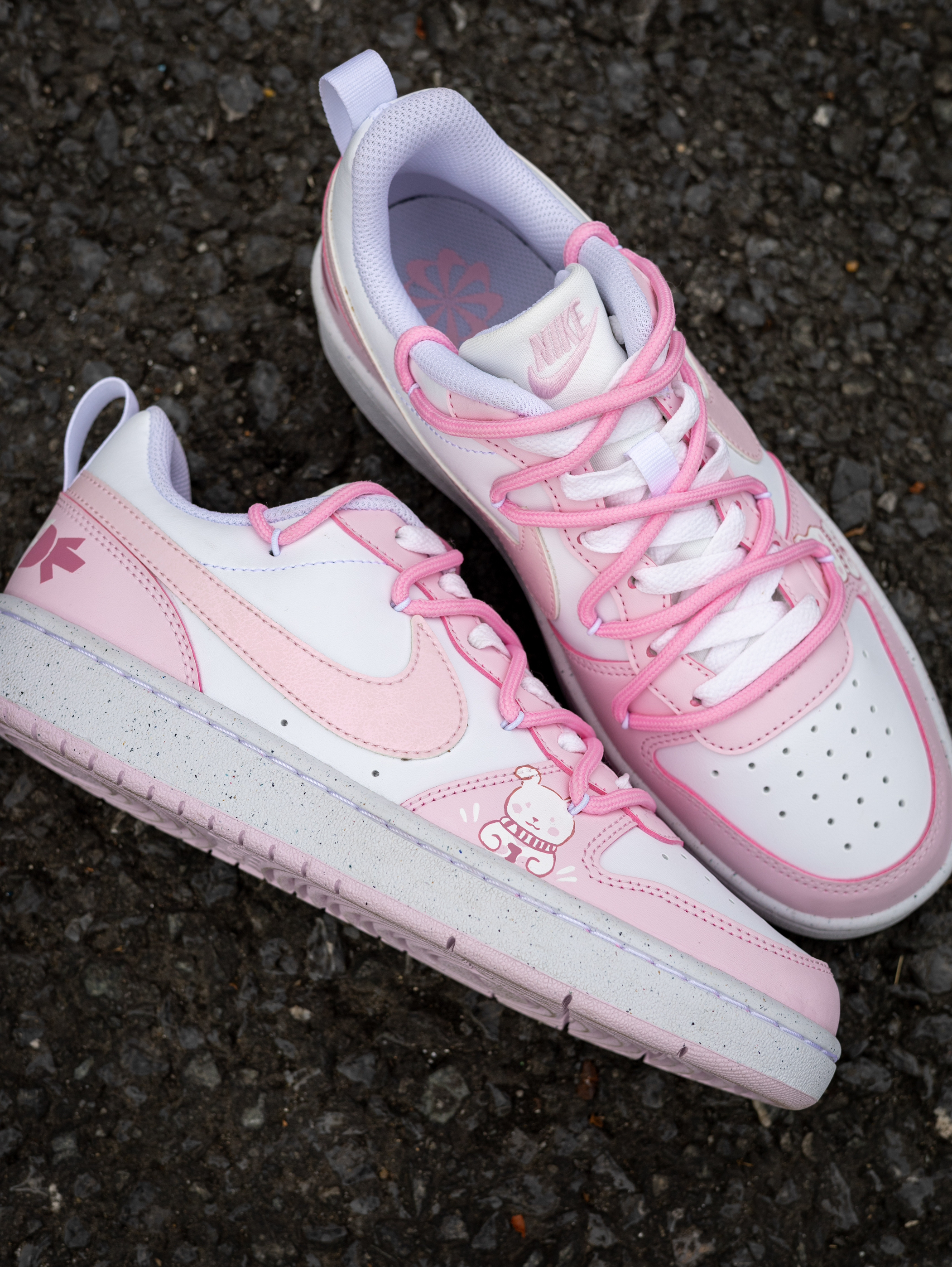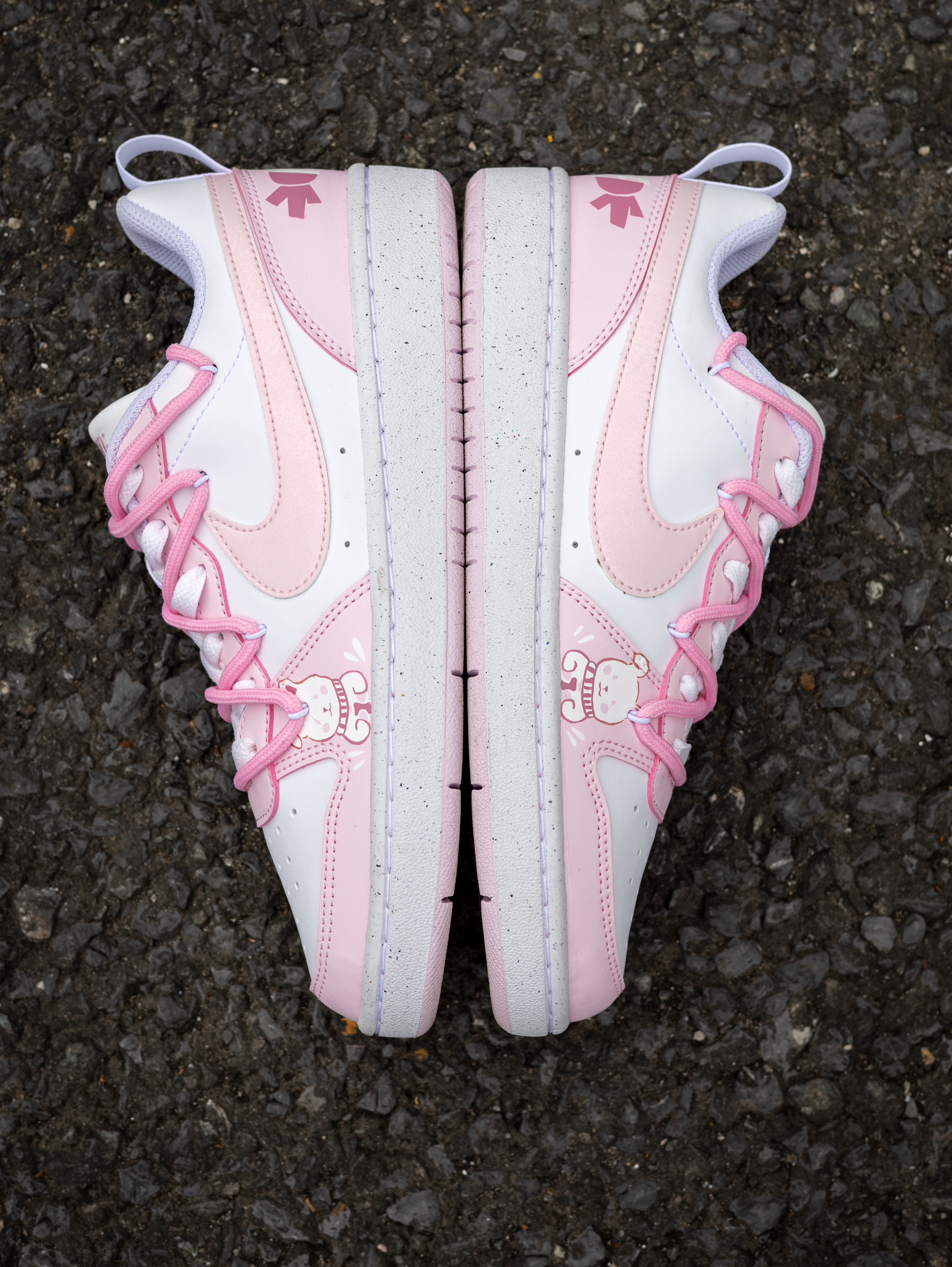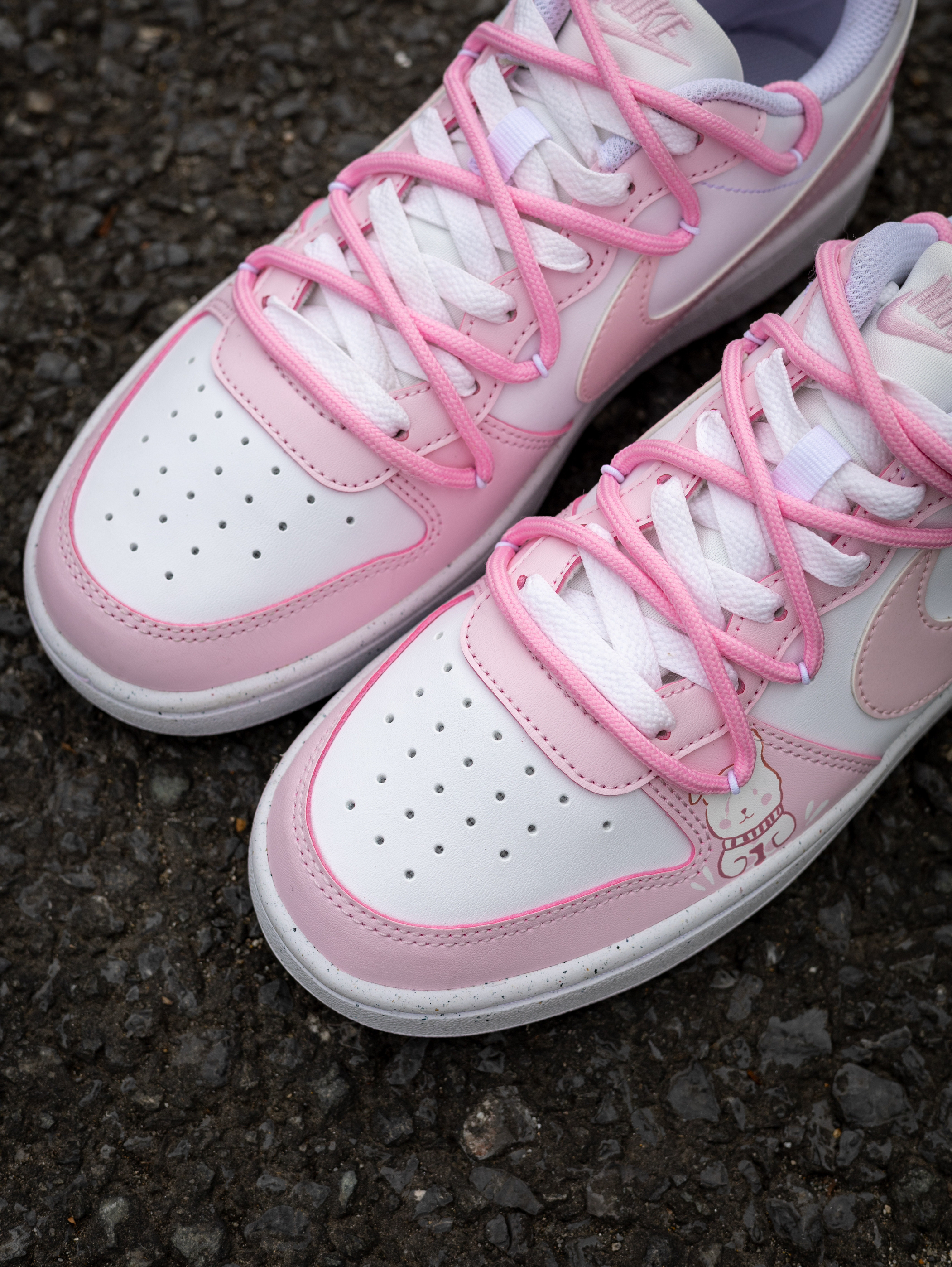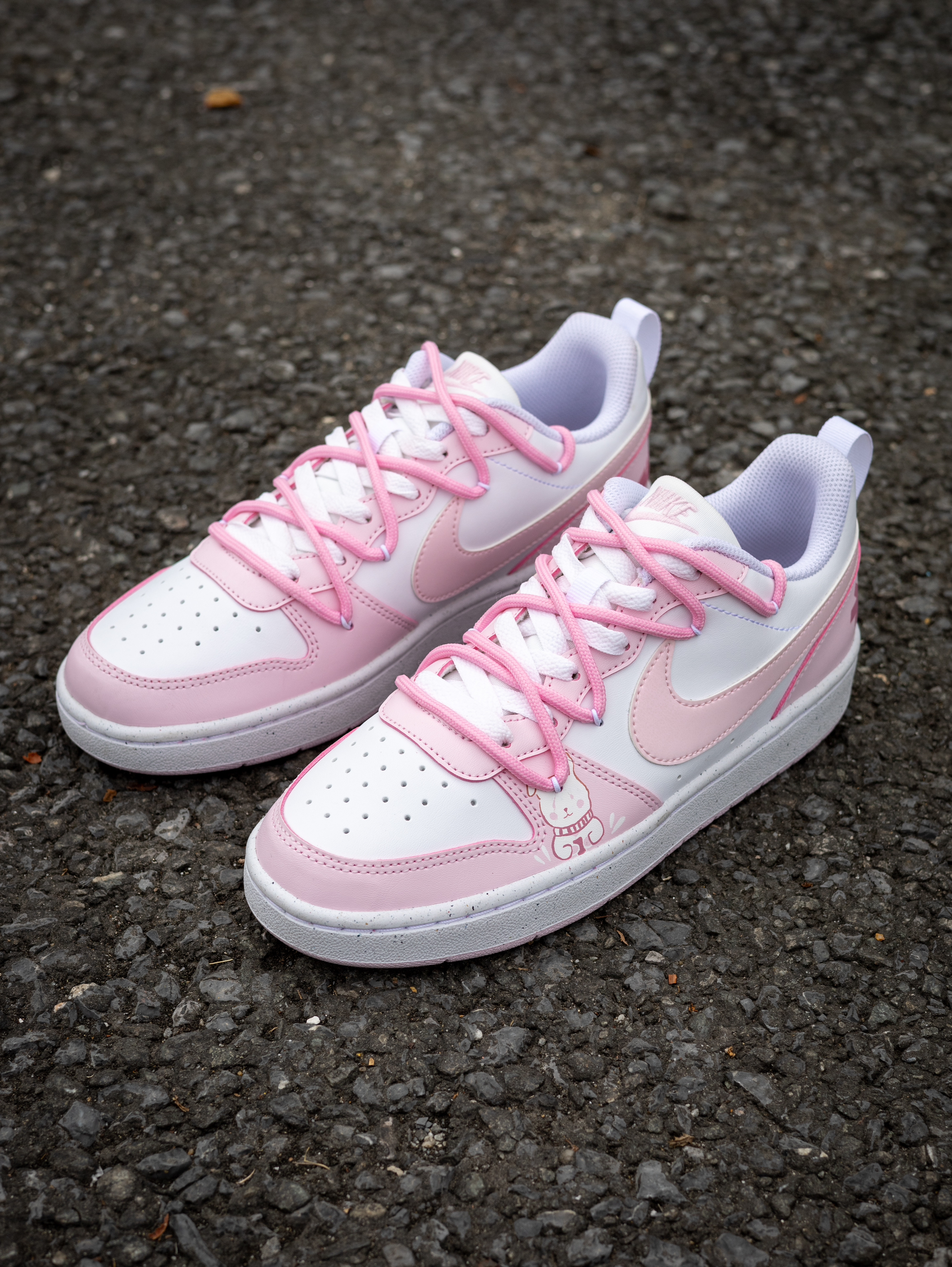 开箱即分享 今天和大家分享一款Nike定制球鞋 就是这款Nike Court Borough 小兔 粉色 实物开箱还是蛮惊艳的 鞋款白粉的配色比较的甜美可爱 在鞋面上加入了小兔子🐰的彩绘图案 颜值还是挺好看的 解构设计的鞋带层次感很丰富 静态脚感偏韧弹 橡胶外底的耐磨防滑问题不大 尺码不偏,正码就行