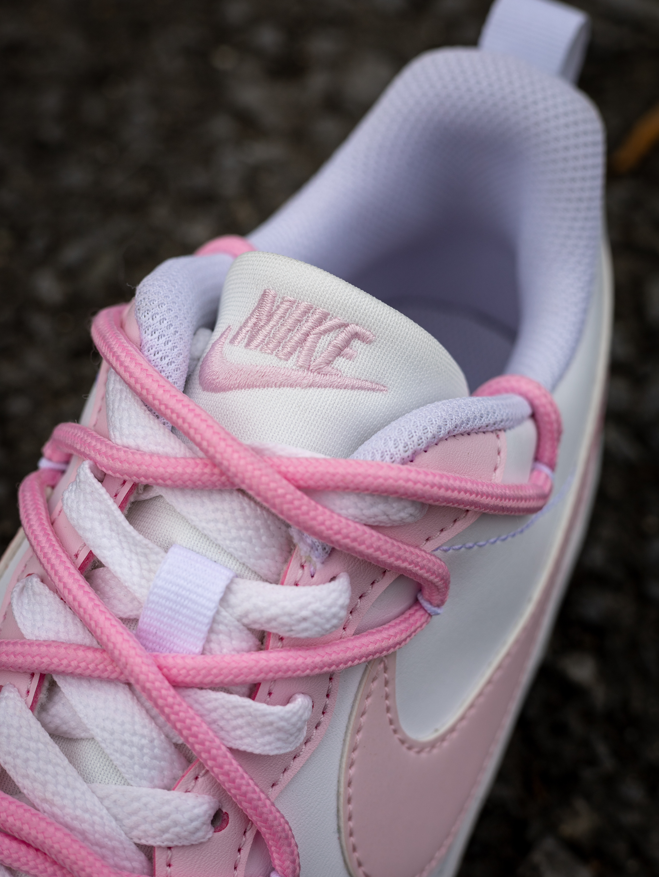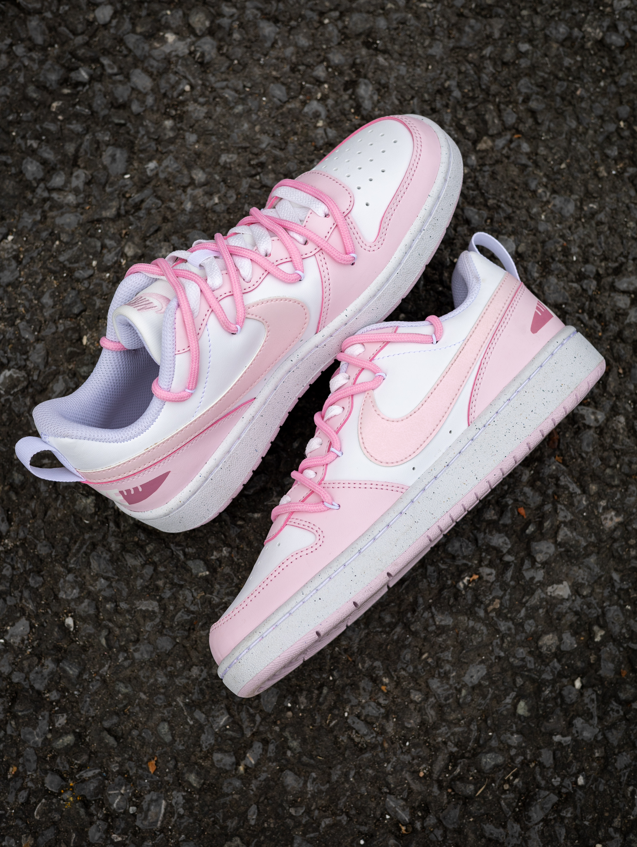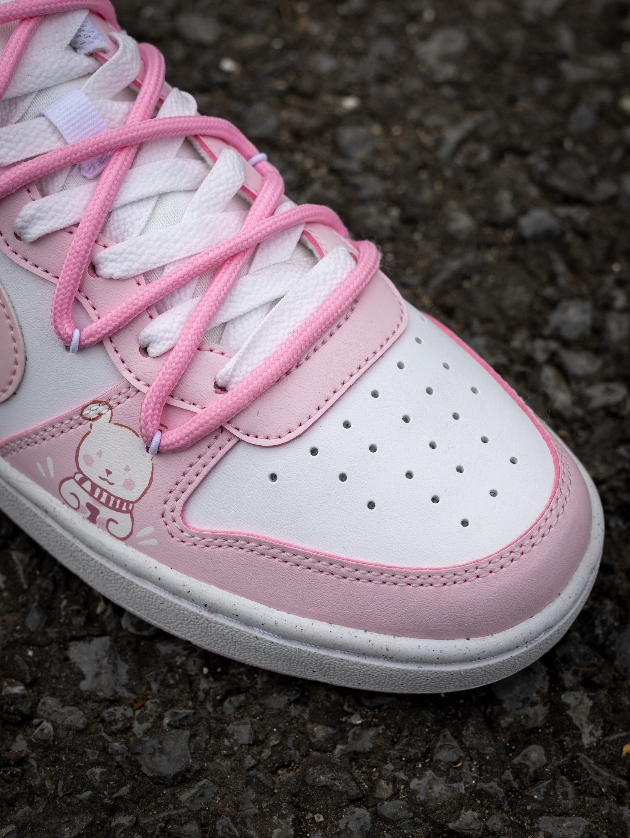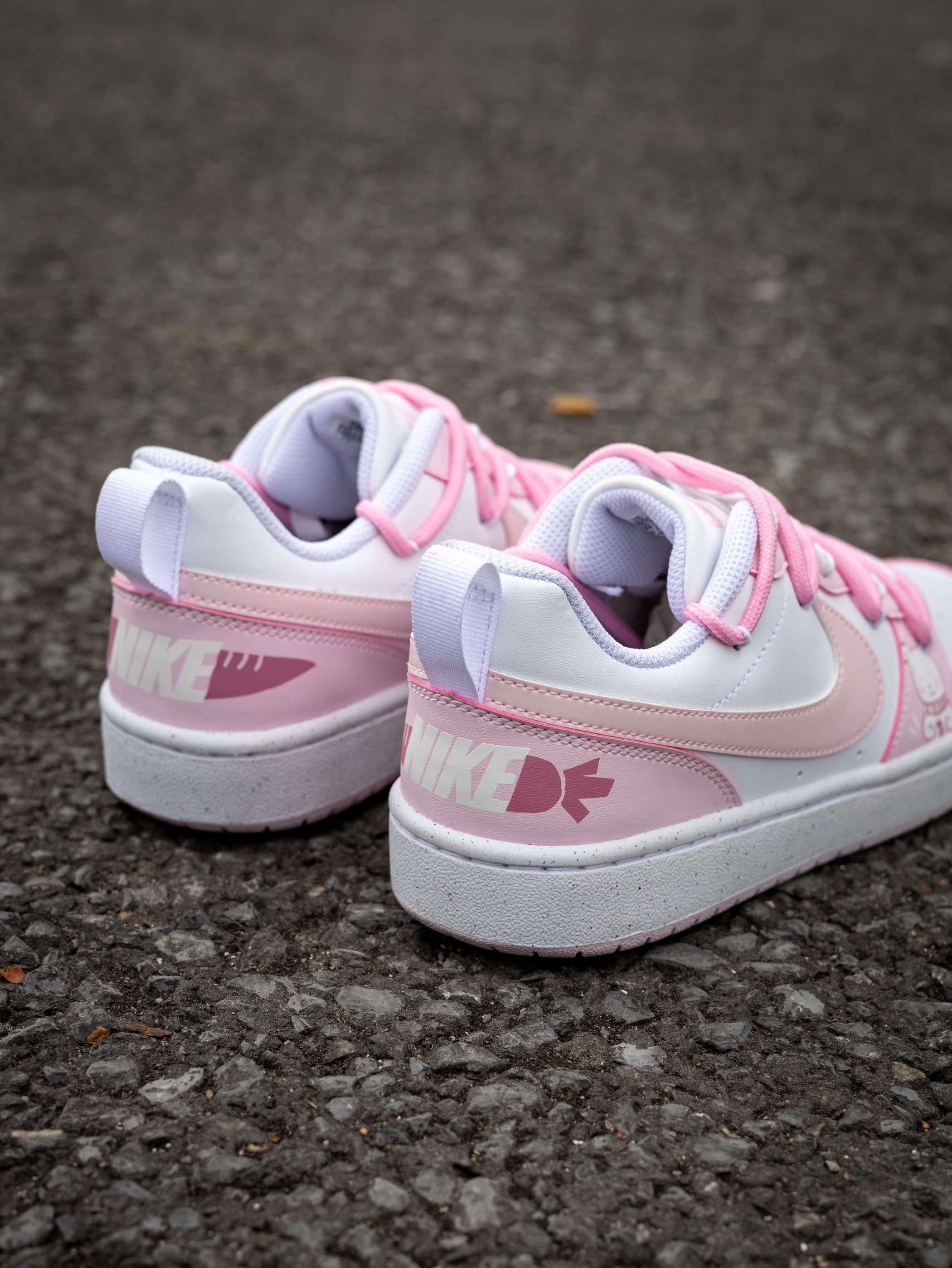 开箱即分享 今天和大家分享一款Nike定制球鞋 就是这款Nike Court Borough 小兔 粉色 实物开箱还是蛮惊艳的 鞋款白粉的配色比较的甜美可爱 在鞋面上加入了小兔子🐰的彩绘图案 颜值还是挺好看的 解构设计的鞋带层次感很丰富 静态脚感偏韧弹 橡胶外底的耐磨防滑问题不大 尺码不偏,正码就行