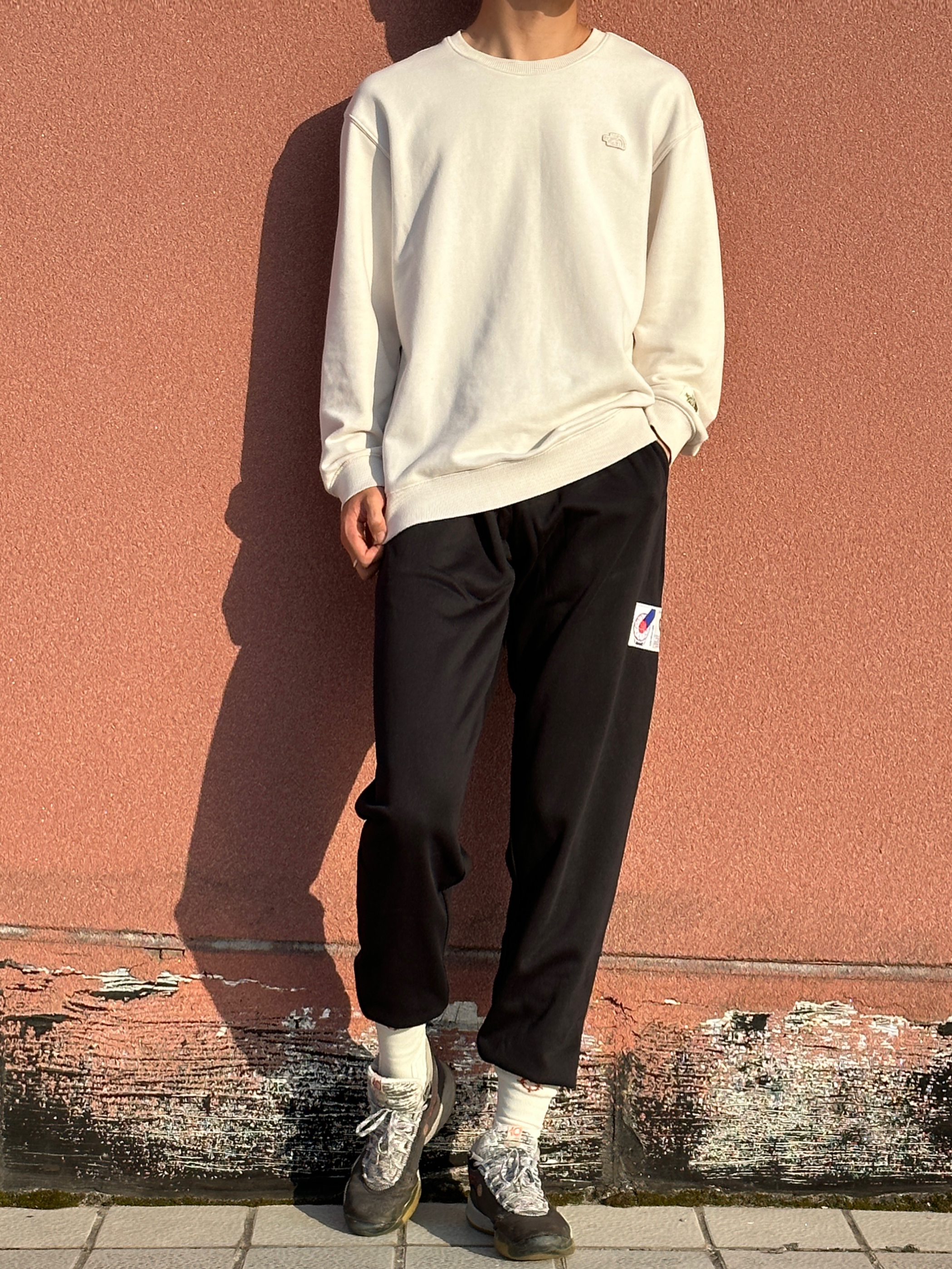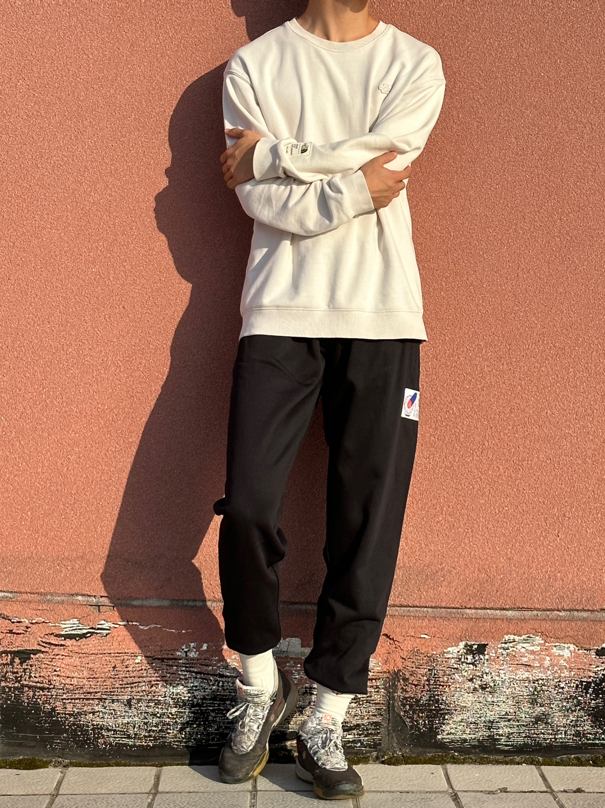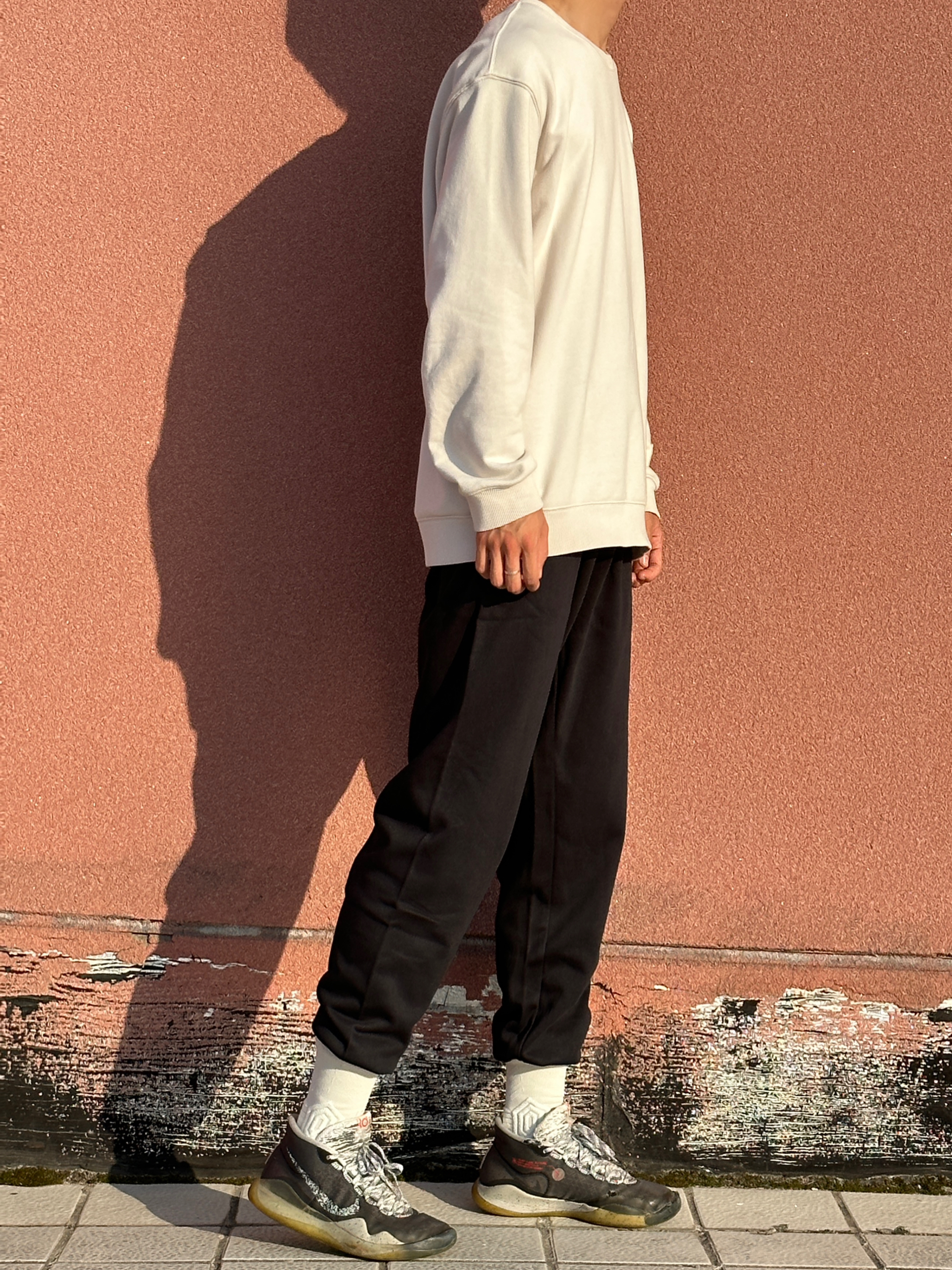 篮球穿搭分享1⃣️DAY 米色无帽卫衣➕黑色运动卫裤 再穿一双黑色篮球鞋 这款准者 自由1代的黑色卫裤 左腿做了一个log设计 整体就是一个纯黑色简约风格 这款橡筋收口设计 冬天来包袜穿搭也很保暖 裤子材质也是吸汗透气 👖: 准者 RIGORER