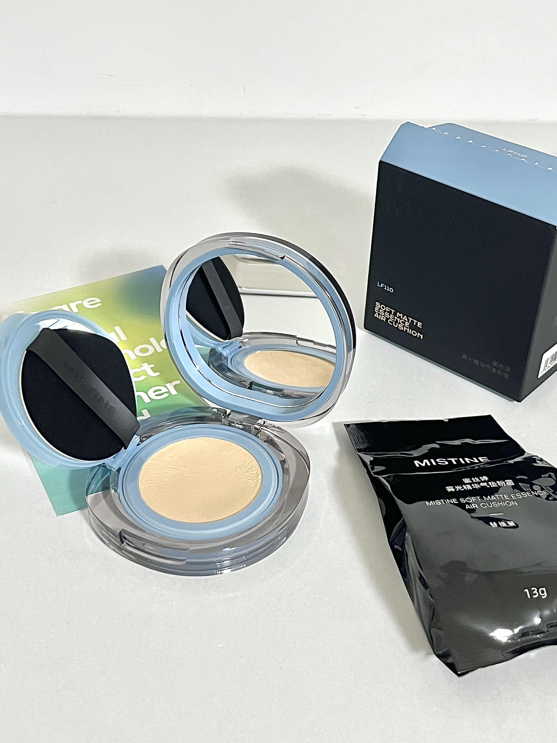 对我来说气垫是真的很难选到合适的.. 因为遮瑕力保湿力和持久度这三个真很难兼得 每次都恨不得把手上在用的好几个气垫结合 but 气垫这东西出门也不可能带好几个呀 再加上我这种懒人,妆前护肤也嫌太麻烦 就一直在搜刮全能气垫! 终于让我挖到了 mistine 气垫 包装好好看呀!限定冰透蓝是油皮款 粉质细细的上脸扒得很牢~ 遮瑕力真的🐮 我的毛孔啊痘印黑眼圈大部分都能遮住 额头下巴抹开就OK!这样上妆...