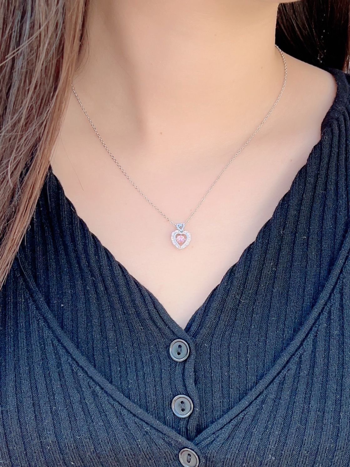 哈喽,又到了小半的好物分享时间啦 打扮漂亮出门感受节日氛围啦! 今天上身黑色针织衫+红色格裙~上短下长的穿搭思路get啦! 冬季配饰不能少,今天V领针织衫佩戴爱心项链,提升整体气质~ 这款项链是XXOFF 粉钻爱心项链,可跳动设计,blingbling的少女感十足~真的吼吼看呀!!