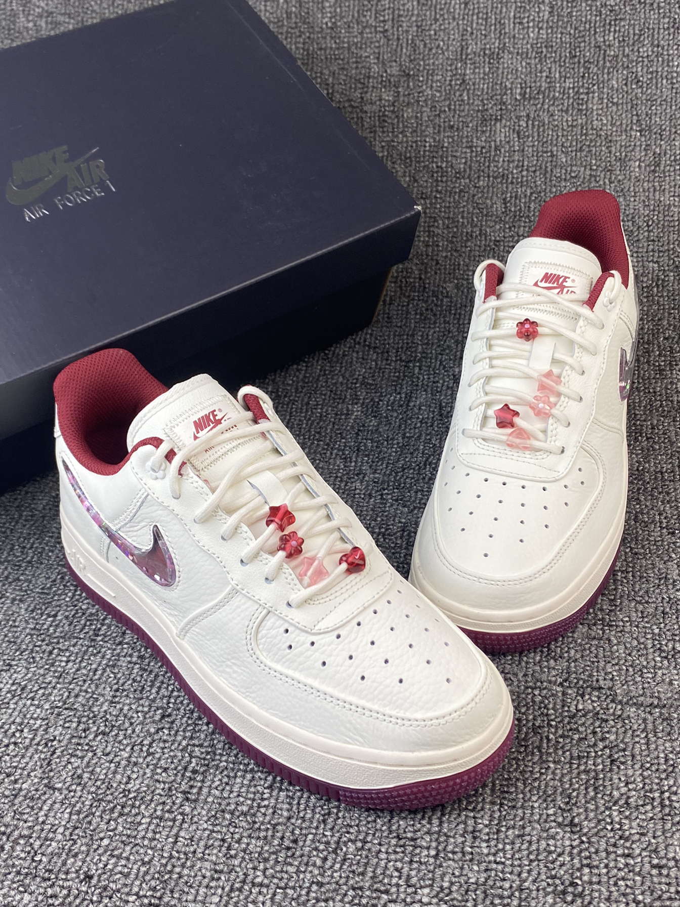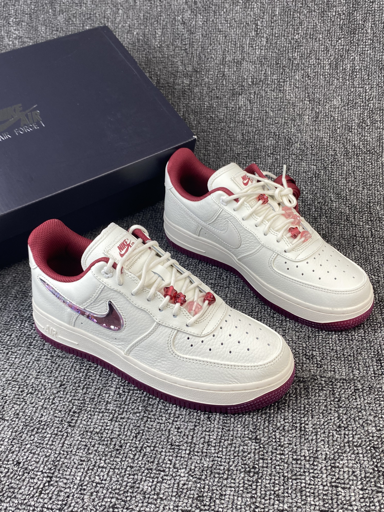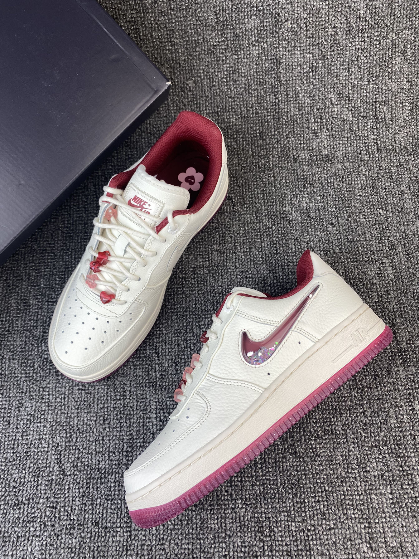 👟Nike AF1 ✨Nike真的别太会!这次的情人节限定还蛮细节的!鞋子整体以米白色为主,奶呼呼的,红色和粉色点缀,整体很有氛围感。 🌸鞋面是皮革材质,所以就算是白色日常也比较好打理。鞋侧的Swoosh是比较吸引我的一点啦,是流沙设计的,里面还有小星星等元素⭐️再加上后跟处的小花花,设计师是有点子浪漫的!! 💫鞋子另外还有附带一根红色鞋带,平常也能换换风格。尺码方面我是按平常穿的选择的,刚...