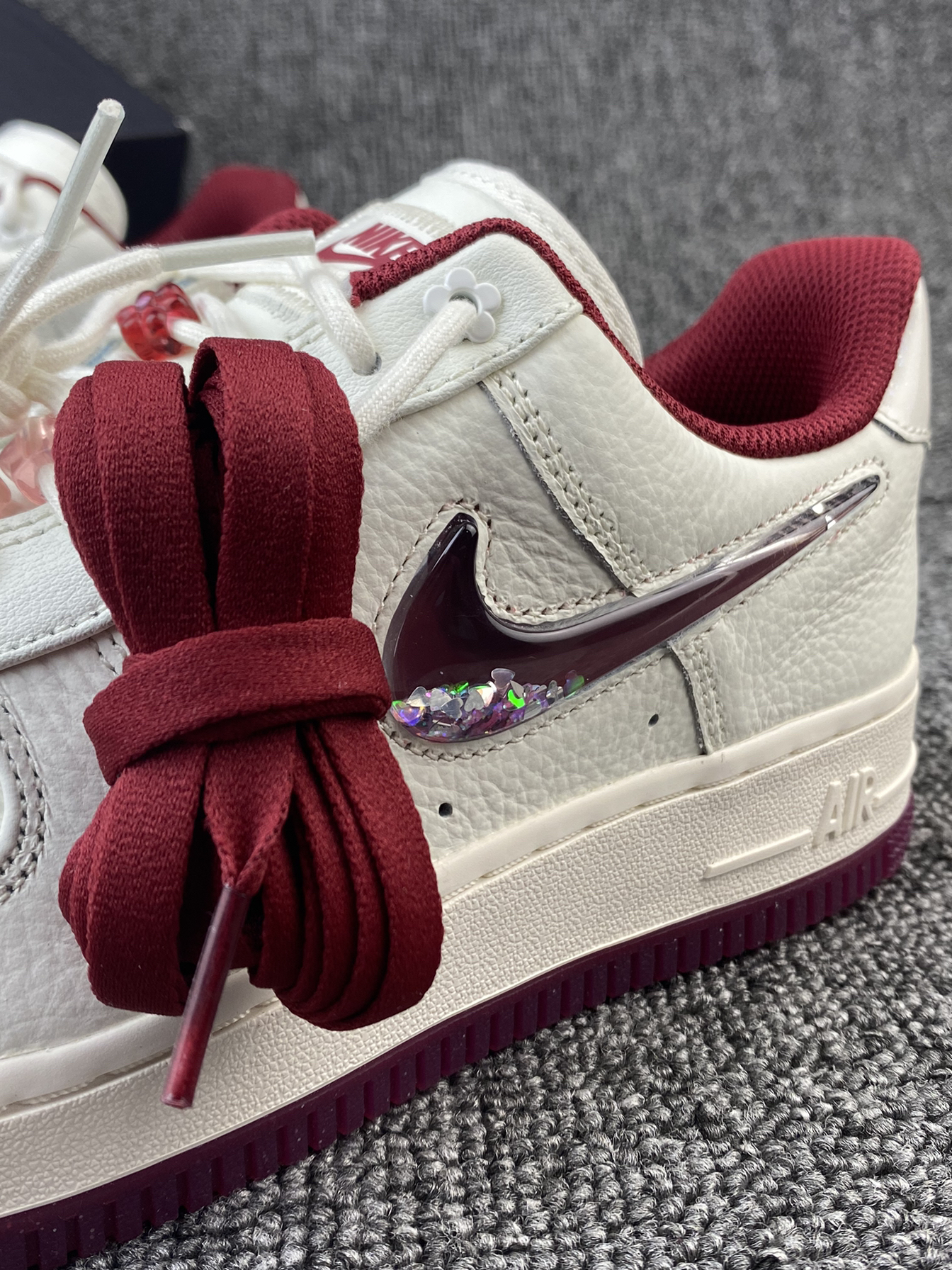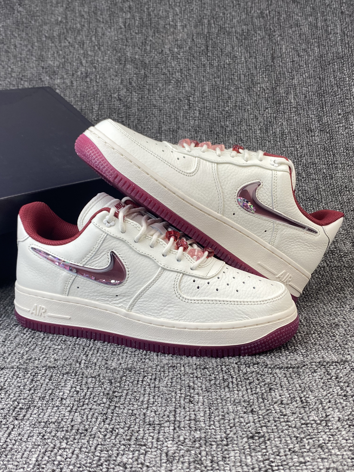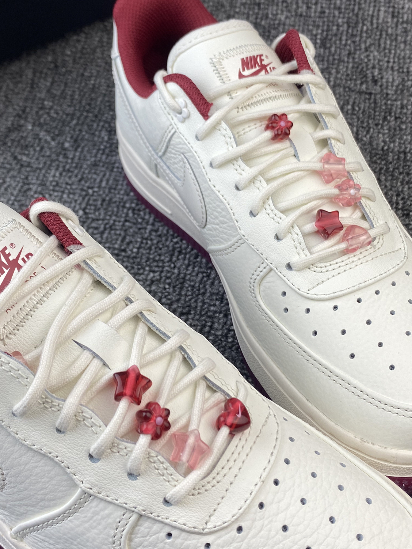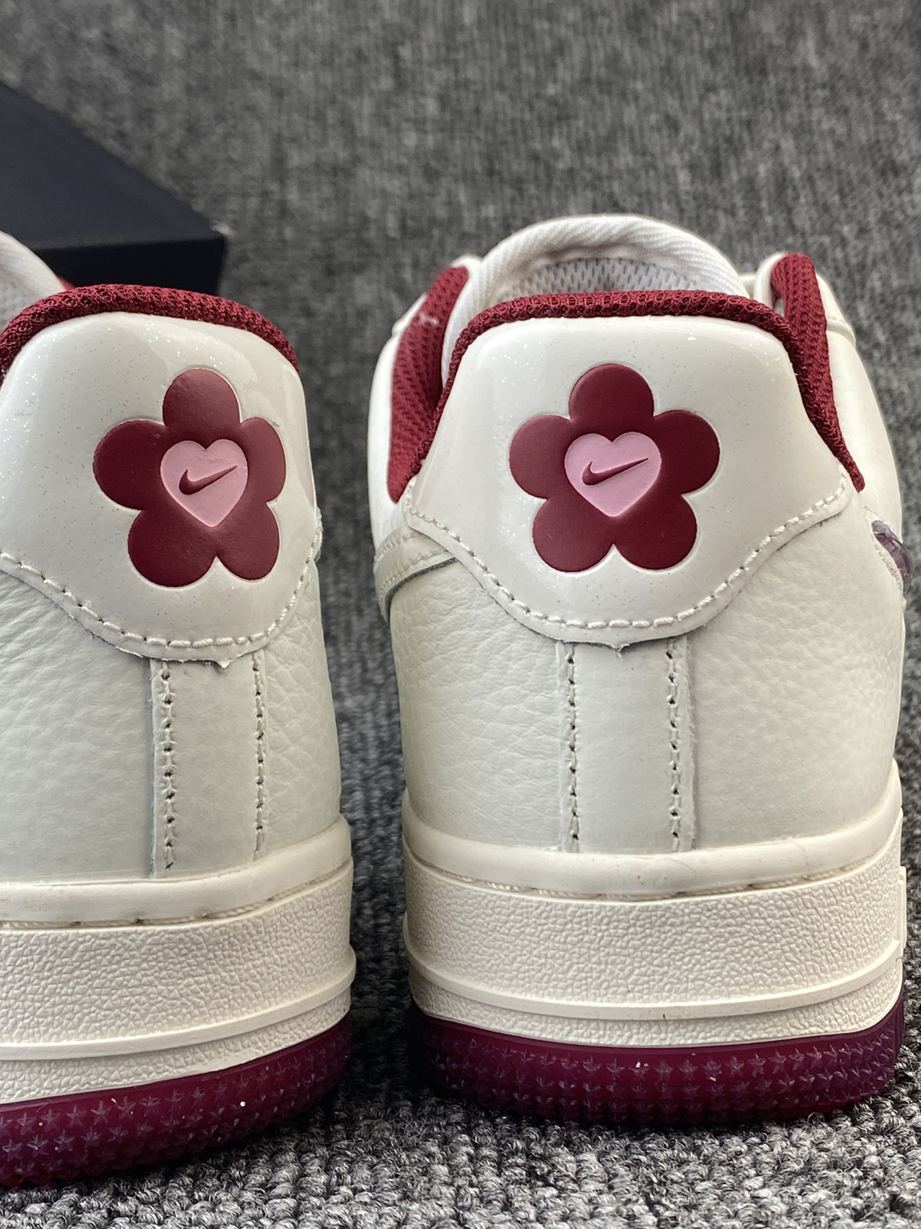 👟Nike AF1 ✨Nike真的别太会!这次的情人节限定还蛮细节的!鞋子整体以米白色为主,奶呼呼的,红色和粉色点缀,整体很有氛围感。 🌸鞋面是皮革材质,所以就算是白色日常也比较好打理。鞋侧的Swoosh是比较吸引我的一点啦,是流沙设计的,里面还有小星星等元素⭐️再加上后跟处的小花花,设计师是有点子浪漫的!! 💫鞋子另外还有附带一根红色鞋带,平常也能换换风格。尺码方面我是按平常穿的选择的,刚...