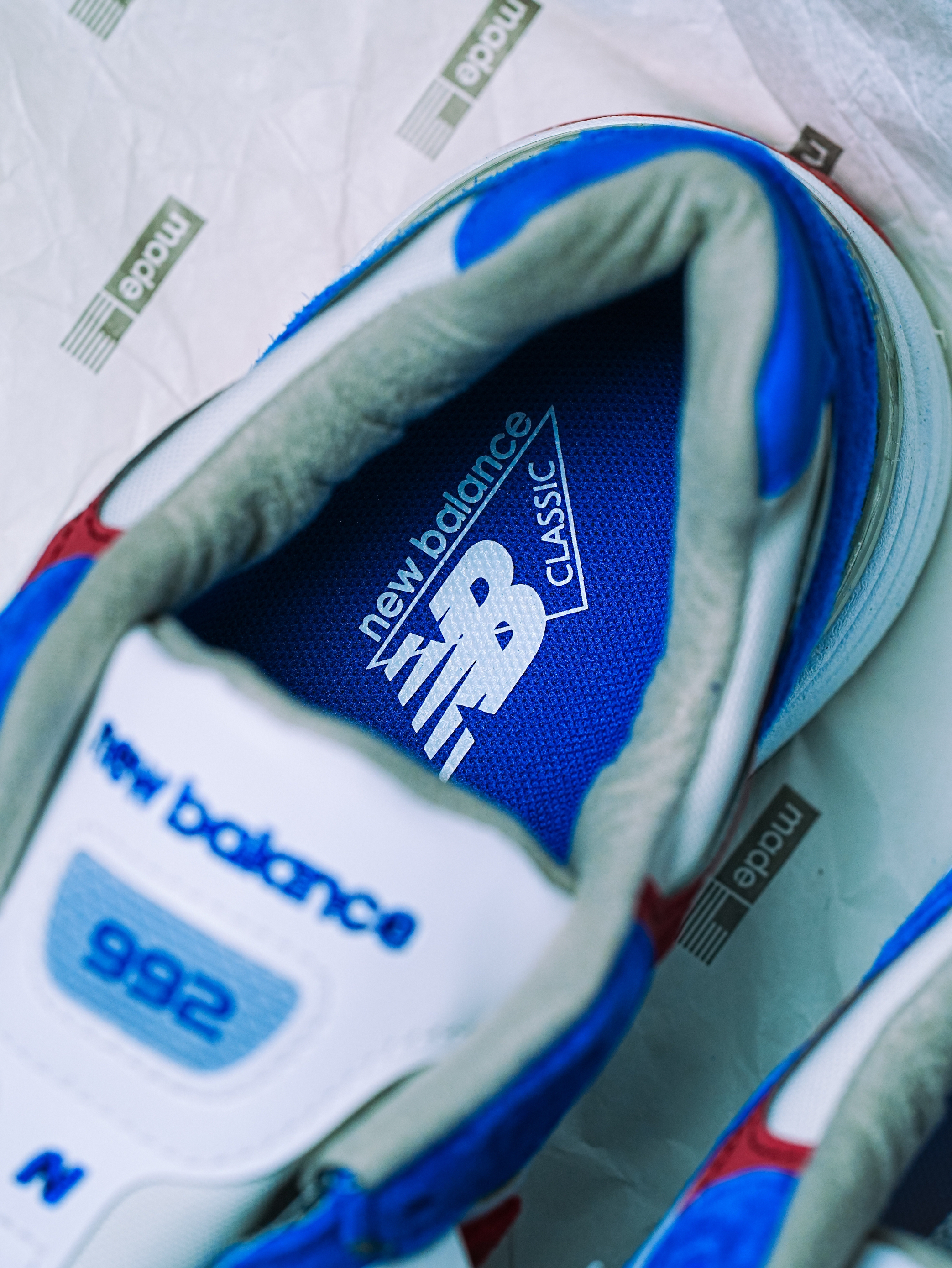 NB992是穿过一次就爱上的版型 蓝红白 很不New Balance的配色 整体外观复古又不显得违和~ 这颜值让我有点上头!! 鞋身麂皮与织物的组合,透气又舒适✌🏻 凹陷的船型鞋垫,包裹性极佳!٩(•̤̀ᵕ•̤́๑)ᵒᵏᵎᵎᵎᵎ 城市citywalk或是日常通勤穿搭都是ok的 尺码建议正码或大半码!!