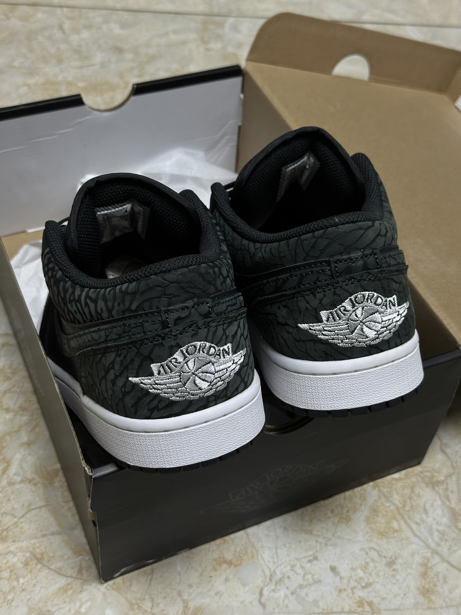 黑色鞋面的aj1每年都会有新款,这双的主要特点在鞋帮,爆裂纹的鞋帮设计让整双鞋增色不少。白色中底和白色后跟飞翼logo也让整体的配色更有层次,搭配起来更百搭一些
