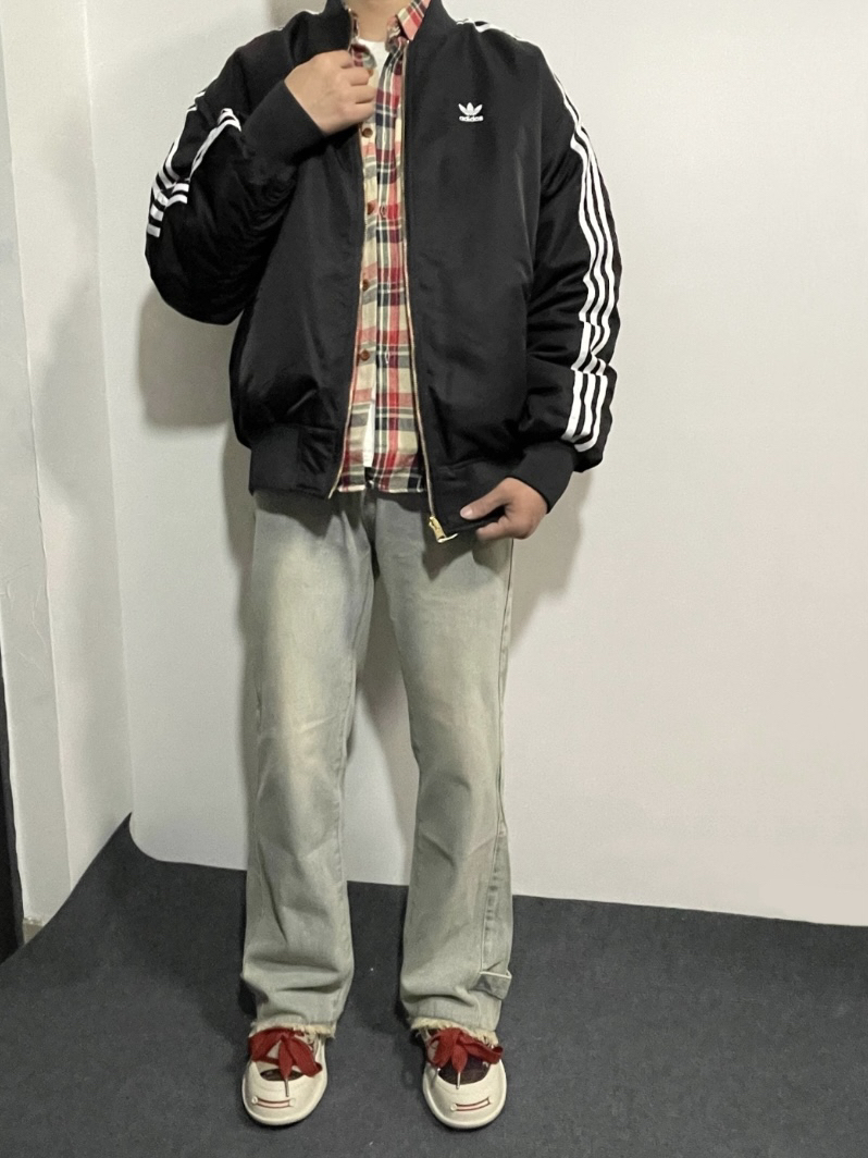 🕰️今天是一件撞色棒球服 三叶草的三条纹绝对是最经典的 颜色搭配也是很鲜 版型宽松穿着很舒服 ⚒️内搭一件多色格子衬衫 拉开对比增强视觉效果主体颜色 下身一条白色休闲裤 宽松有型 🎞️大口袋实用又很有设计感