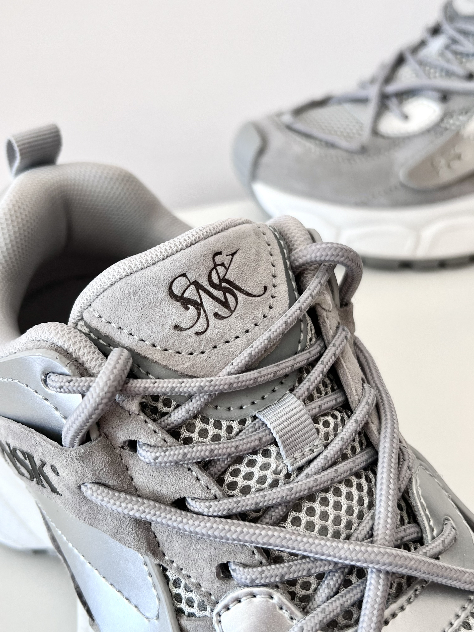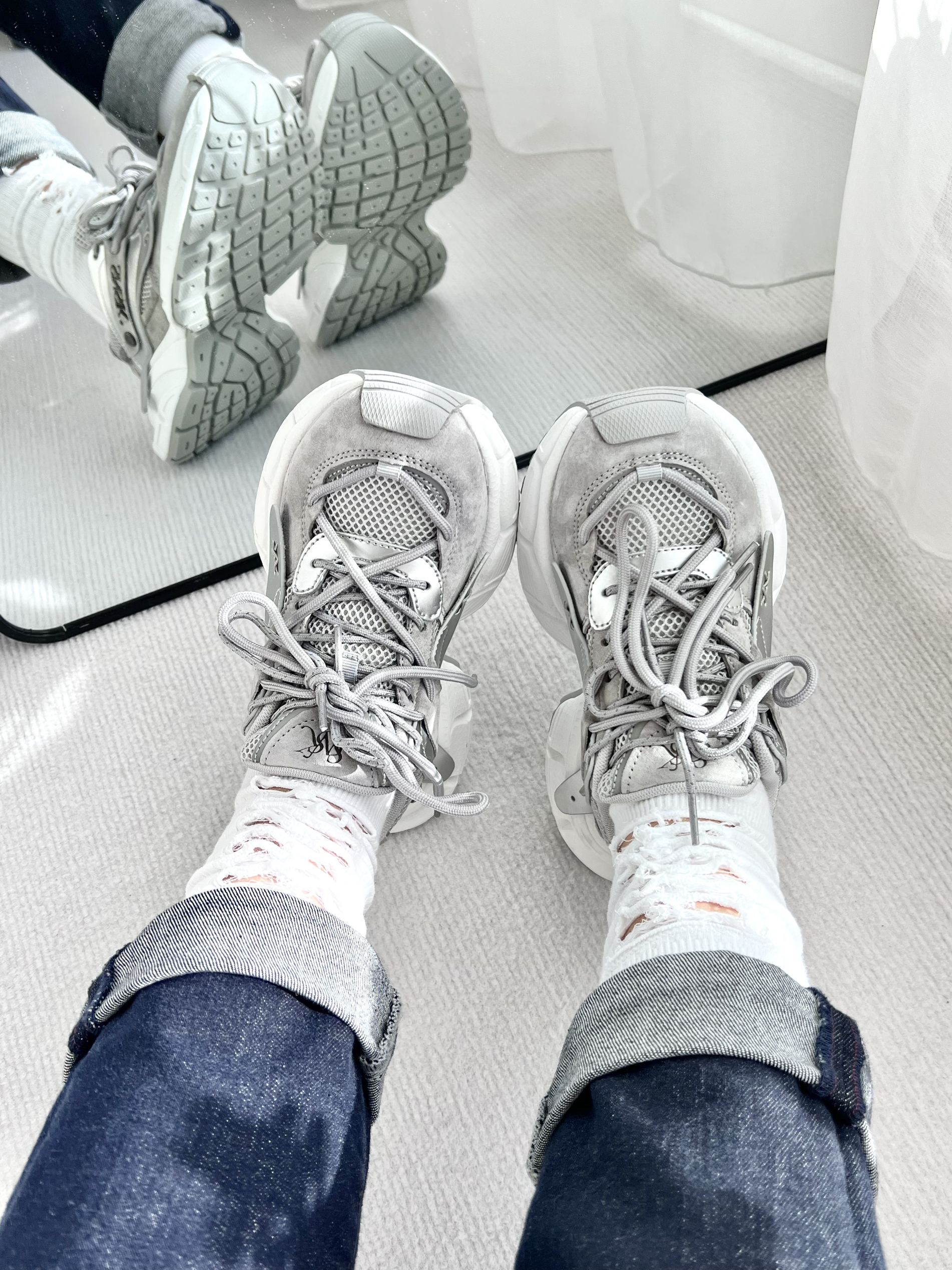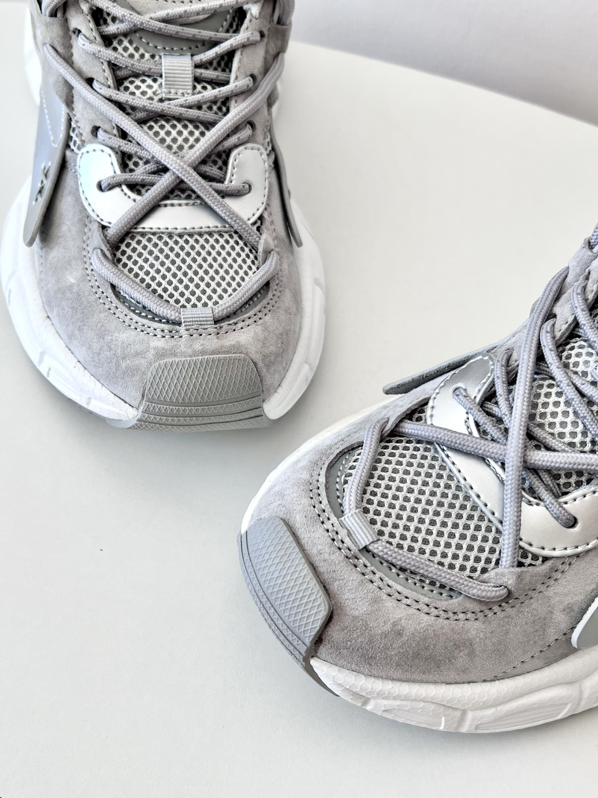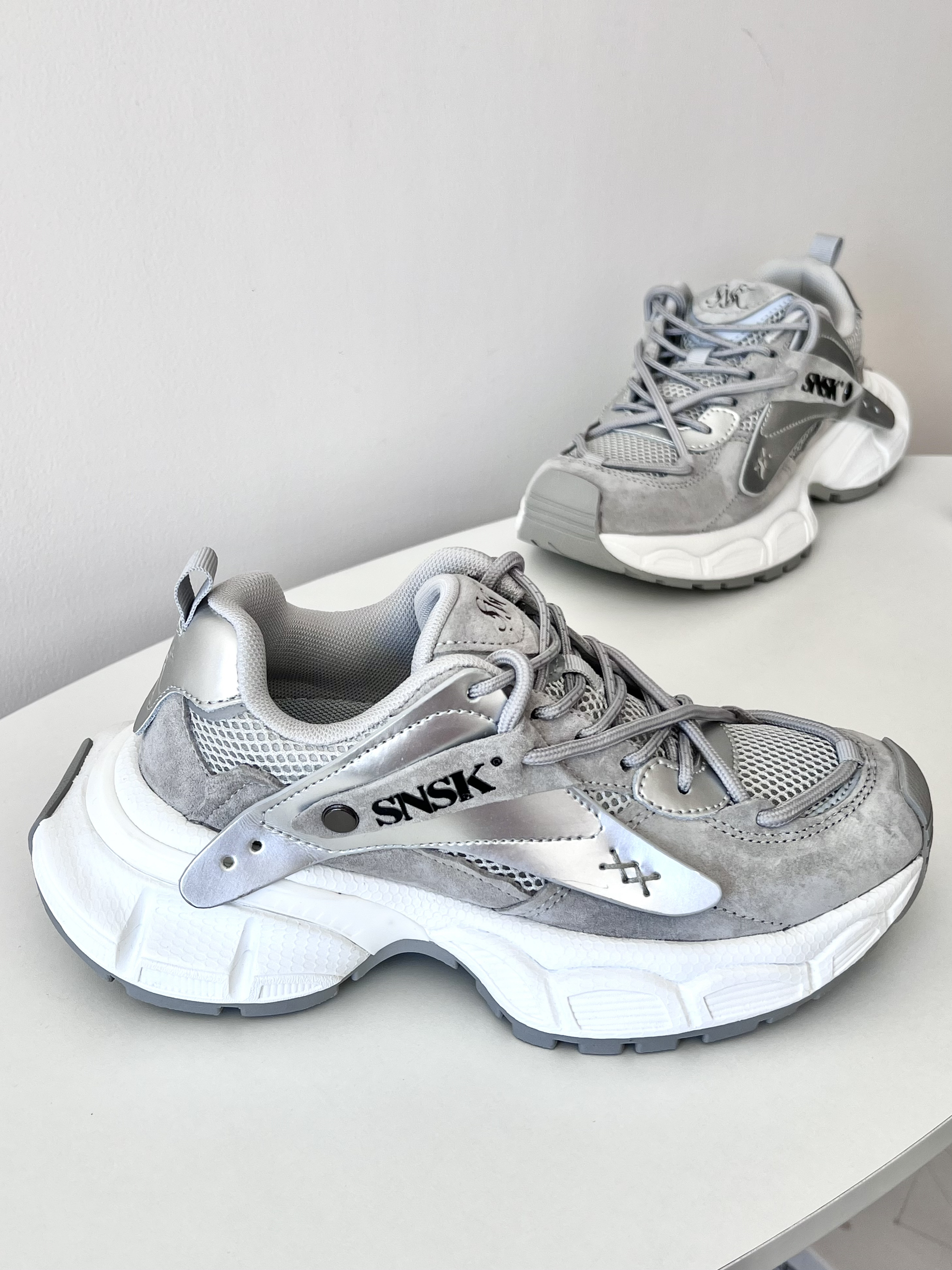 🍀今天开箱一双 SNSK 缓震防滑老爹鞋,灰色,男女同款👫 🍀设计亮点:太空银亮面皮革+麂皮+织物面料,富有层次感的设计,时尚度💯 🍀试穿感受: 厚底增高5厘米左右,上脚韧弹,显高显腿细; 百搭时尚,搭配牛仔裤工装裤都帅哦; 不偏码✅