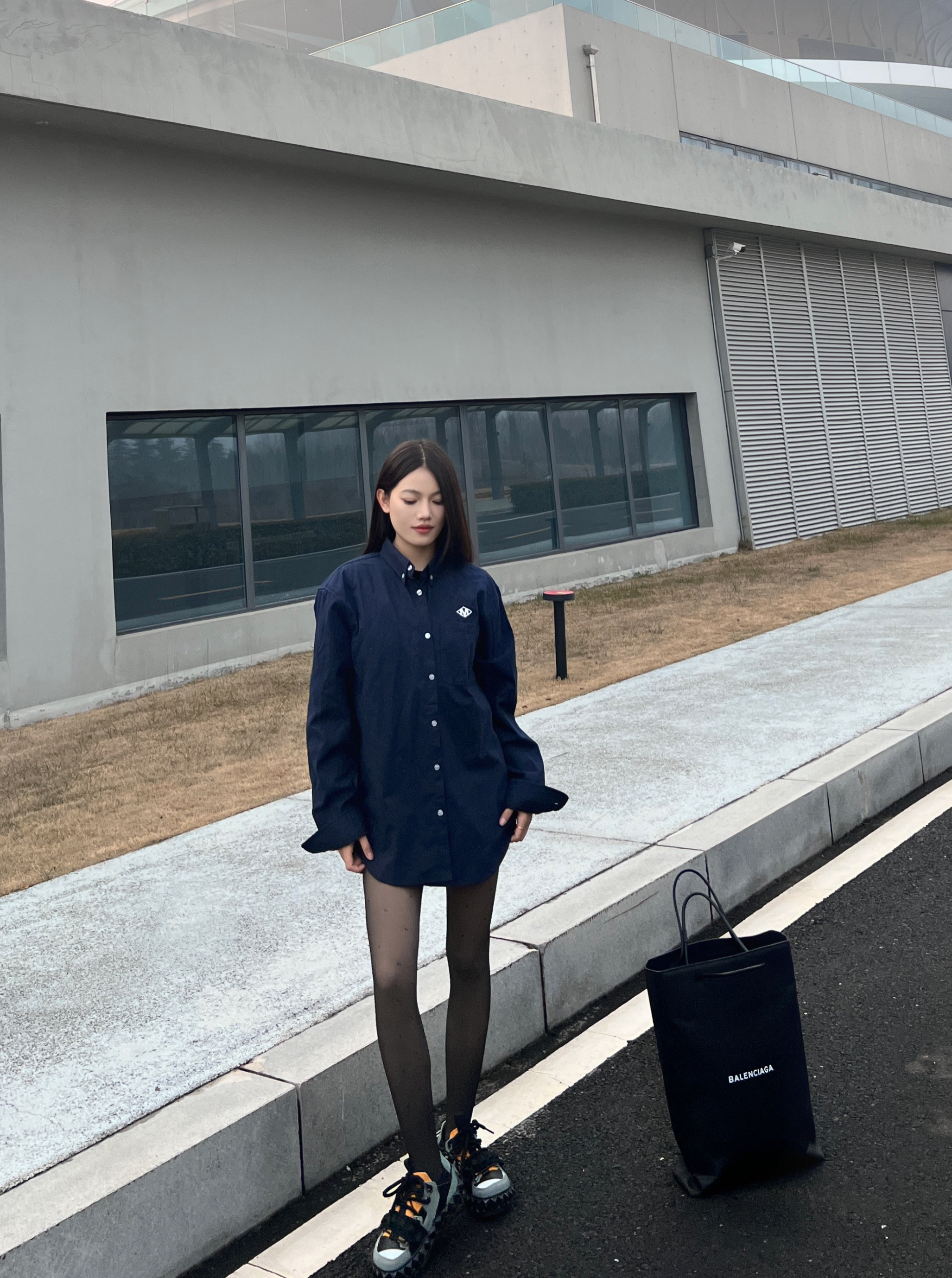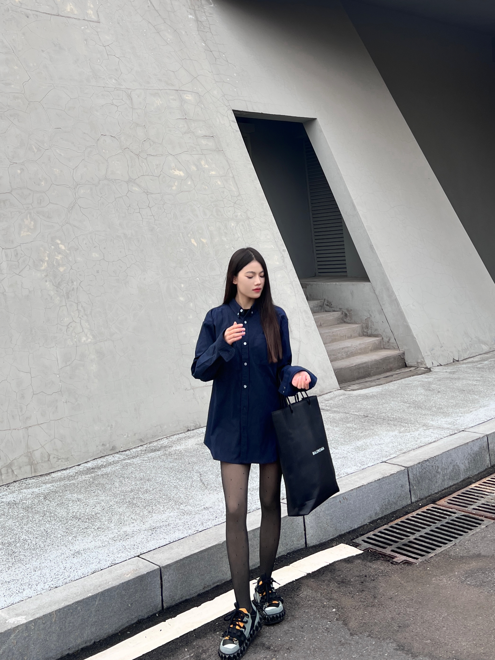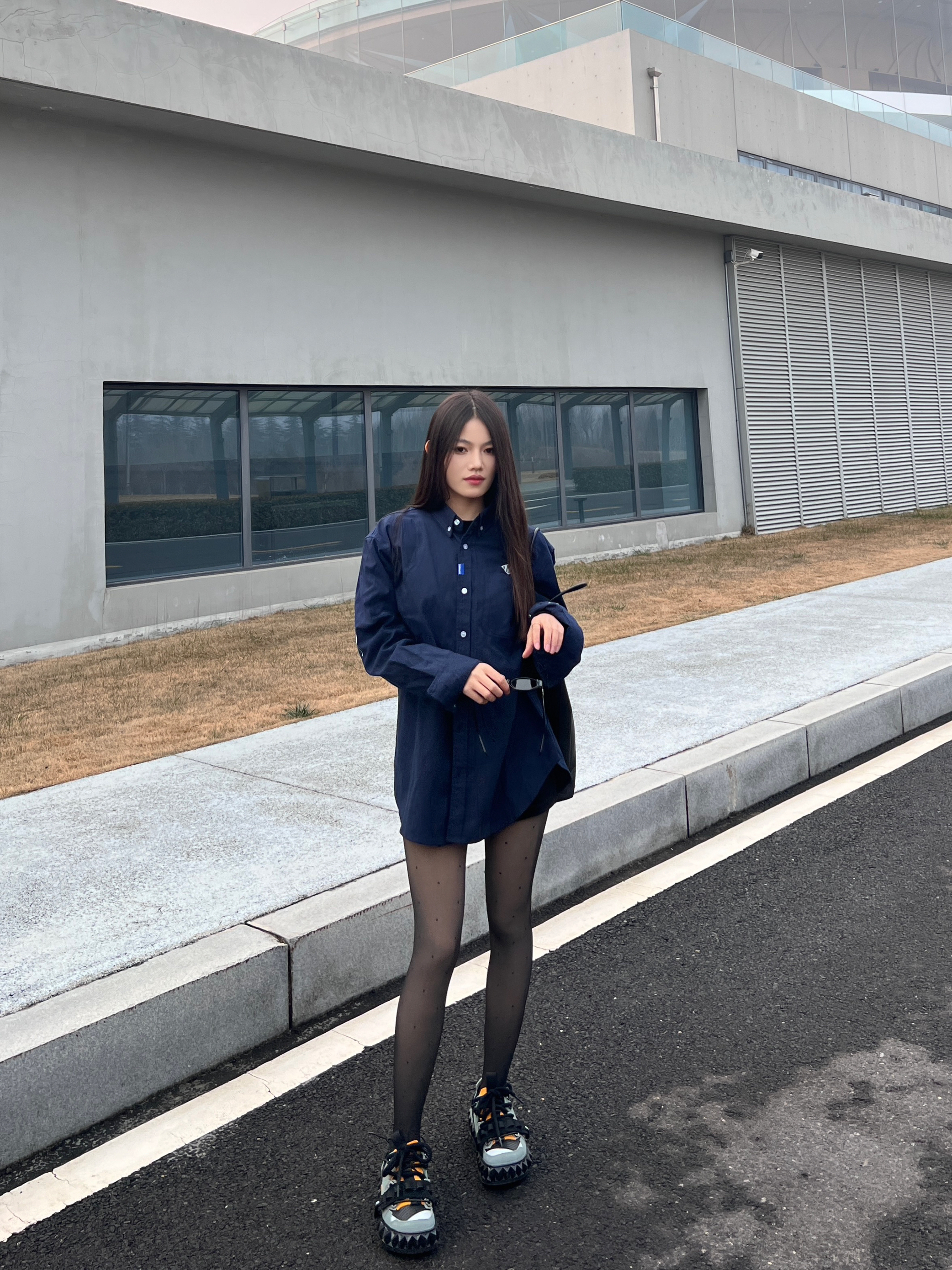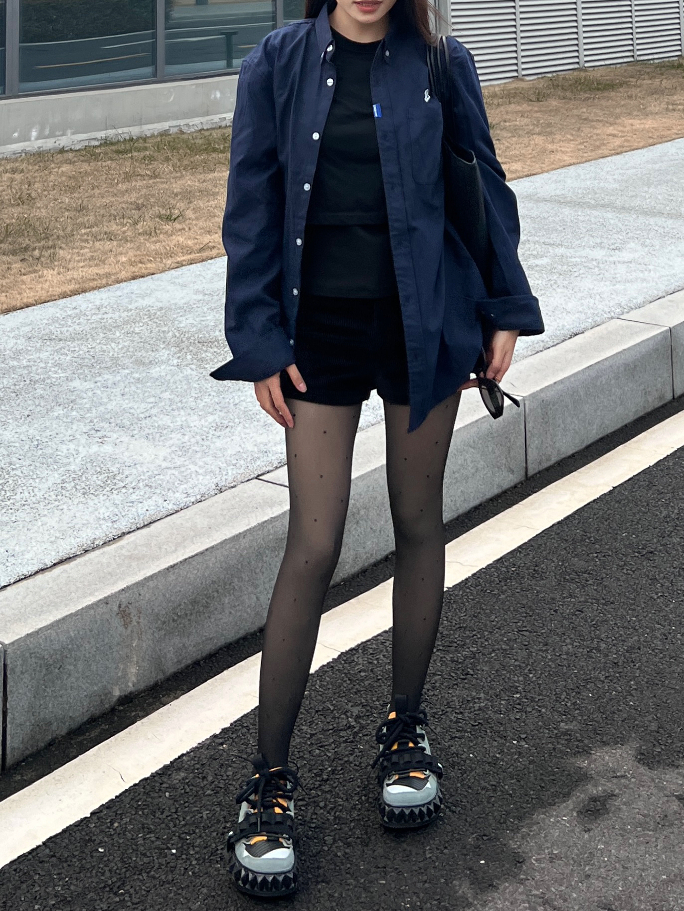今日份穿搭来喽~ 想要潮酷感十足不仅需要黑丝 还需要在鞋子上下功夫❗️ - 以今天的穿搭为例 藏蓝色休闲衬衫叠穿一件黑色内搭 同时在利用深色系营造碰撞感✔️ 选择一条波点黑丝 - 性感中还带有一丝俏皮 当然鞋子也狠重要❗️ 我选择的是 OETZI 家的丑萌鞋 黑色为基础色再加上军绿色和橙色的拼接设计 时尚的同时又增添了潮酷感❗️