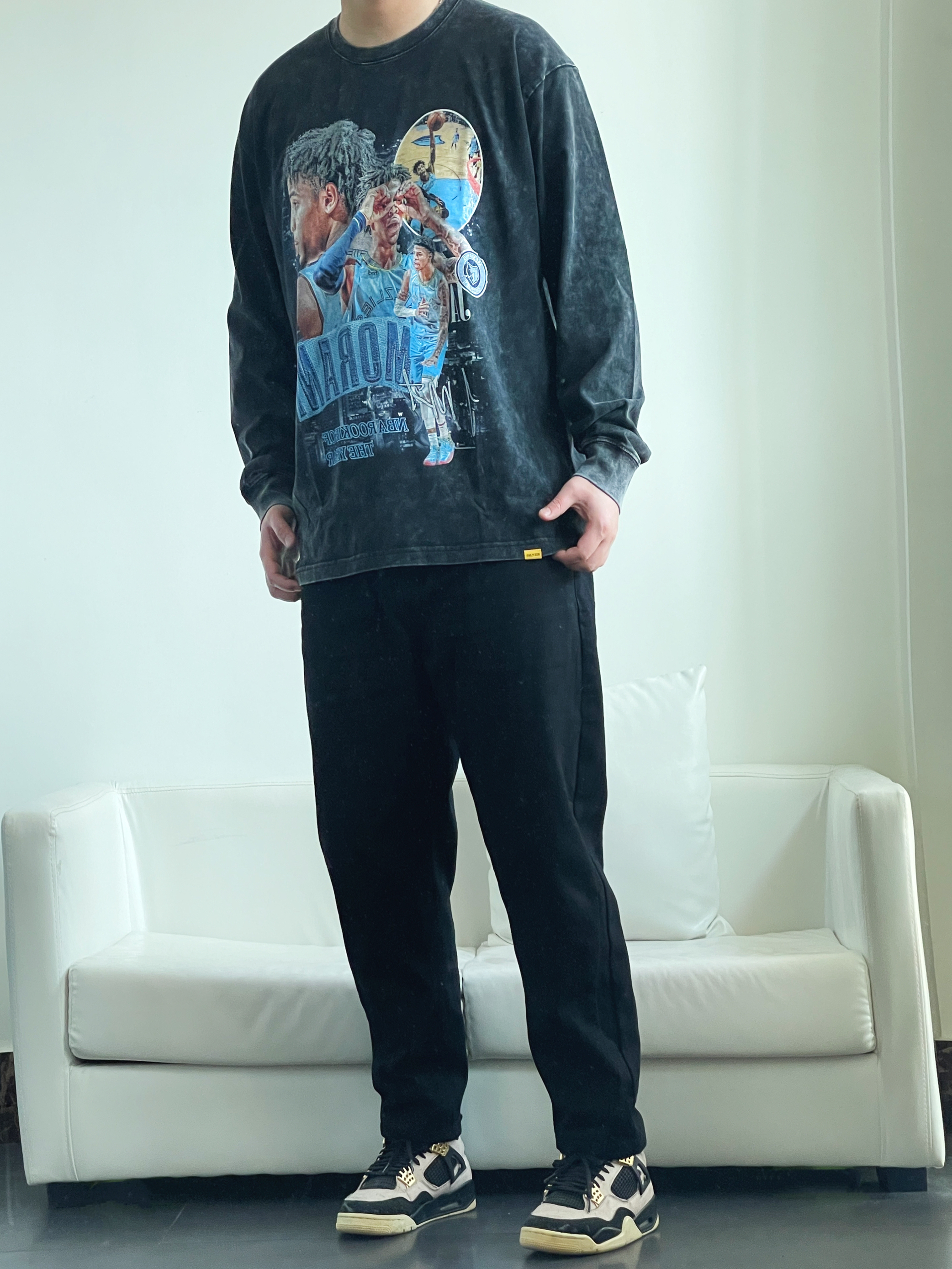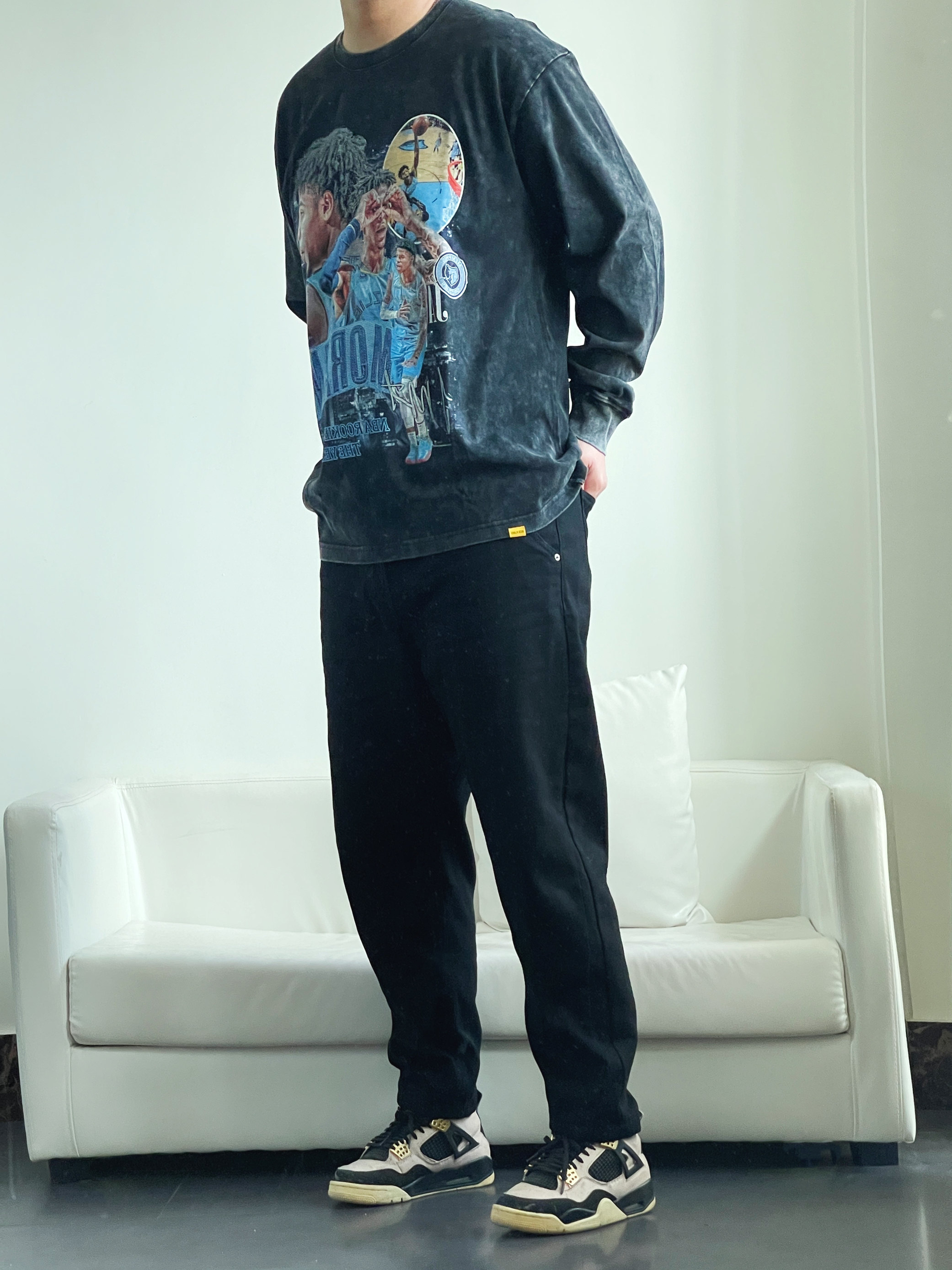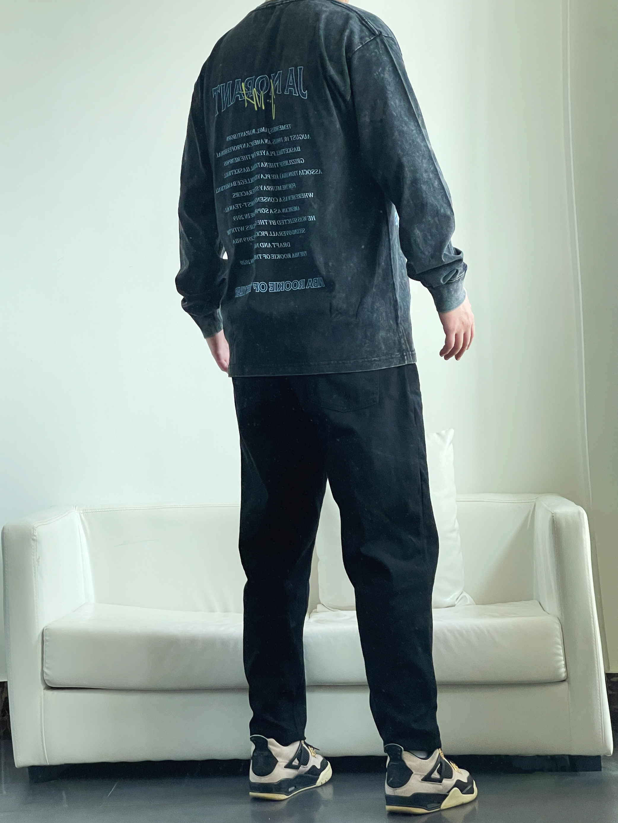 今日ootd分享 - 很喜欢的一件的水洗黑⚫️做旧街头风 这种质感就给人一种不羁 酷帅的感觉 再加上胸前独特的抽象式图案 背面字母印花 轻松搭配出美式街头感👦🏽 身高丨体重丨尺码 : 178丨90kg丨2XL 👔 摇滚计划 👖 Guur 👟 Nike